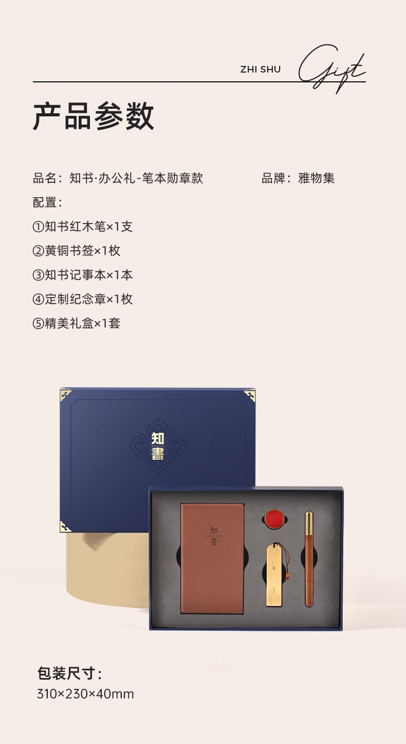 配置:①知书红木笔×1支 ②黄铜书签×1枚 ③知书记事本×1本 ④定制纪念章×1枚 ⑤精美礼盒×1套