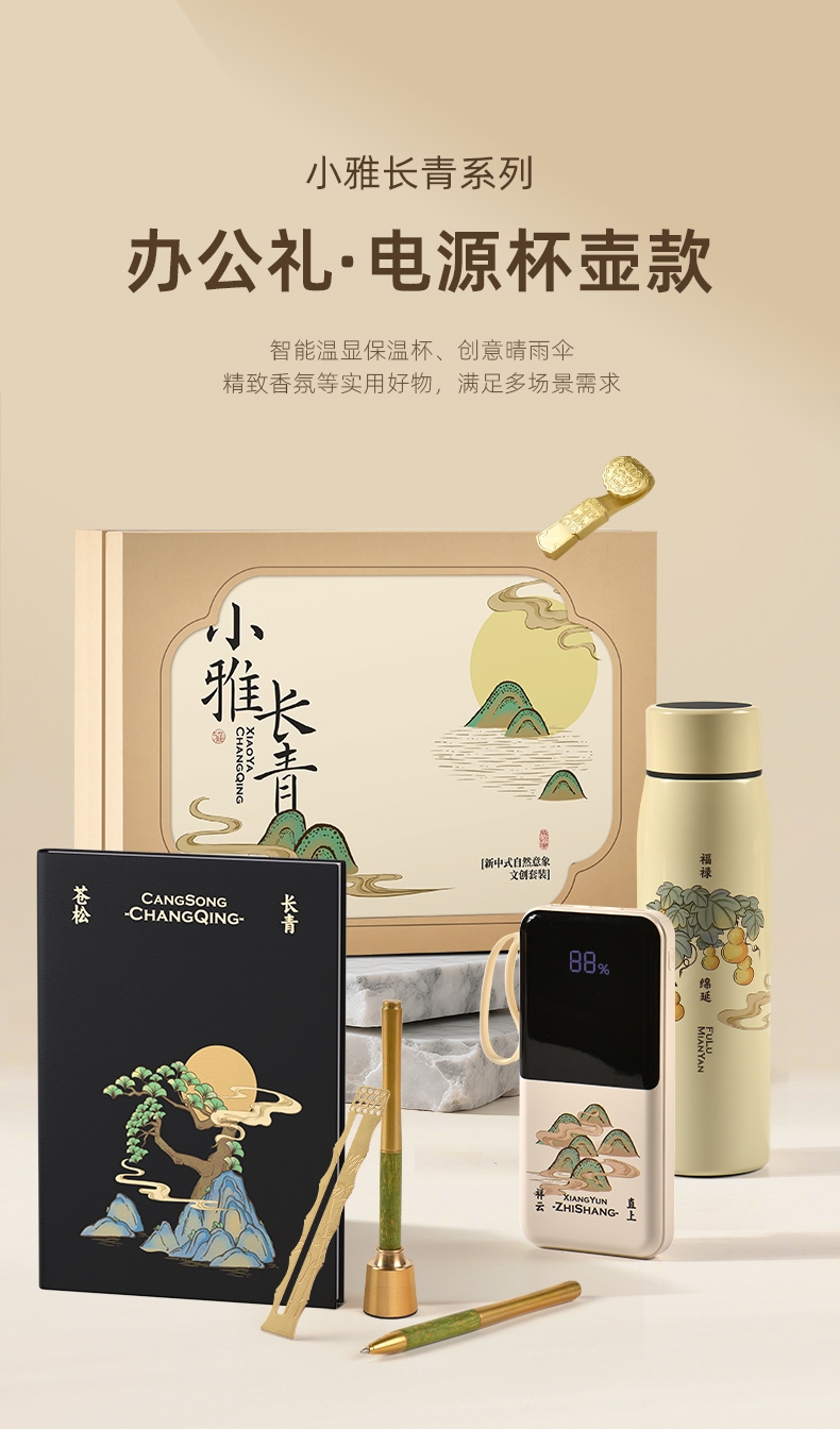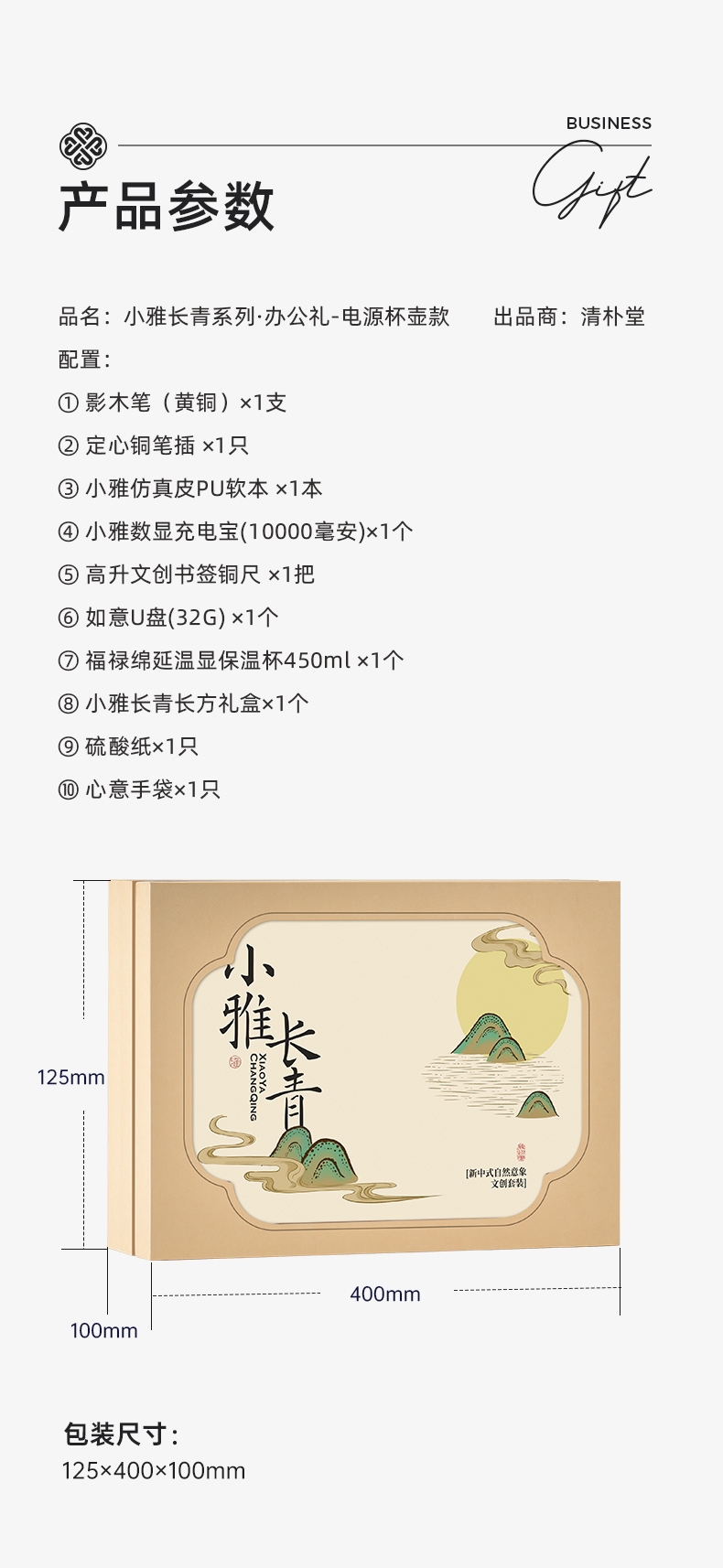 参数:① 影木·黄铜笔×1支 ② 定心·铜笔插 ×1个 ③ 小雅·PU本 ×1本 ④ 小雅·数显充电宝(1W毫安)×1个 ⑤ 高升·书签尺 ×1把 ⑥ 如意·U盘(32G) ×1个 ⑦ 福禄绵延·温显杯(450ml) ×1个 ⑧ 小雅·新中式礼盒手袋×1套