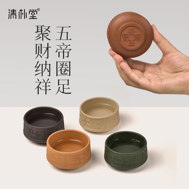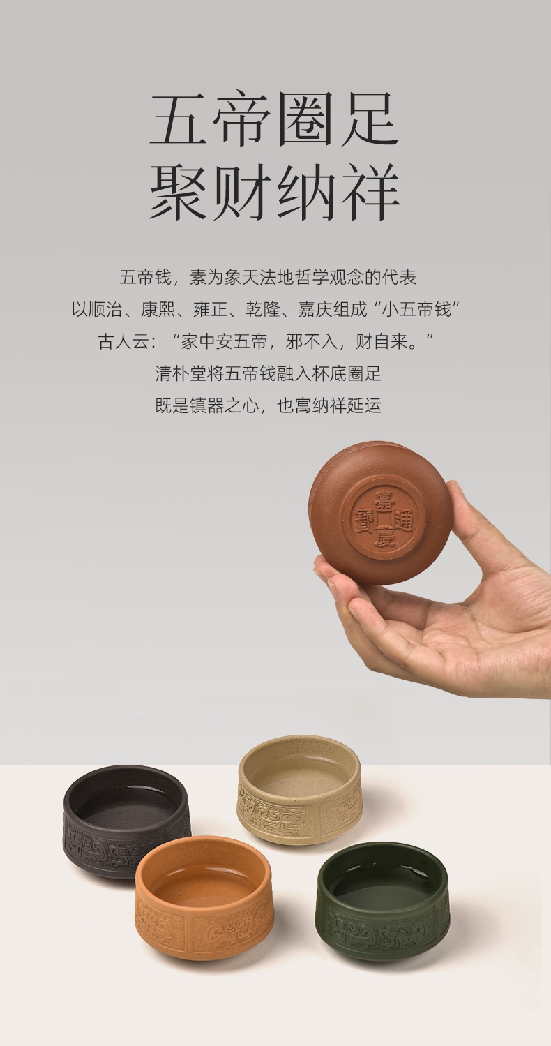 五帝铸钱,蕴帝王之威;五钱化杯,赠五湖知交;紫砂五帝杯,汇天下财气,有祈福、旺财之意;五帝杯汇天下财气 有祈福旺财之意