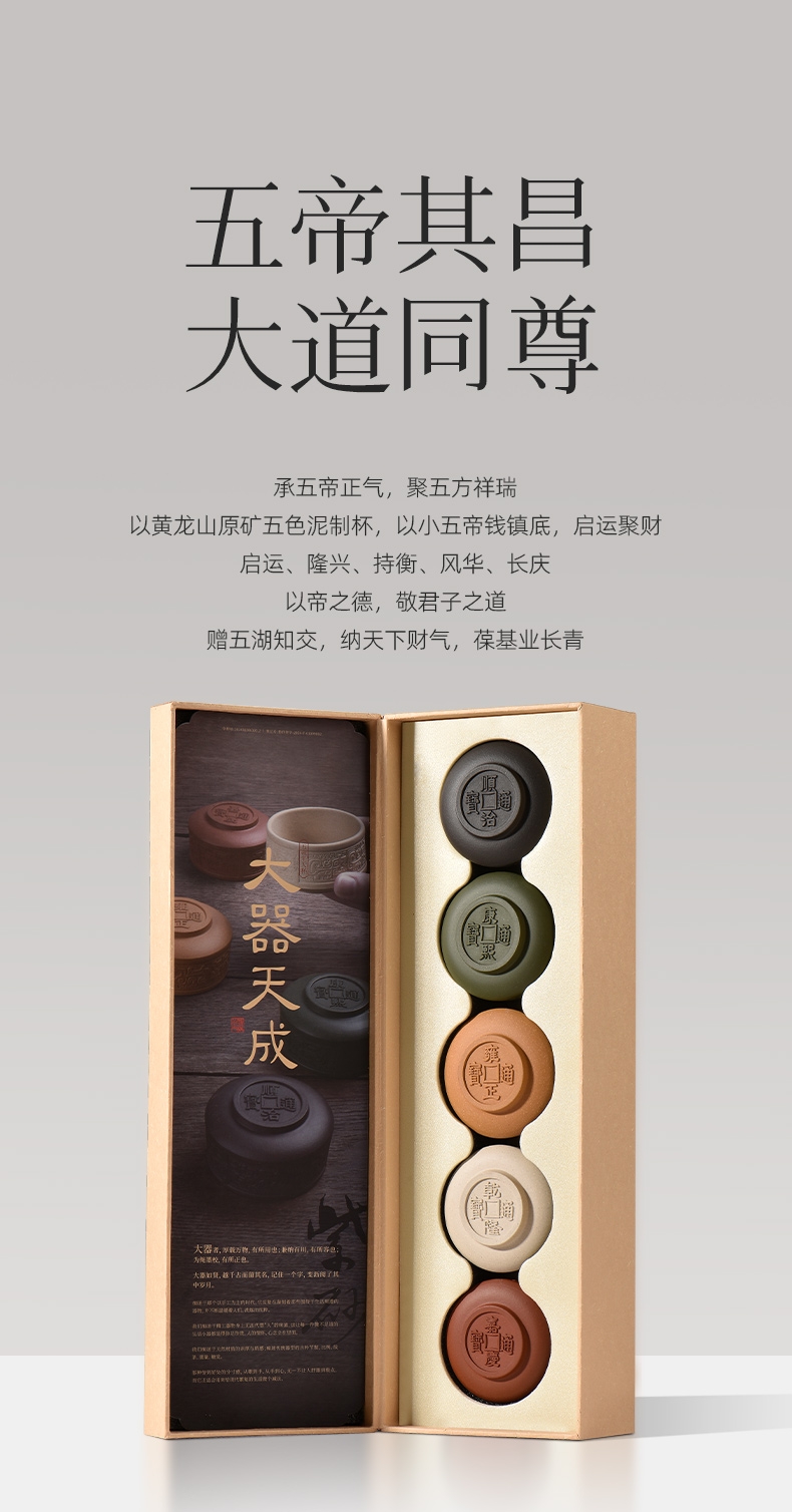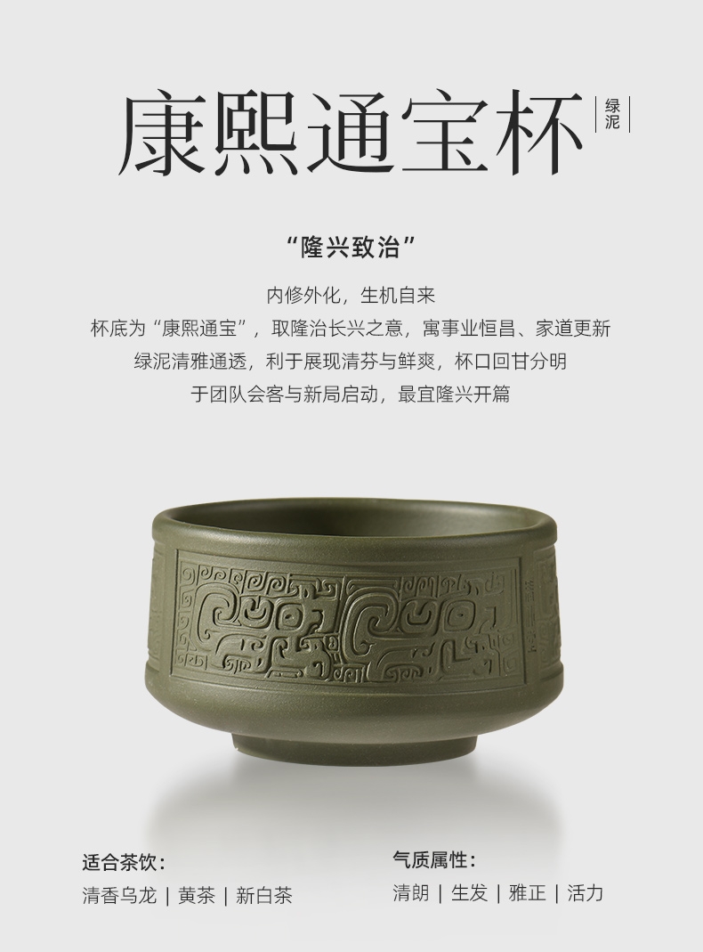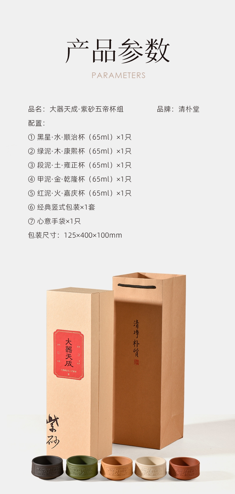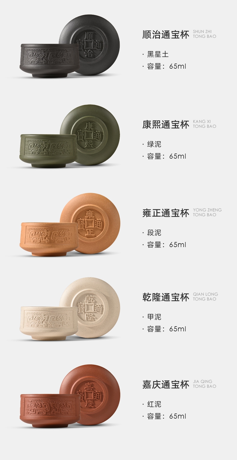 配置:① 顺治通宝杯-黑星(65ml)×1只 ② 康熙通宝杯-绿泥(65ml)×1只 ③ 雍正通宝杯-段泥(65ml)×1只 ④ 乾隆通宝杯-甲泥(65ml)×1只 ⑤ 嘉庆通宝杯-红泥(65ml)×1只 ⑥ 经典礼盒手袋×1套