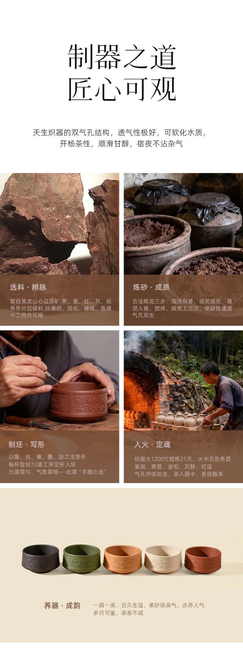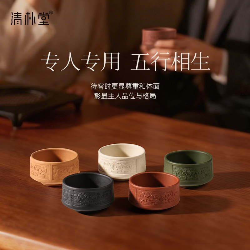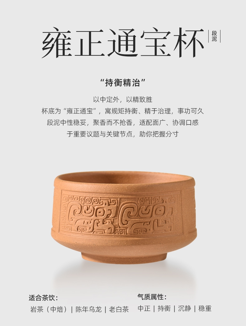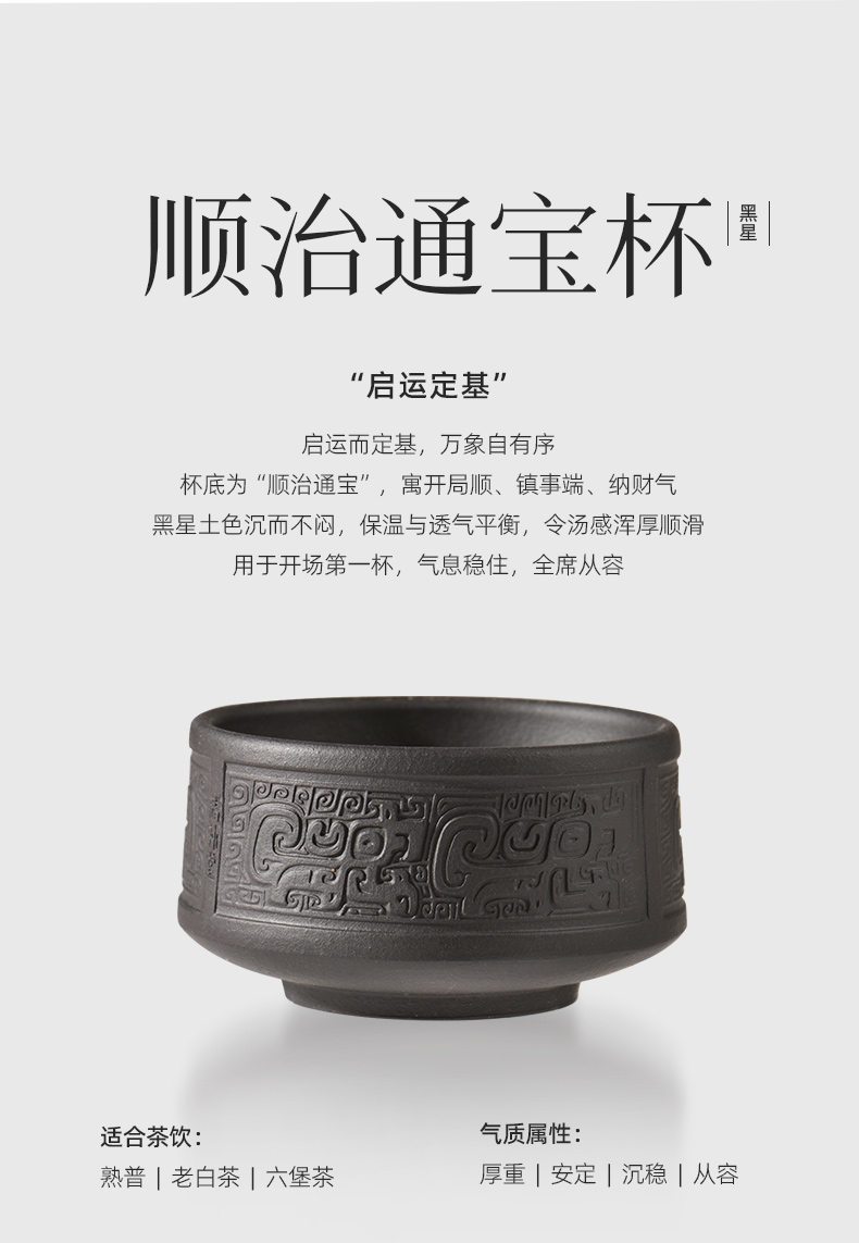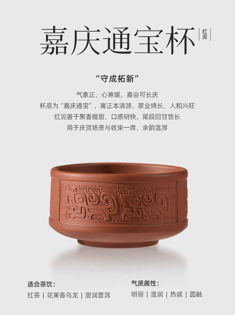 配置:① 顺治通宝杯-黑星(65ml)×1只 ② 康熙通宝杯-绿泥(65ml)×1只 ③ 雍正通宝杯-段泥(65ml)×1只 ④ 乾隆通宝杯-甲泥(65ml)×1只 ⑤ 嘉庆通宝杯-红泥(65ml)×1只 ⑥ 经典礼盒手袋×1套