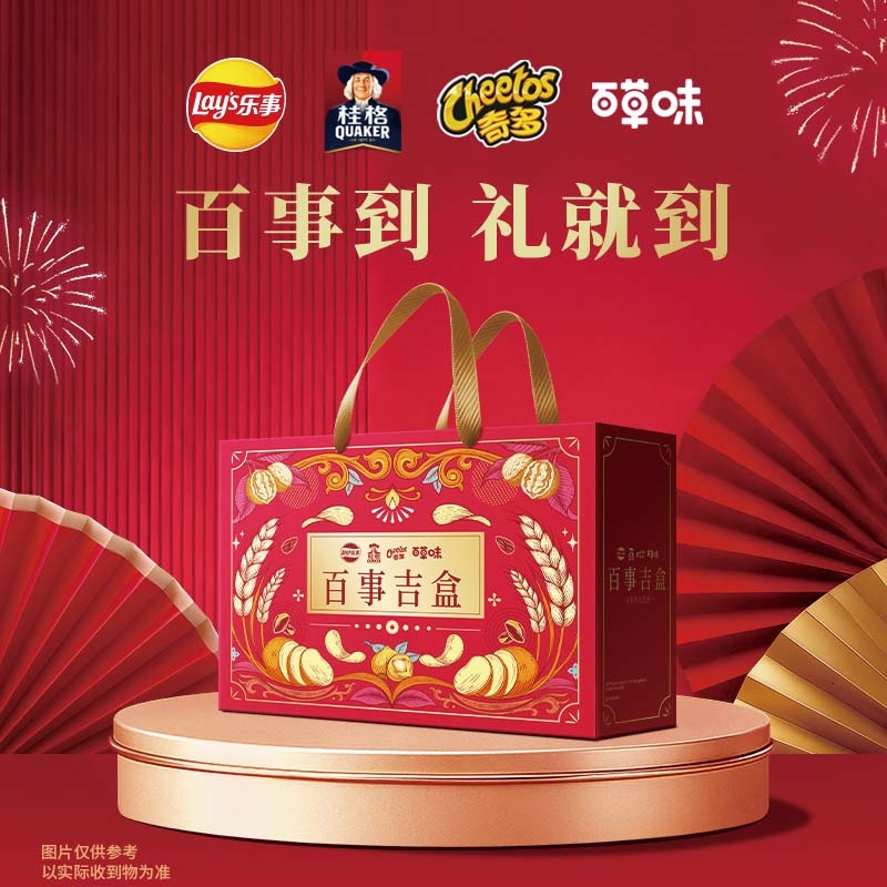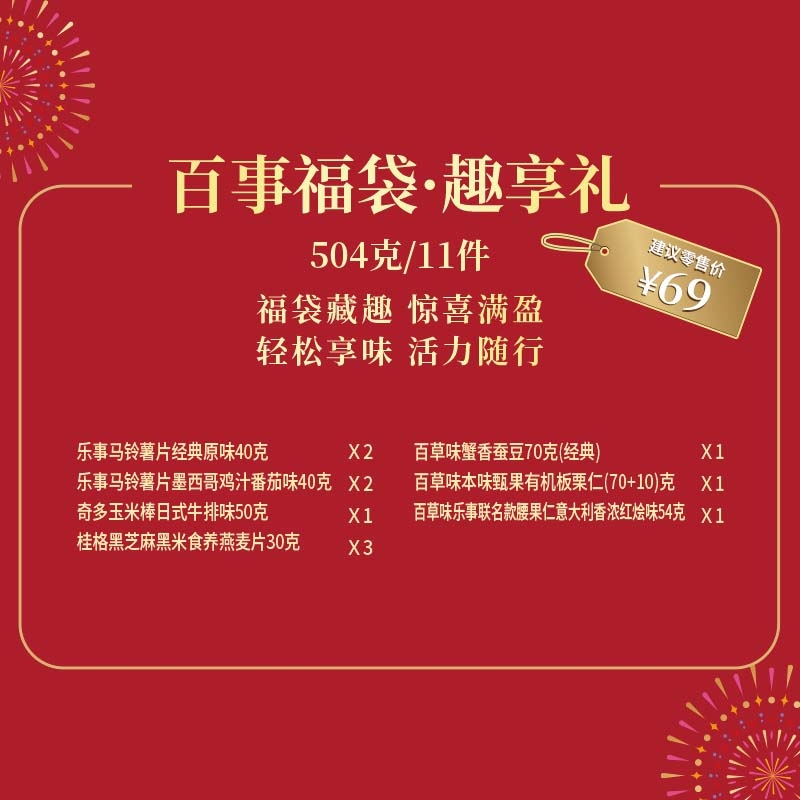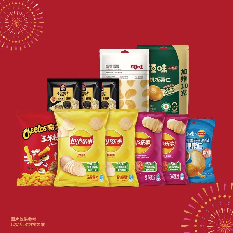 配置清单:1 X 乐事经典原味40克 1 X 乐事经典原味40克 1 X 乐事墨西哥鸡汁番茄味40克 1 X 乐事墨西哥鸡汁番茄味40克 1 X 奇多日式牛排味50克 1 X 桂格黑芝麻黑米食养燕麦片30克 1 X 桂格黑芝麻黑米食养燕麦片30克 1 X 桂格黑芝麻黑米食养燕麦片30克 1 X 百草味蟹香蚕豆70克(经典) 1 X 百草味本味甄果有机板栗仁(70+10)克 1 X 百草味乐事联名款腰果仁意大利香浓红烩味54克 赠品:乐事春联福字贴
