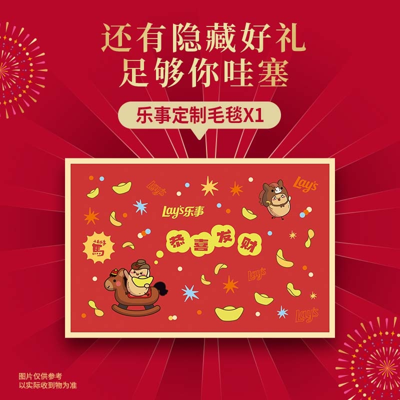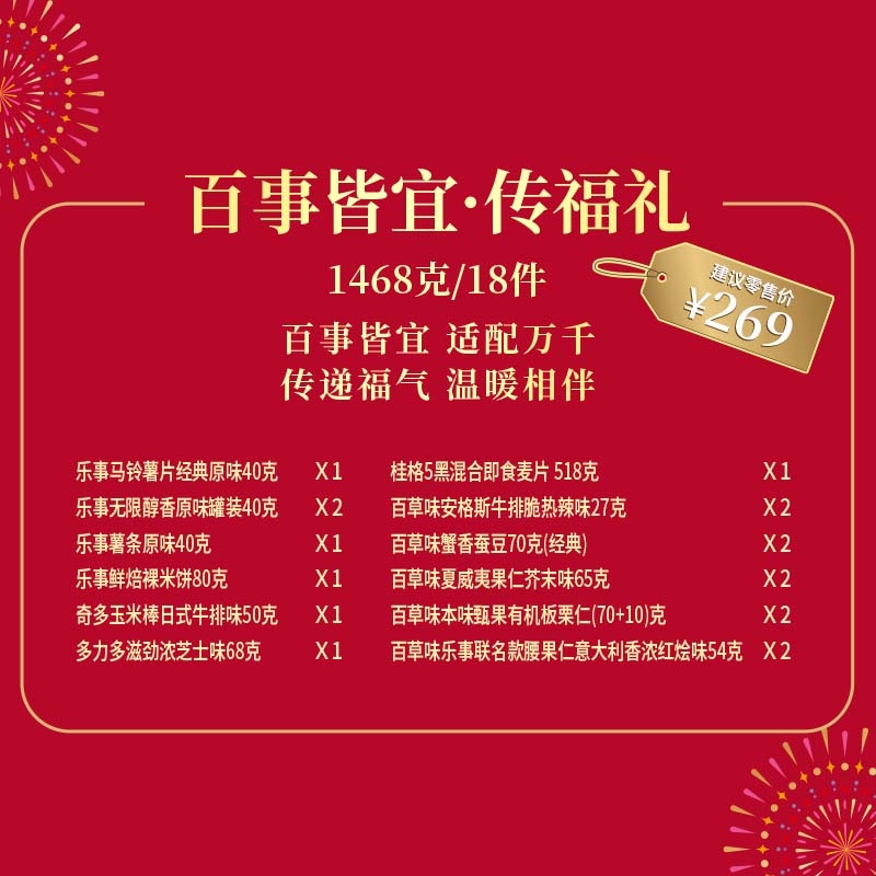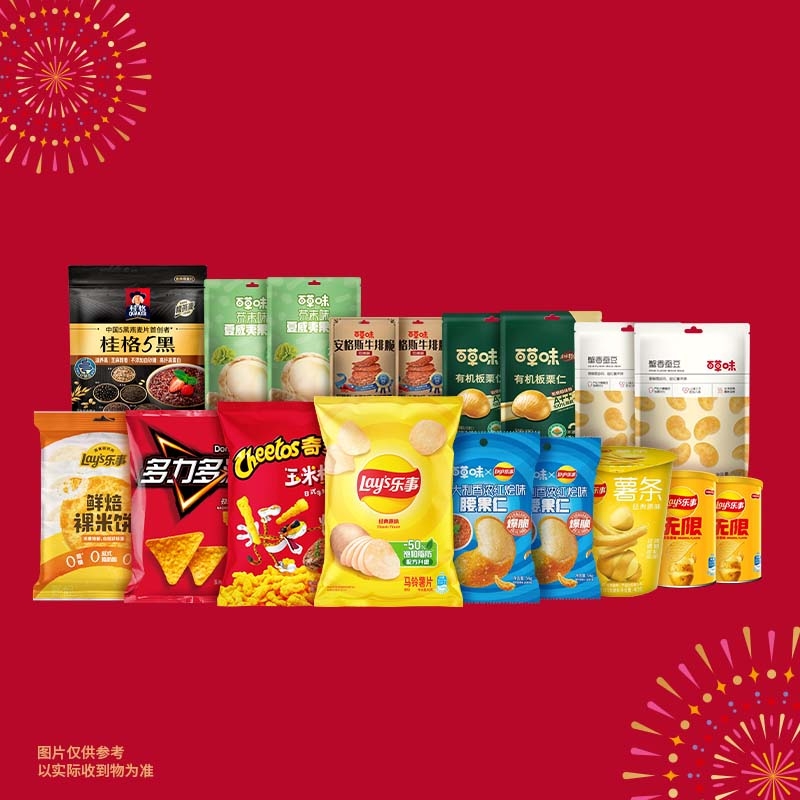 配置清单:1 X 乐事经典原味40克 2 X 乐事无限醇香原味罐装40克 1 X 乐事薯条原味40克 1 X 乐事鲜焙裸米饼80克 1 X 奇多日式牛排味50克 1 X 多力多滋劲浓芝士味68克 1 X 桂格5黑混合即食麦片 518克 2 X 百草味安格斯牛排脆热辣味27克 2 X 百草味蟹香蚕豆70克(经典) 2 X 百草味夏威夷果仁芥末味65克 2 X 百草味本味甄果有机板栗仁(70+10)克 2 X 百草味乐事联名款腰果仁意大利香浓红烩味54克 赠品:定制毛毯