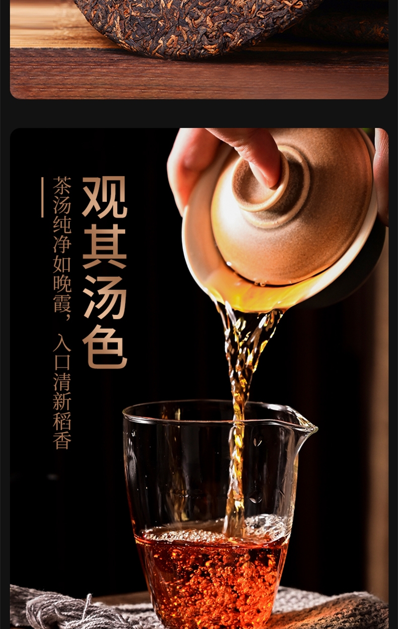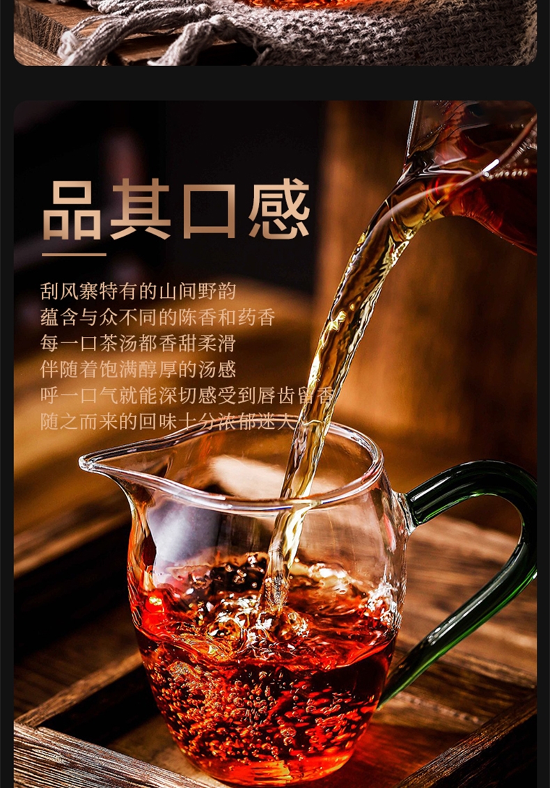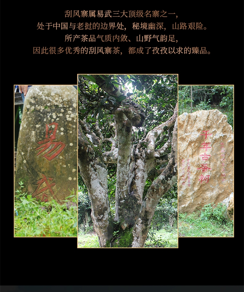 云南易武:古六大茶山之首,刮风寨属易武三大顶级之一;饼面匀整,条索深褐,泛油润,越喝越甜,越喝越有;千年古茶树,茶品气质内敛,山野气韵足