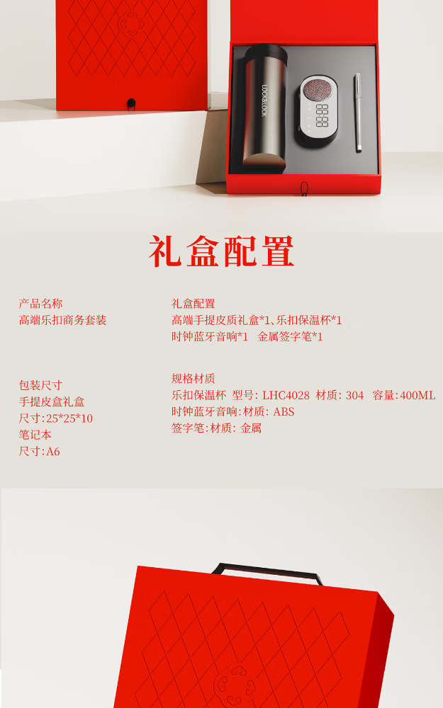 配置清单:高端手提皮质礼盒*1、乐扣保温杯*1时钟蓝牙音响*1 金属签字笔*1