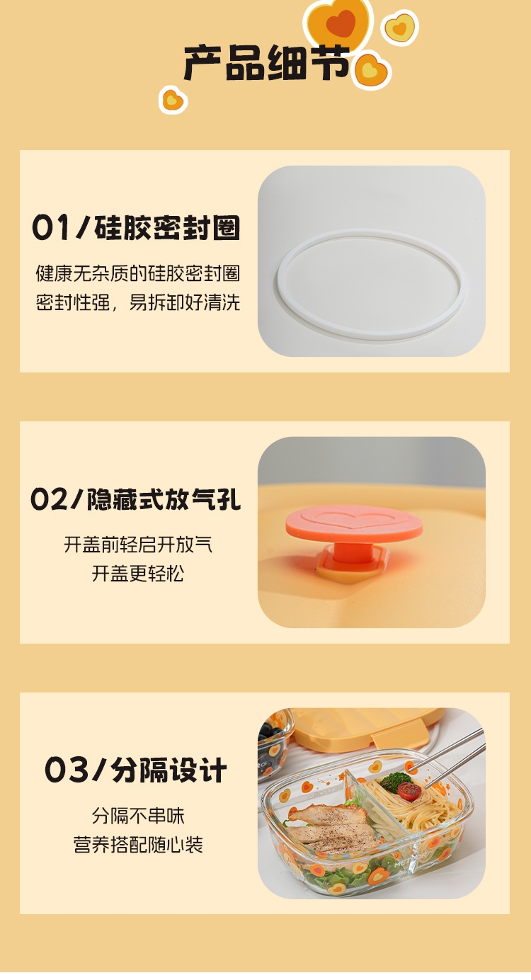 硅胶圈+锁扣设计,日常携带汤汁无压力;高硼硅玻璃材质;开盖前轻启开放气,开盖更轻松