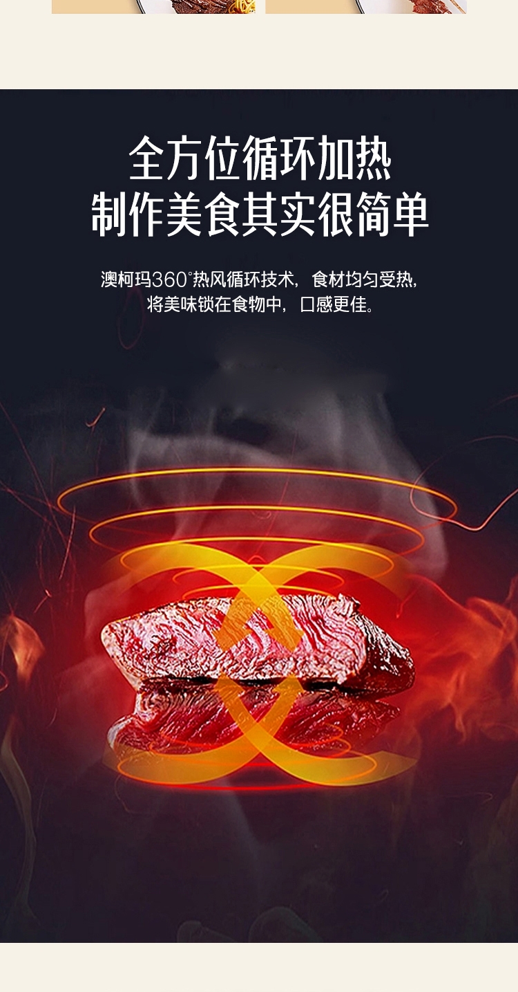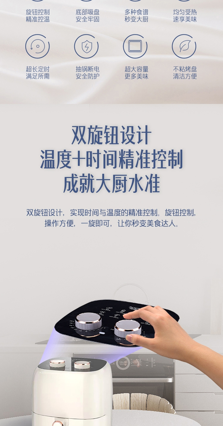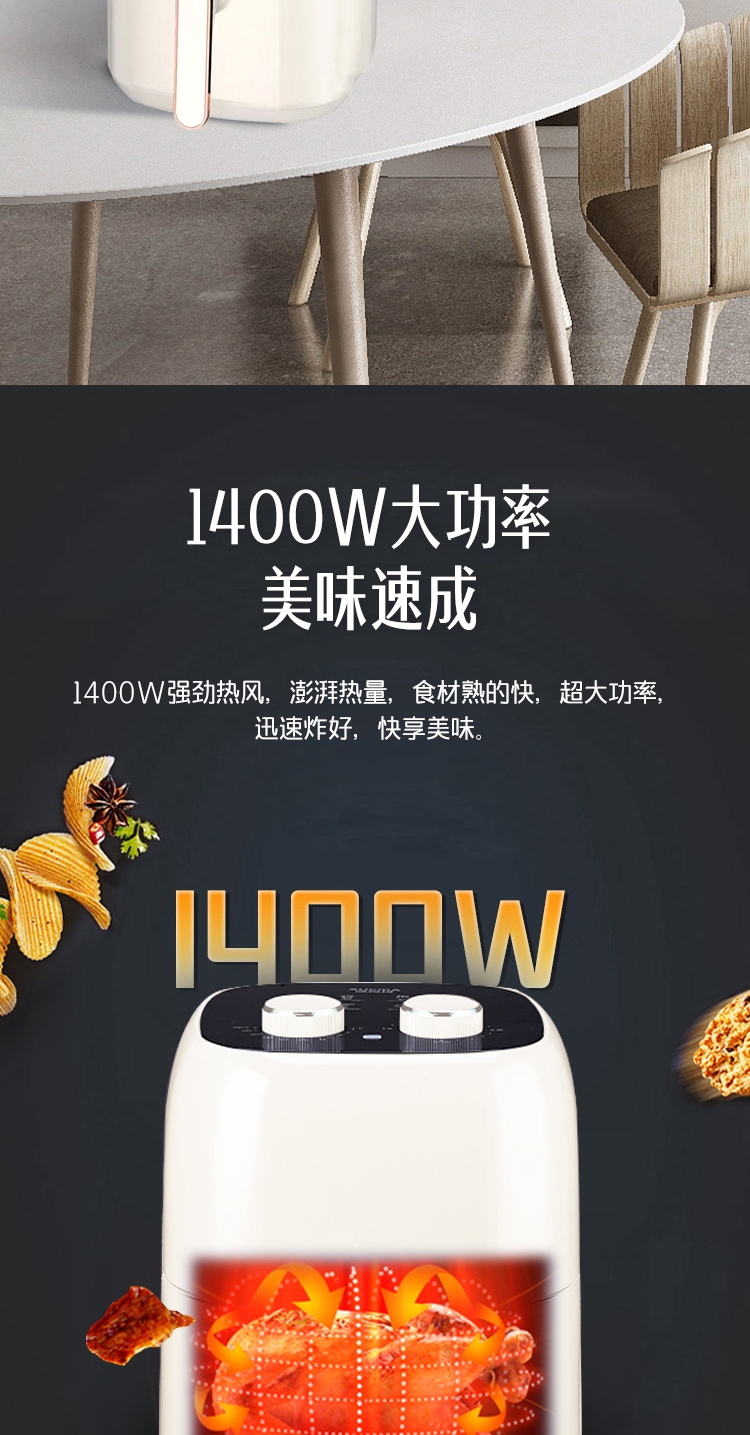 双旋钮设计温度+时间精准控制成就大厨水准;1400W强劲热风,澎湃热量,食材熟的快,超大功率;360°热风循环技术,食材均匀受热:将美味锁在食物
