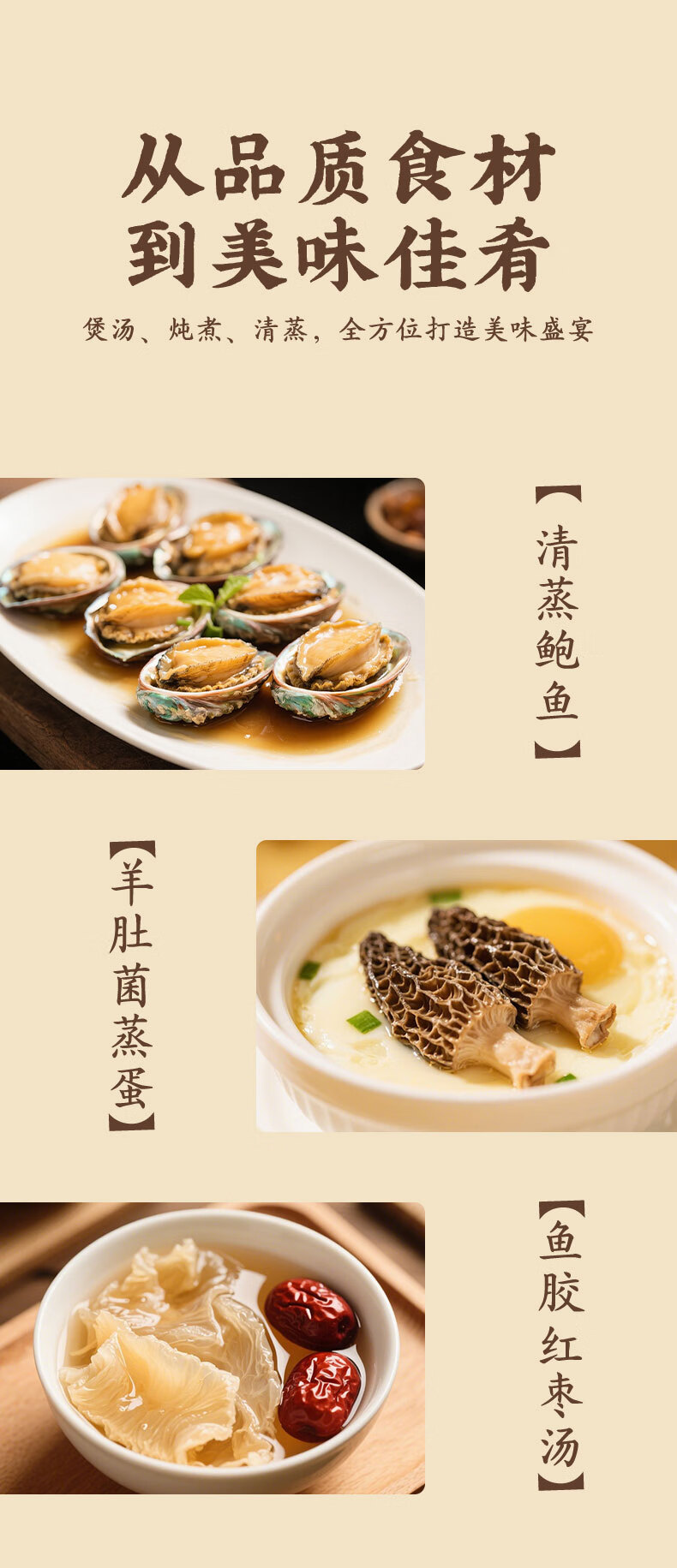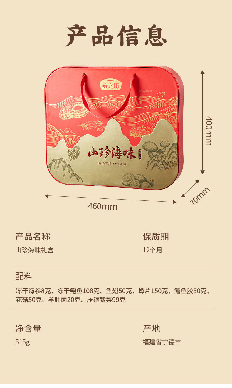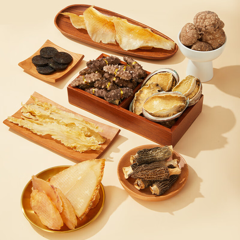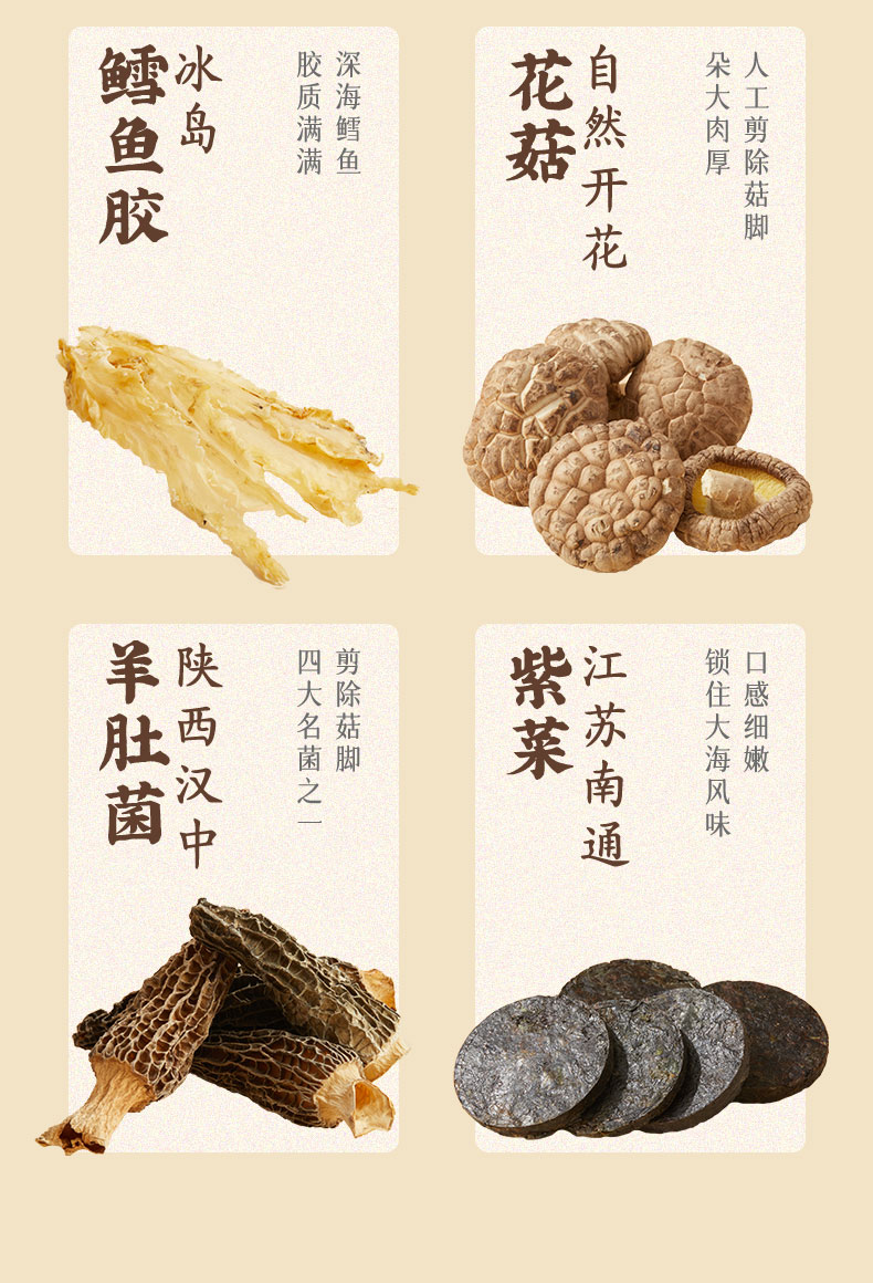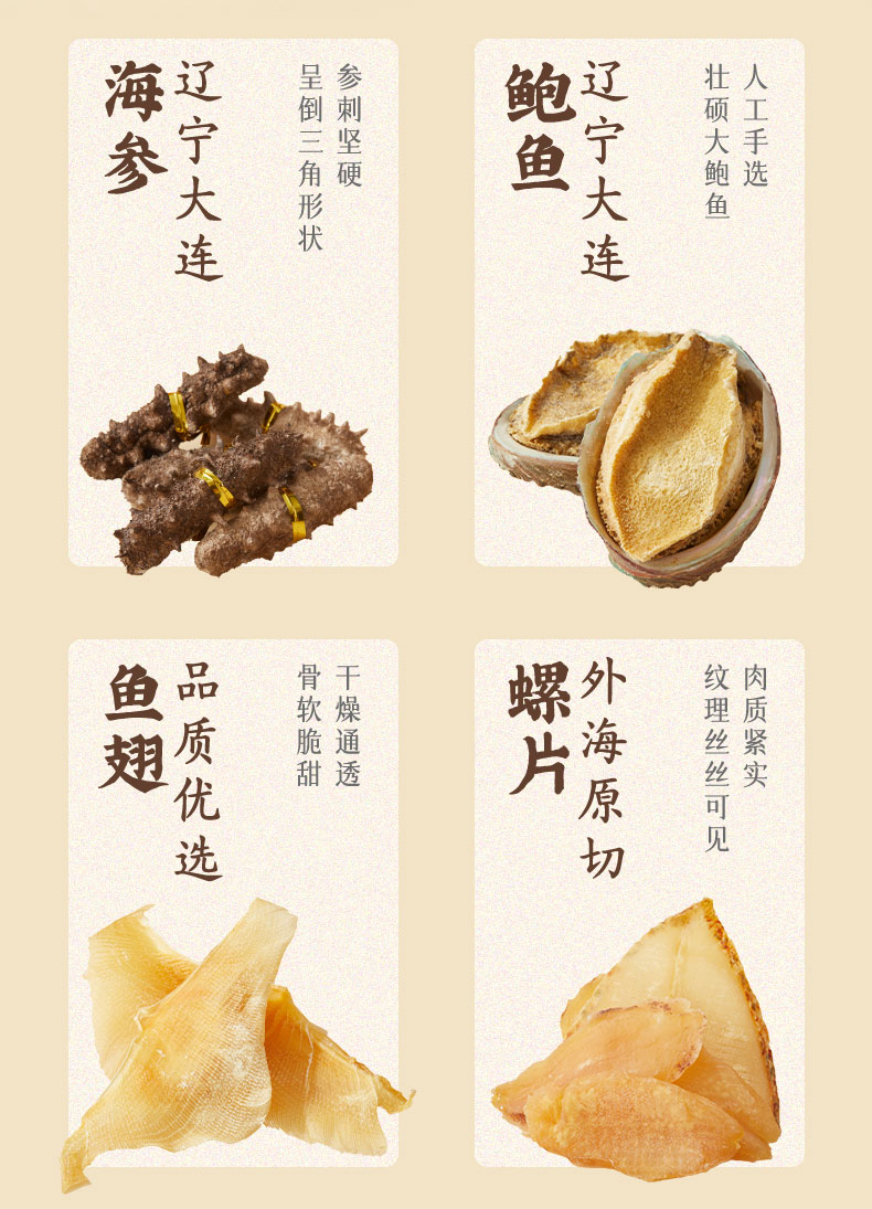配置:冻干海参8克 冻干鲍鱼108克 鱼翅50克 螺片150克 鳕鱼胶30克 花菇50克 羊肚菌20克 内赠:紫菜99克