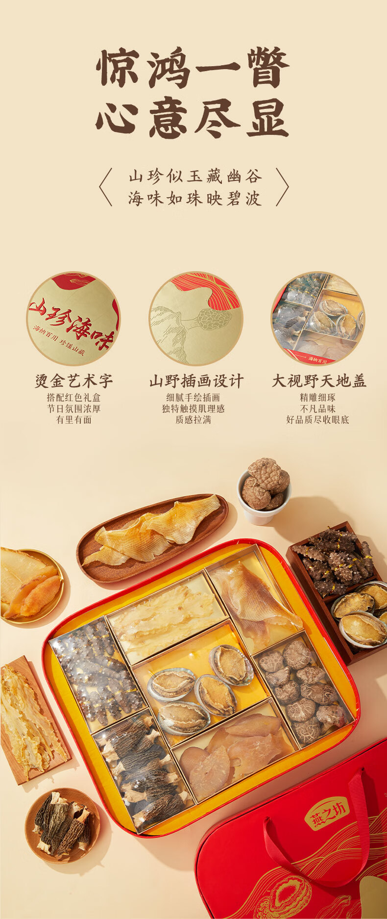八味佳品,齐聚山珍海味;山海赋韵,精致烫金礼盒;礼承东方,敬献诚挚心意