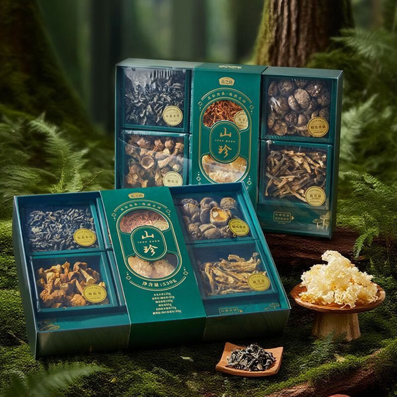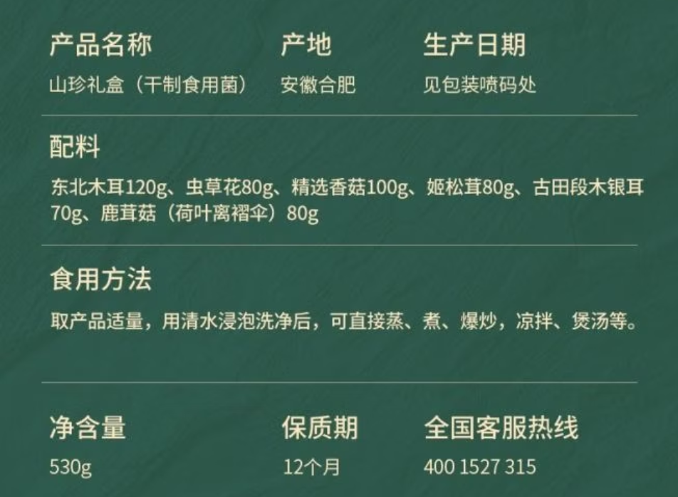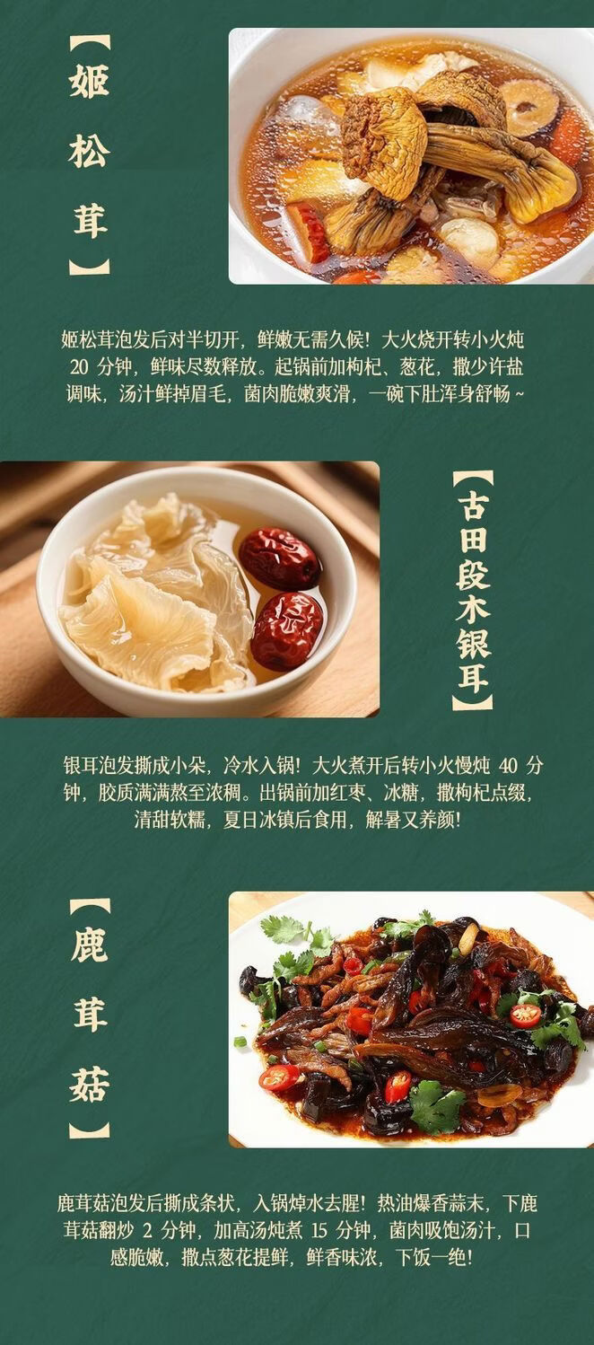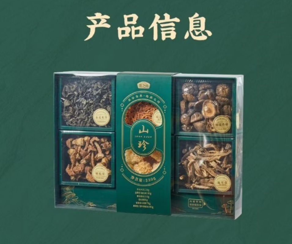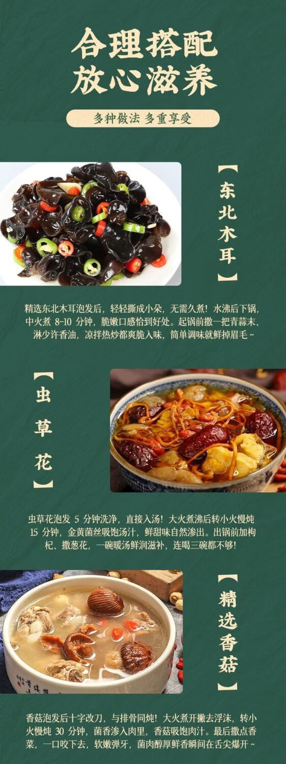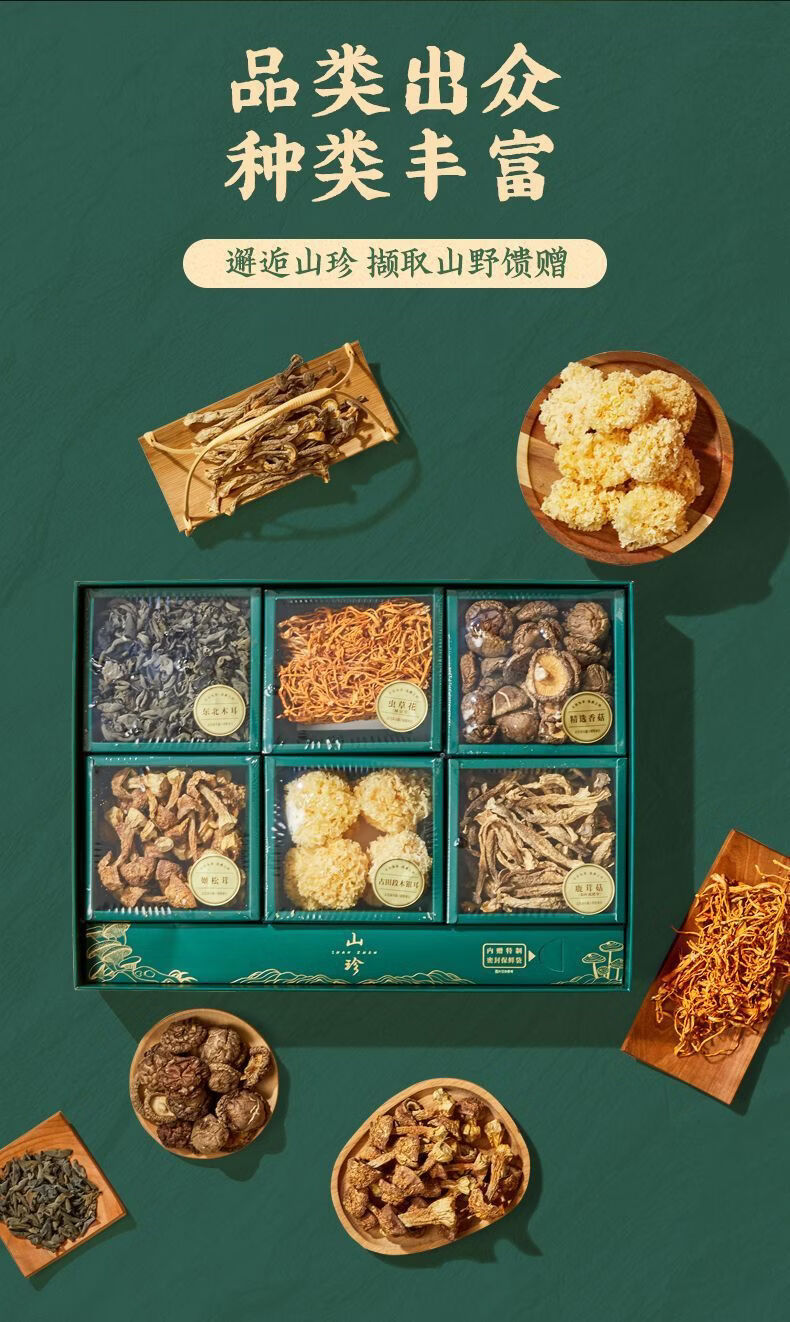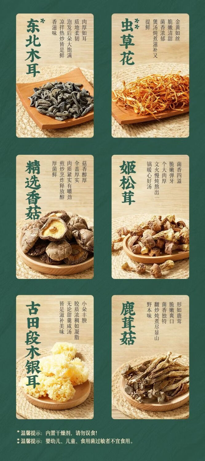 配置:精选香菇100g 东北木耳120g 鹿茸菇80g 虫草花80g 姬松茸80g 古田段木银耳70g