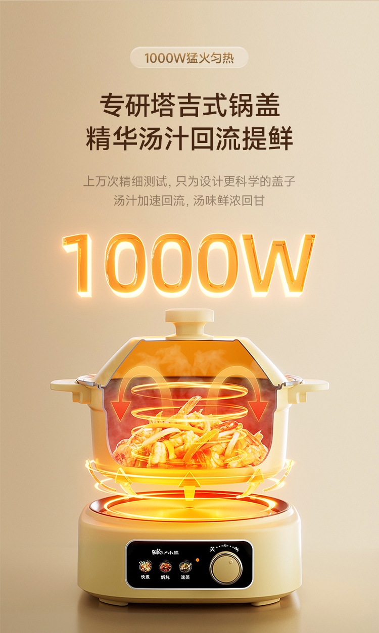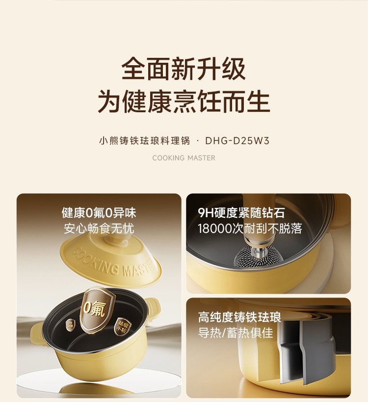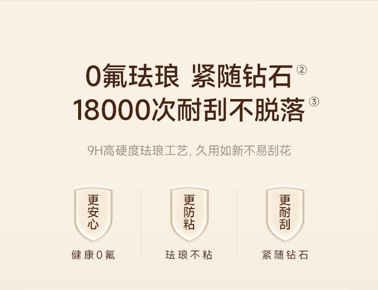 健康0氟0异味,安心畅食无忧;塔吉式锅盖,原汁回流更鲜浓;9H硬度紧随钻石,18000次耐刮不脱落