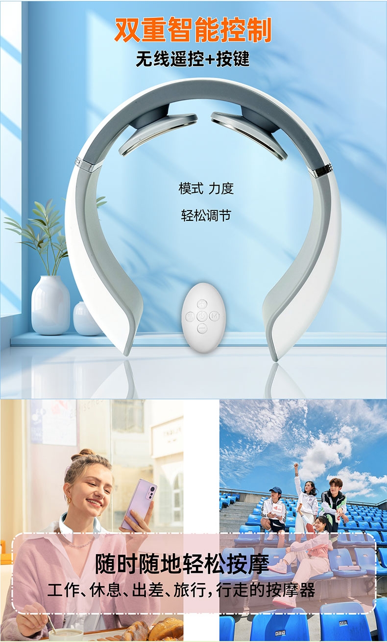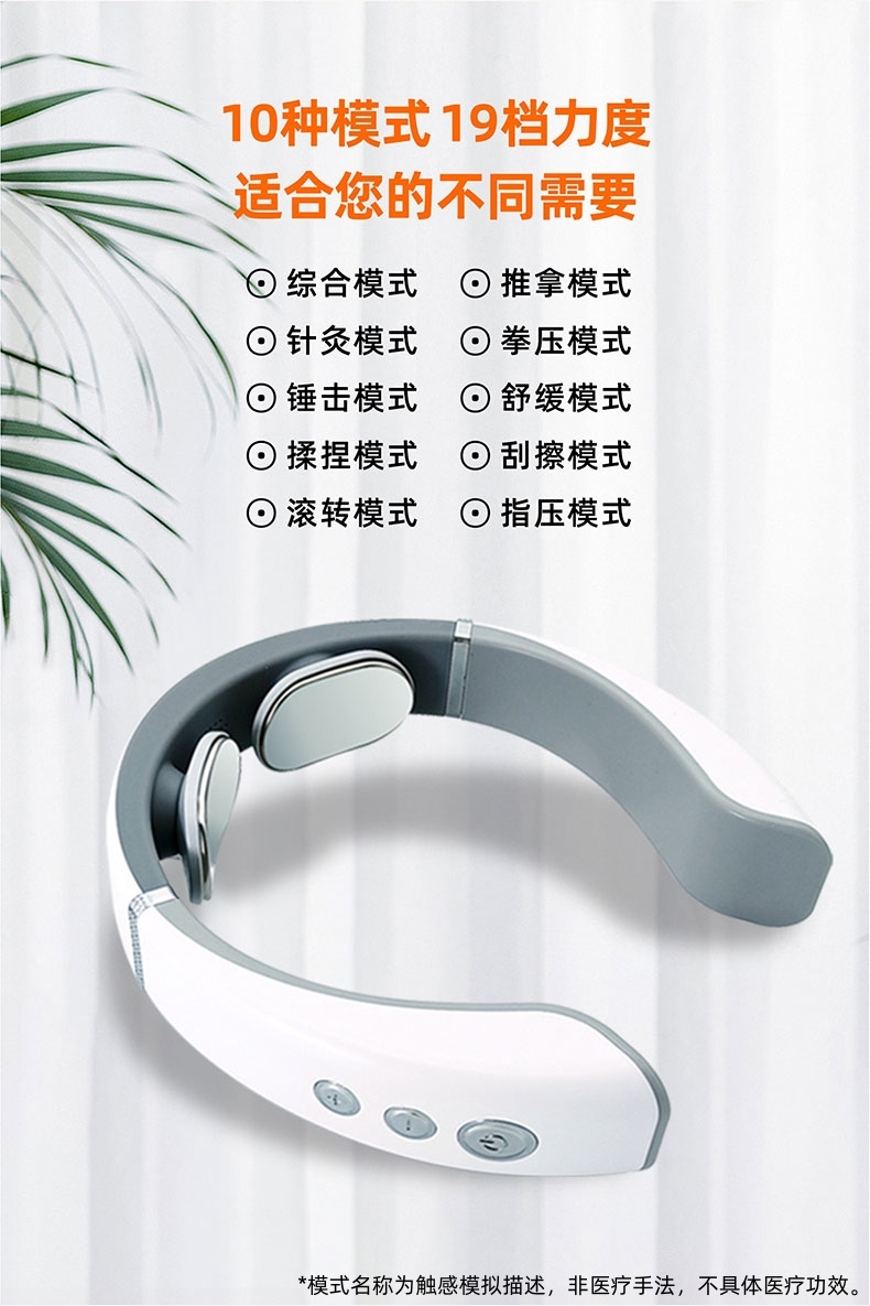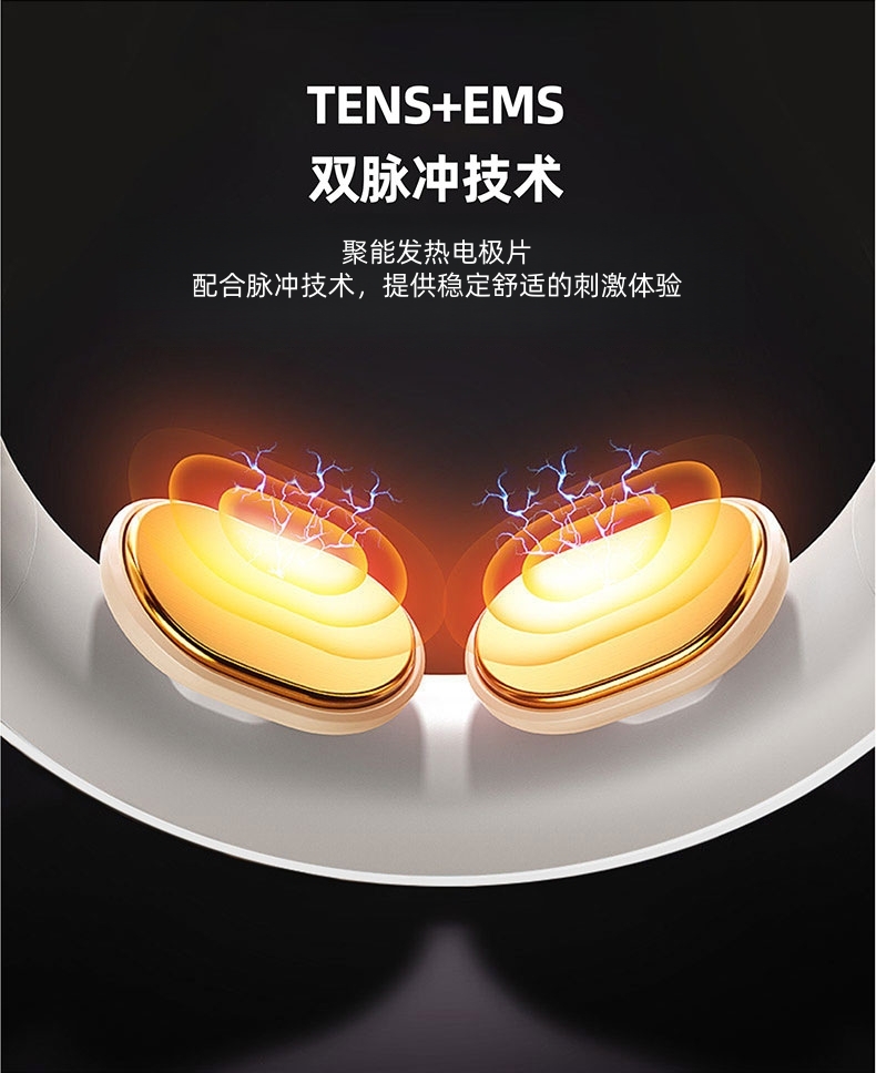双脉冲深层放松,TENS+EMS双技术结合;10模式×19档强度可调,模拟真人揉捏(充电款);恒温舒适热敷,温度稳定均匀,提升按摩体验(热敷款);语音引导操作,实时状态播报,功能一目了然(语音款);遥控自由调节,手持遥控切换模式与强度(遥控款)