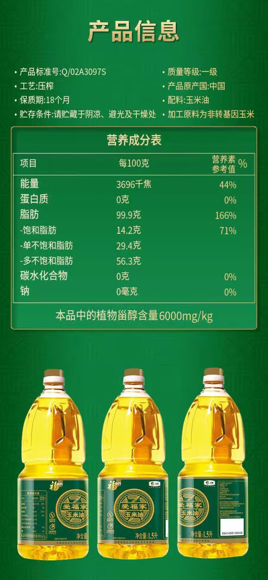 选用非转基因玉米,玉米颗粒饱满;采用物理压榨工艺;保留双重营养;中粮出品,品质有保障