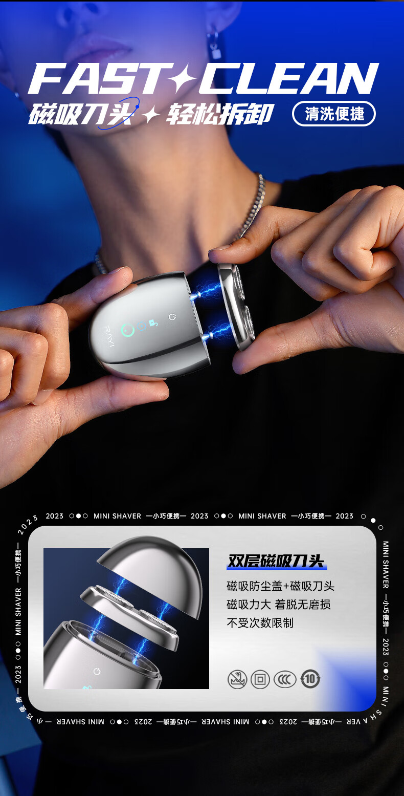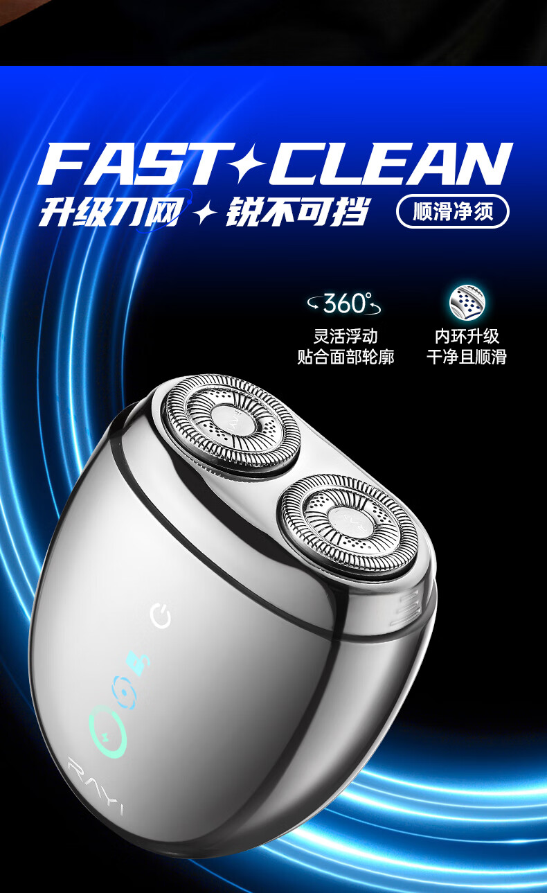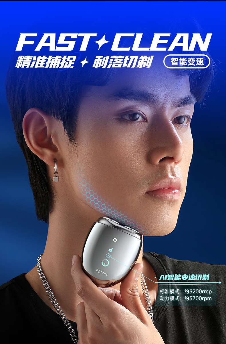 磁吸式开合刀头,双环弧面刀网,自动研磨刀片;AI智能变速,智能液晶屏幕显示;园润手感 金属质感