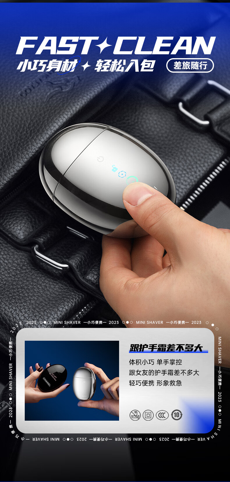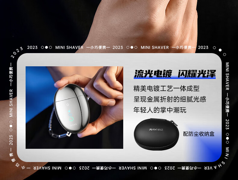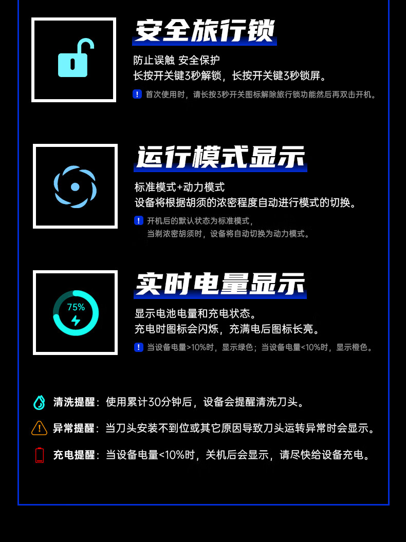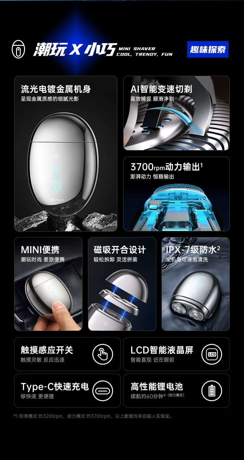 磁吸式开合刀头,双环弧面刀网,自动研磨刀片;AI智能变速,智能液晶屏幕显示;园润手感 金属质感