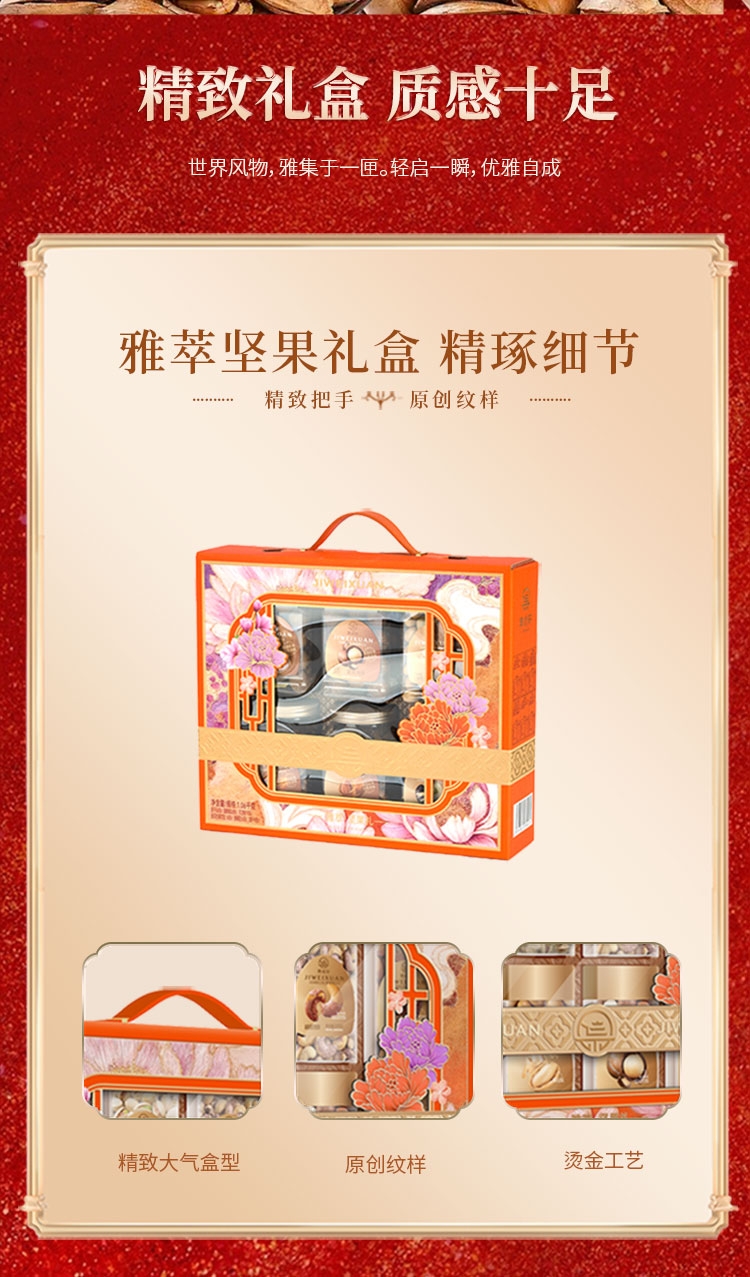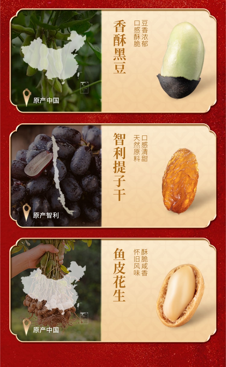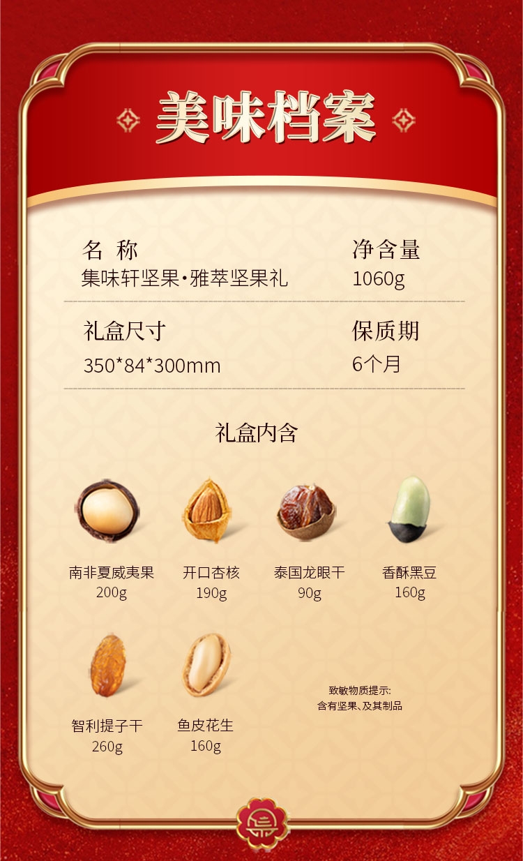 配置清单:南非夏威夷果200g 开口杏核190g 泰国龙眼干90g 五香黑豆160g 智利提子干260g 鱼皮花生160g