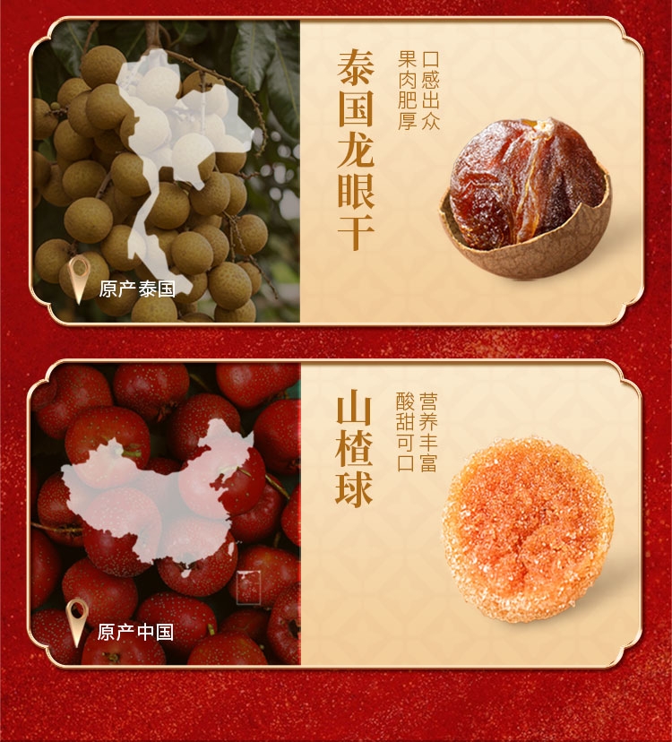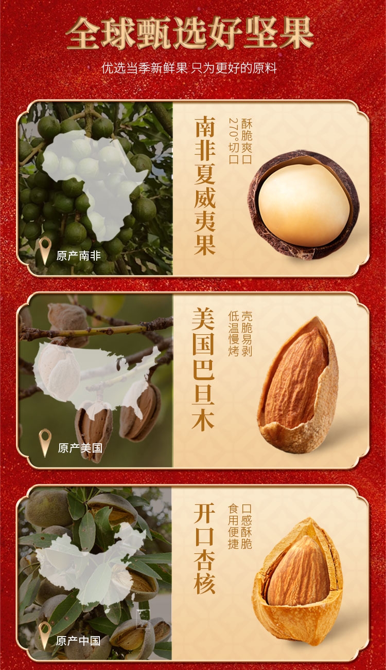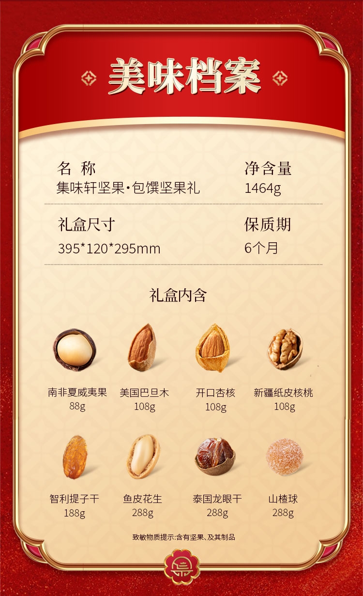 配置清单:南非夏威夷果88g 美国巴旦木108g 开口杏核108g 新疆纸皮核桃108g 智利提子干188g 鱼皮花生288g 泰国龙眼干288g 山楂球288g