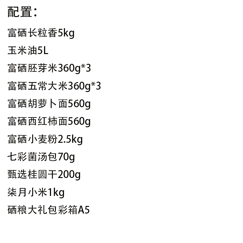 配置:富硒长粒香5kg 玉米油5L 富硒胚芽米360g*3 富硒五常大米360g*3 富硒胡萝卜面560g 富硒西红柿面560g 富硒小麦粉2.5kg 七彩菌汤包70g 甄选桂圆干200g 柒月小米1kg 硒粮大礼包彩箱A5