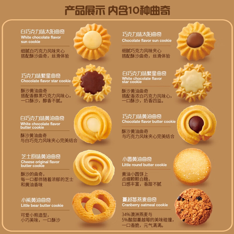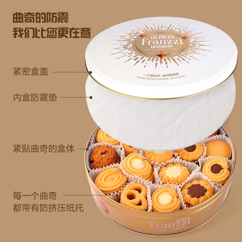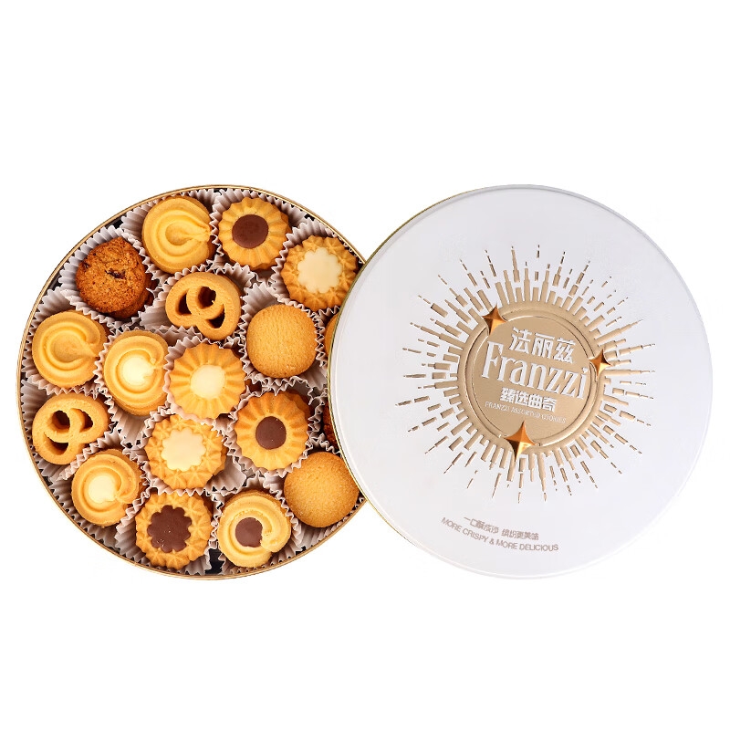 配置:【法丽兹】芝士原味黄油曲奇*9 【法丽兹】巧克力味黄油曲奇*9(黑/白巧克力夹心随机) 【法丽兹】巧克力味繁星曲奇*9(黑/白巧克力夹心随机) 【法丽兹】巧克力味太阳曲奇*9(黑/白巧克力夹心随机) 【法丽兹】小圆黄油曲奇*6 【法丽兹】小熊黄油曲奇*6 【法丽兹】蔓越莓燕麦曲奇*6 【法丽兹】香草冰淇淋可可夹心曲奇*1