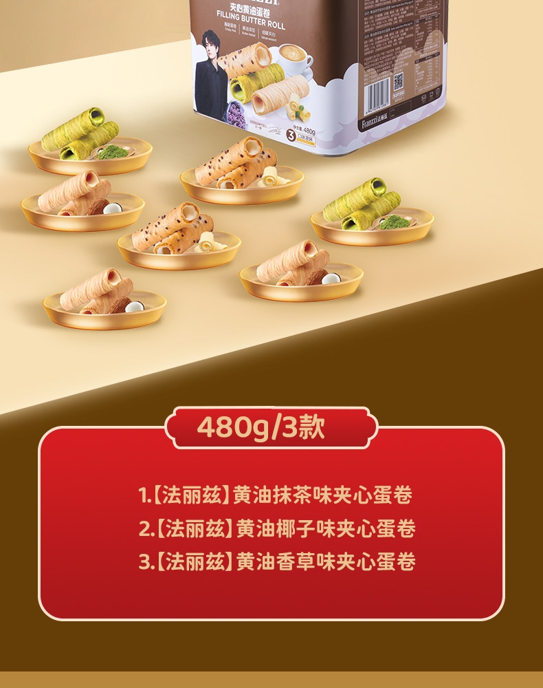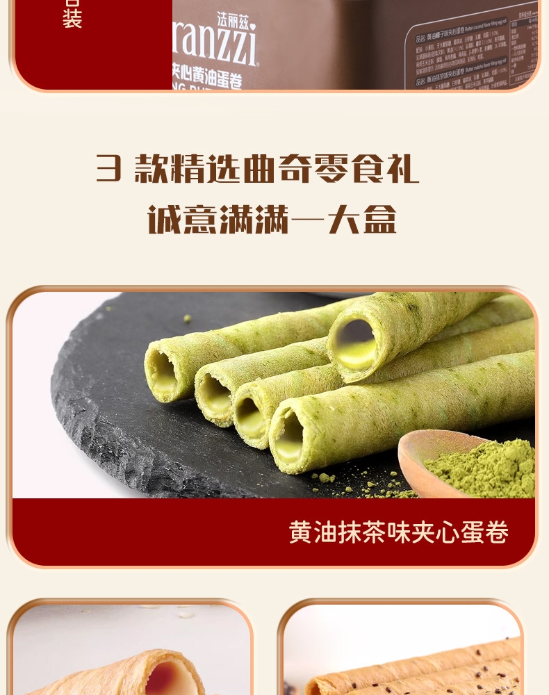 配置:【法丽兹】黄油抹茶味夹心蛋卷 【法丽兹】黄油椰子味夹心蛋卷 【法丽兹】黄油香草味夹心蛋卷