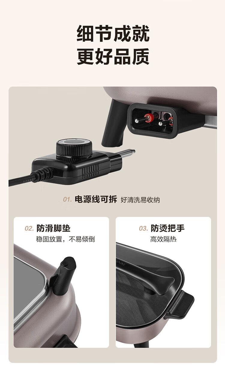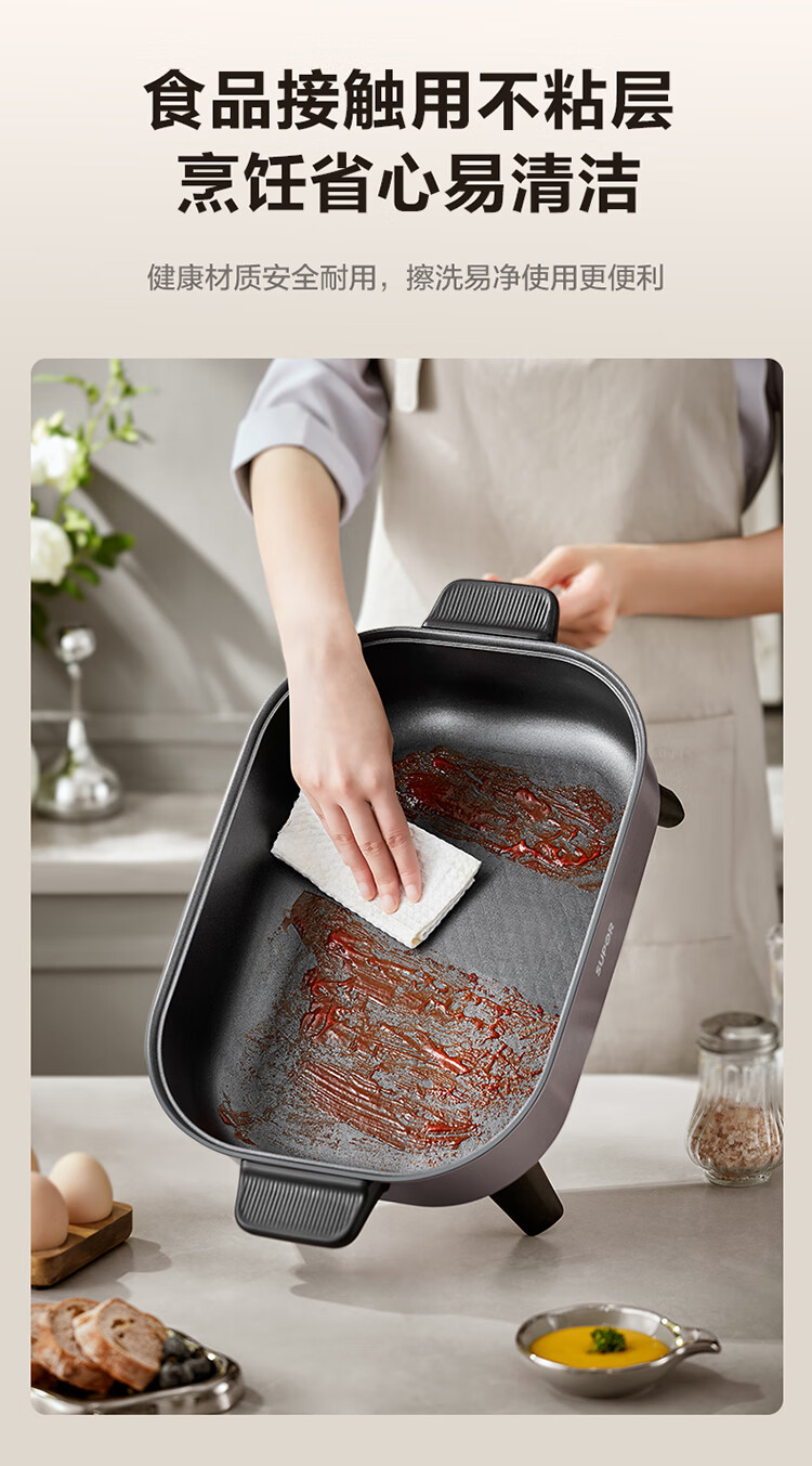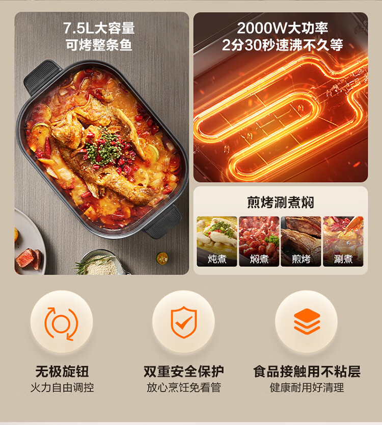 7.5L加大容量;无极旋钮,火力自由调控;食品接触用不粘层
