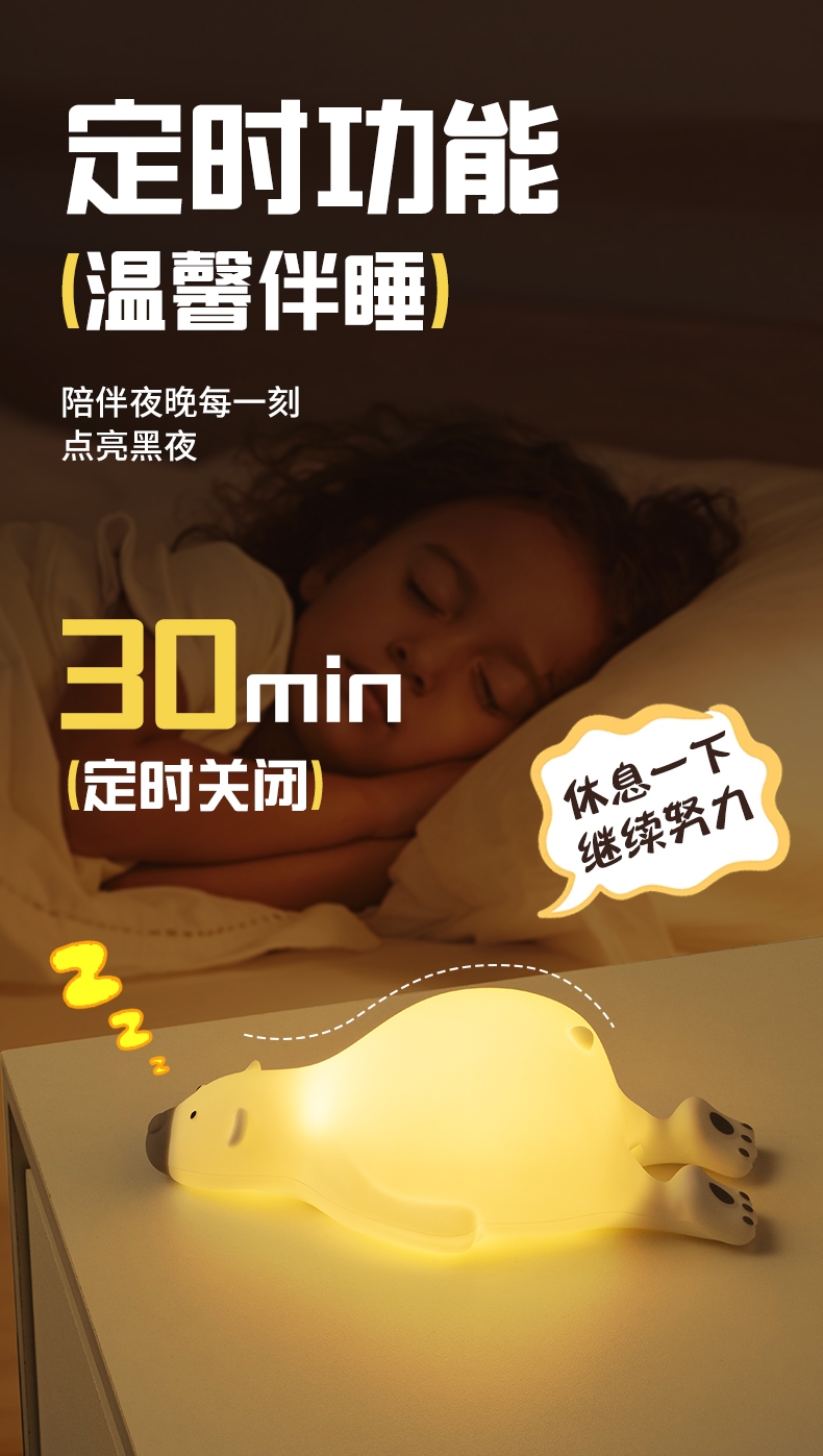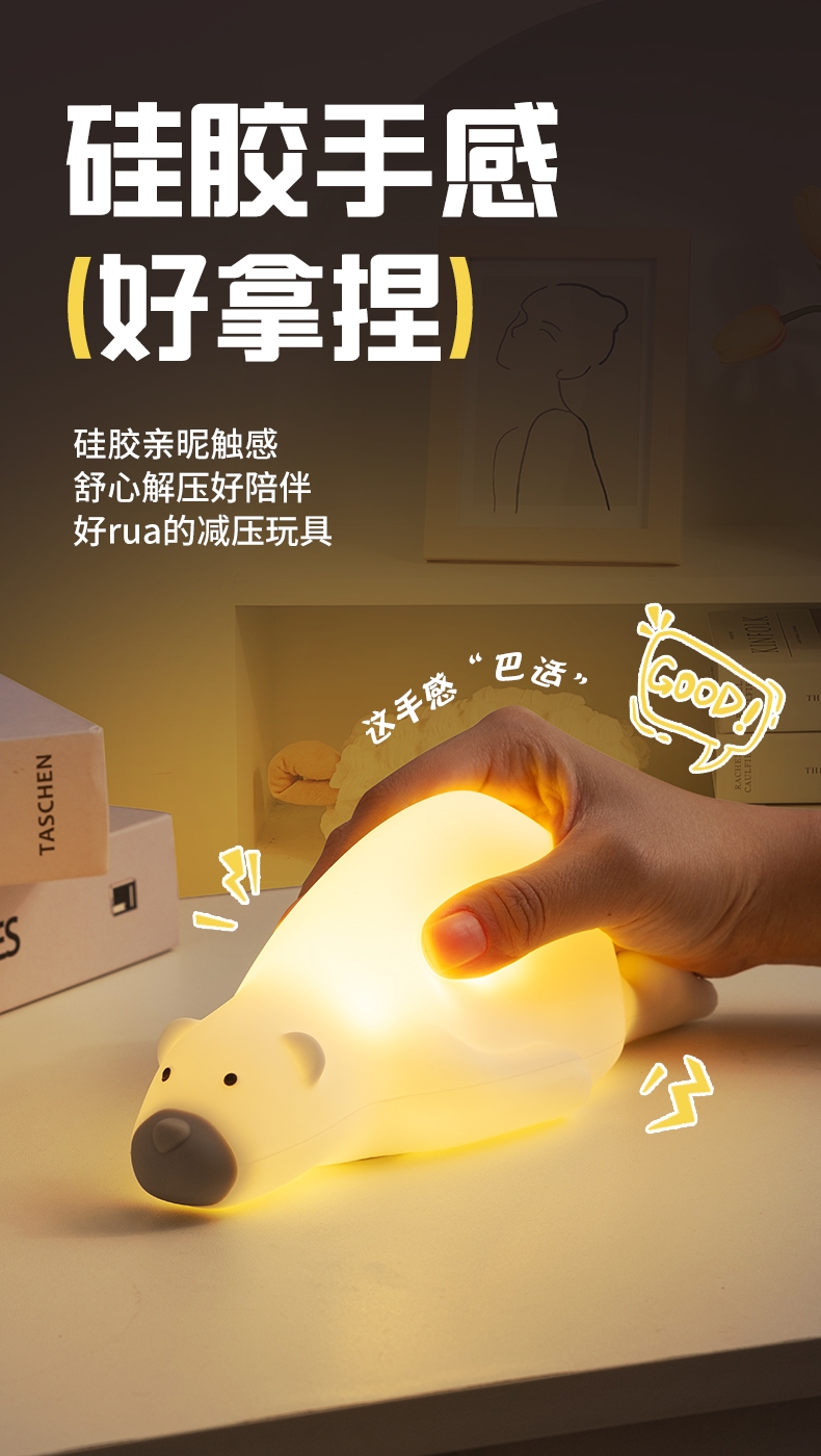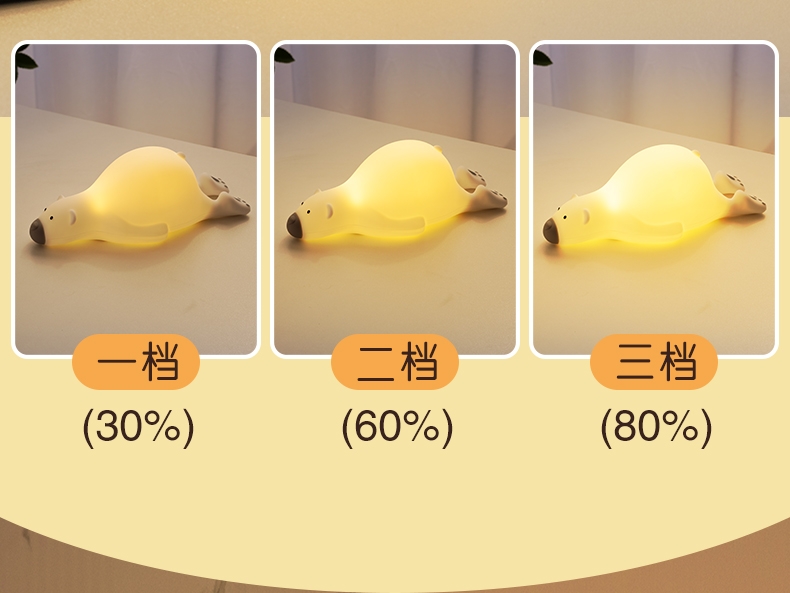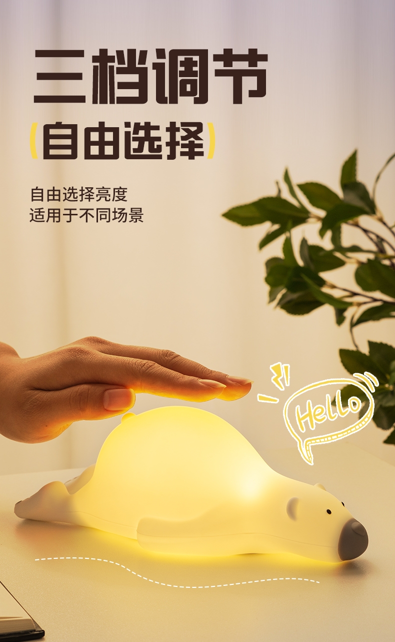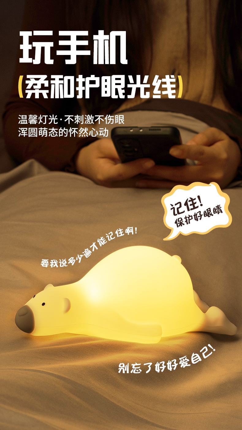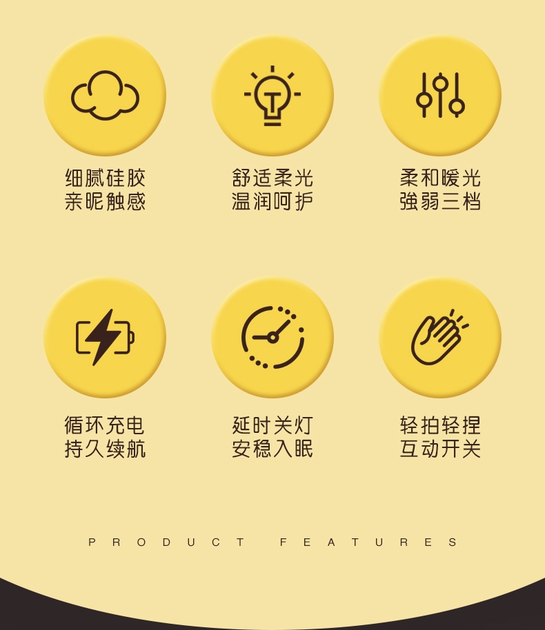 细腻硅胶,亲昵触感;舒适柔光,温润呵护;柔和暖光,强弱三档