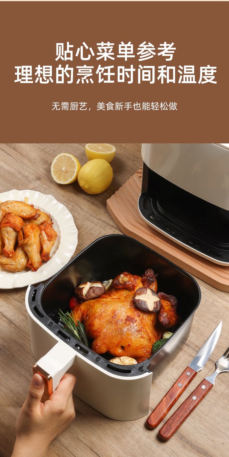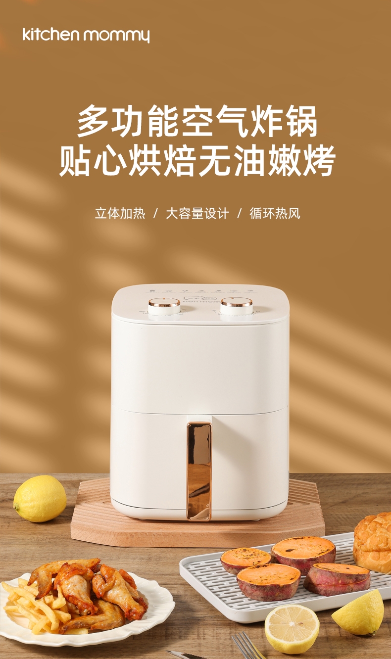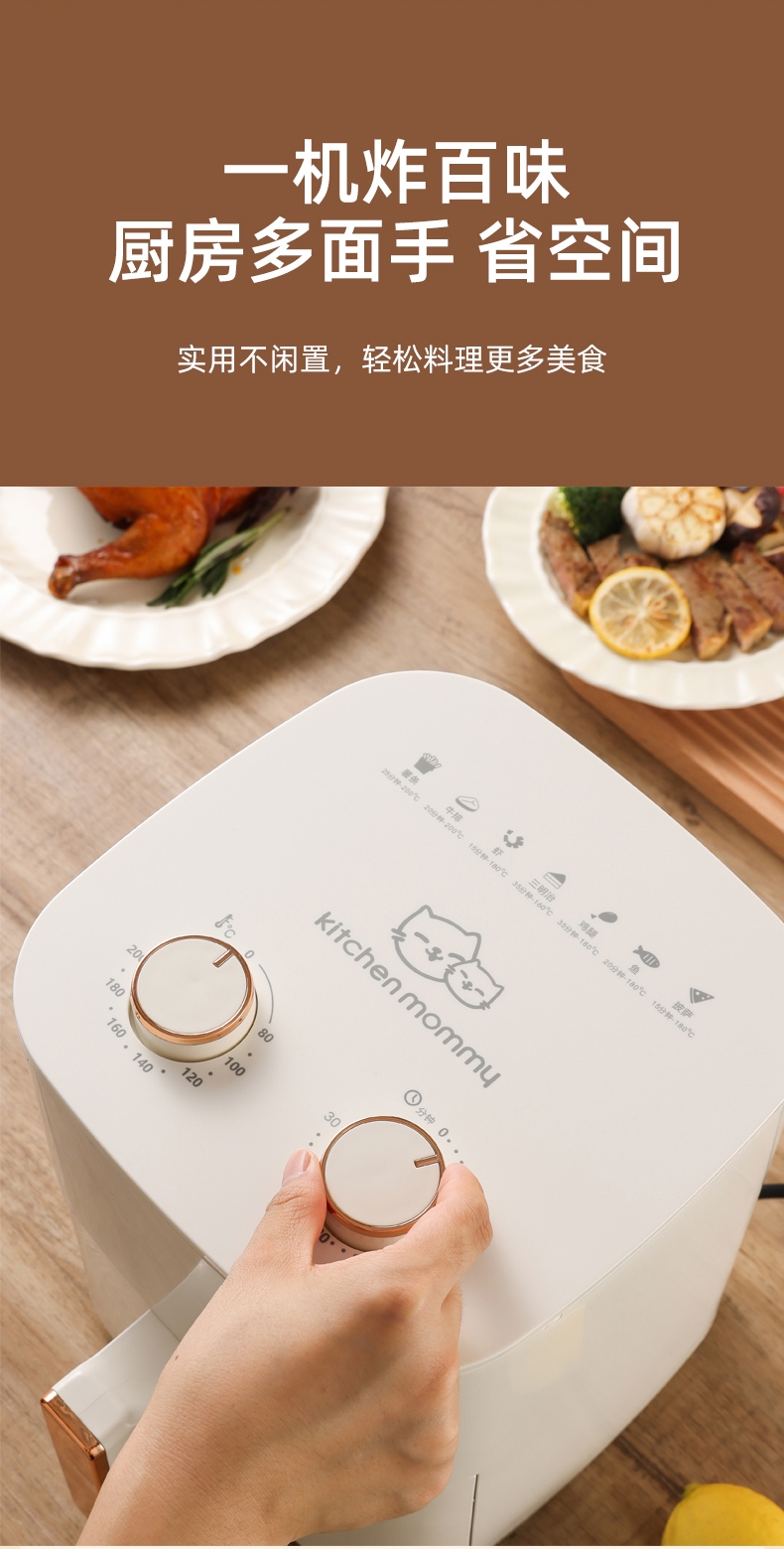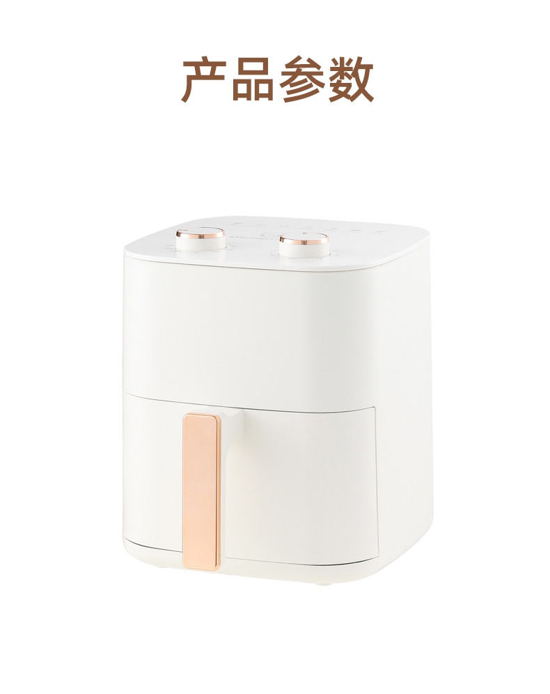 4.5L大容量,满足一家人的需要;无油空气炸,低脂低油烹饪,做出健康美食;不粘涂层,易清洗,提蓝抽取自动断电;360度高速热风循环,食物均匀熟;双旋钮控时控温,一扭就上手,简易方便