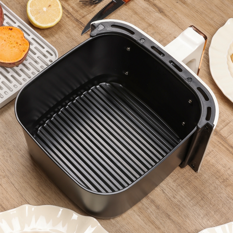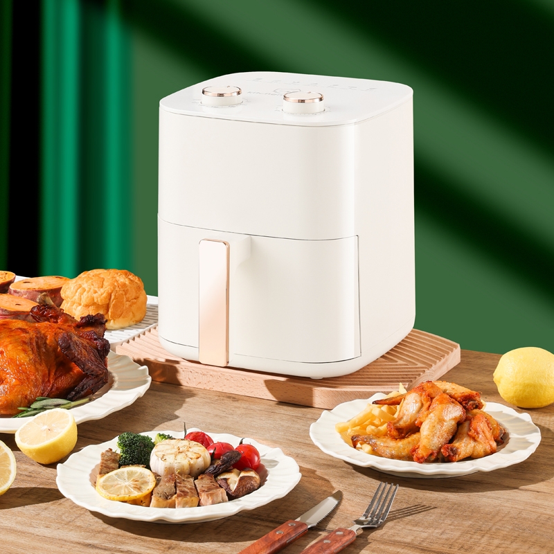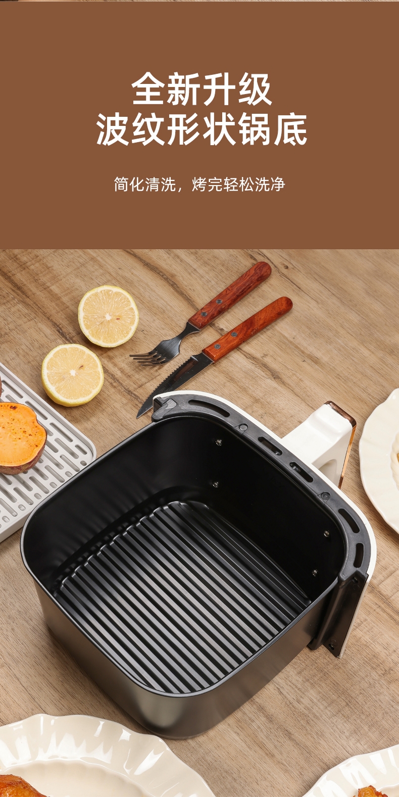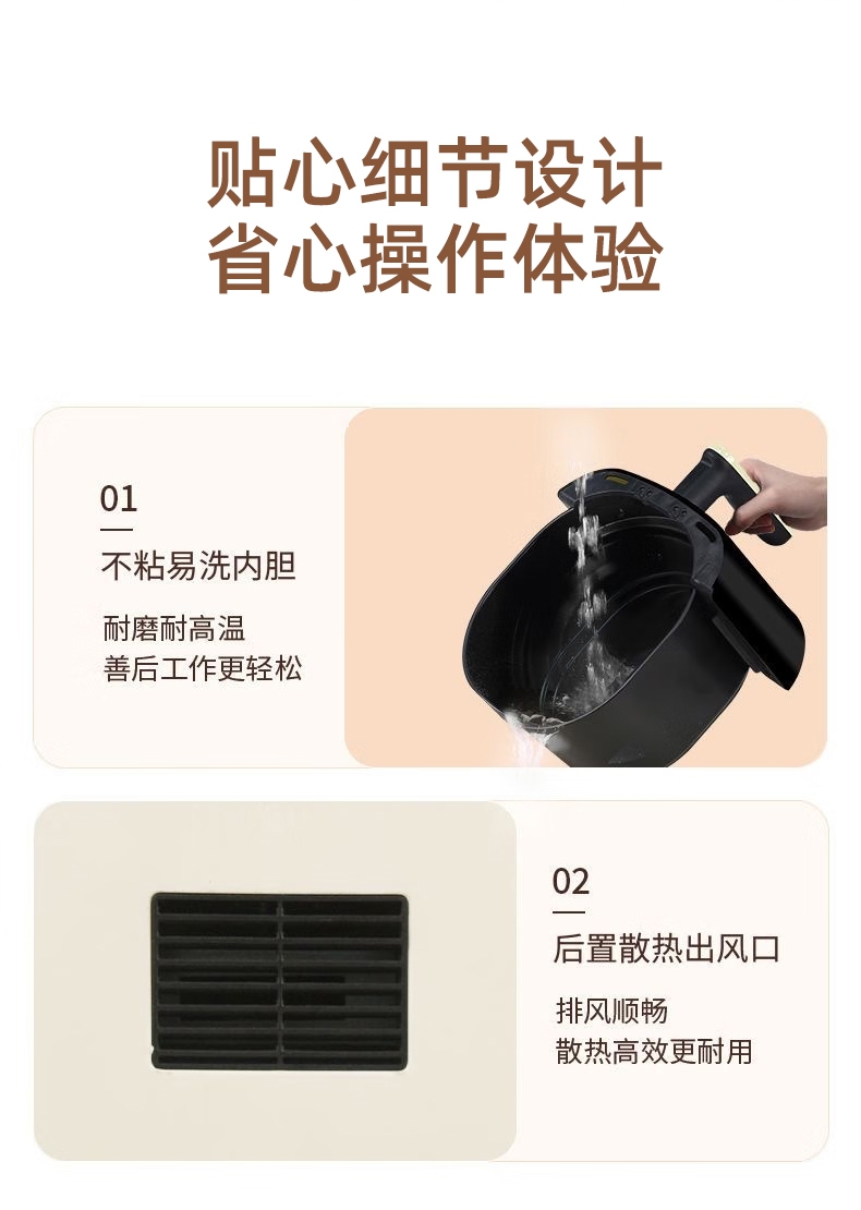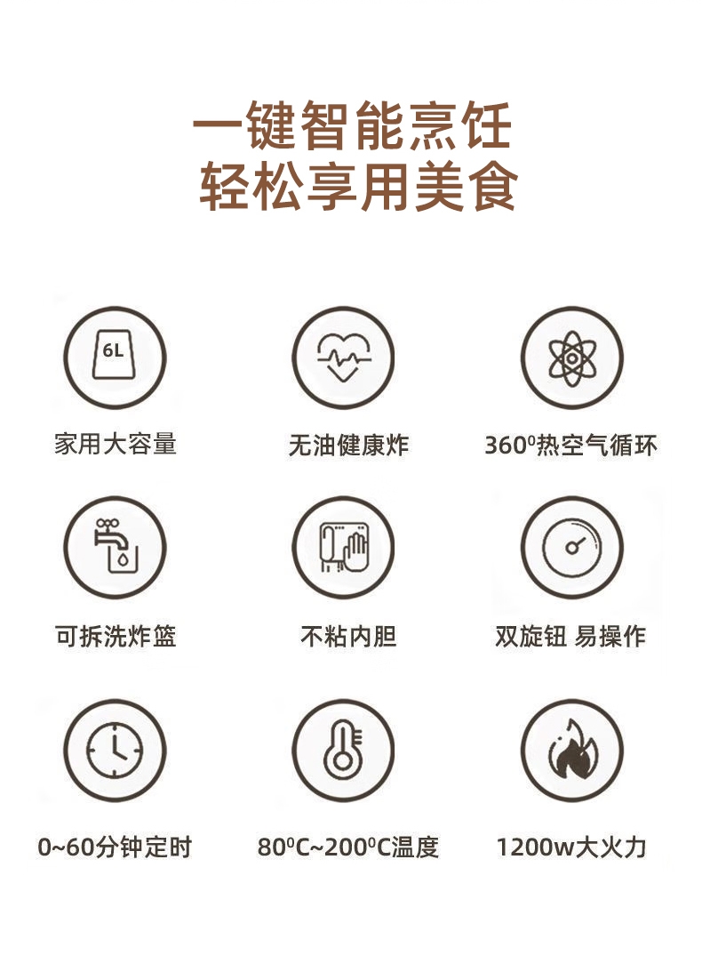 4.5L大容量,满足一家人的需要;无油空气炸,低脂低油烹饪,做出健康美食;不粘涂层,易清洗,提蓝抽取自动断电;360度高速热风循环,食物均匀熟;双旋钮控时控温,一扭就上手,简易方便