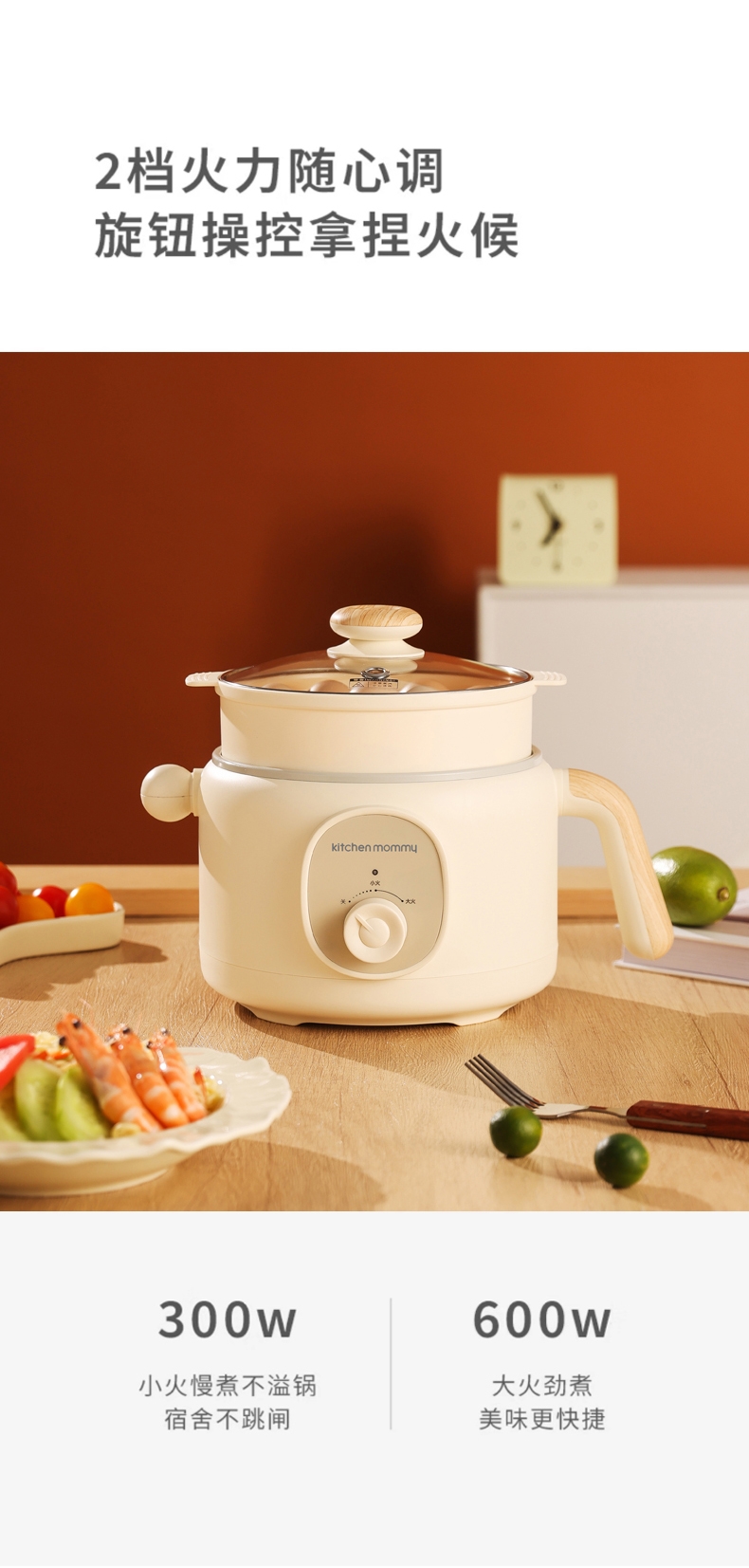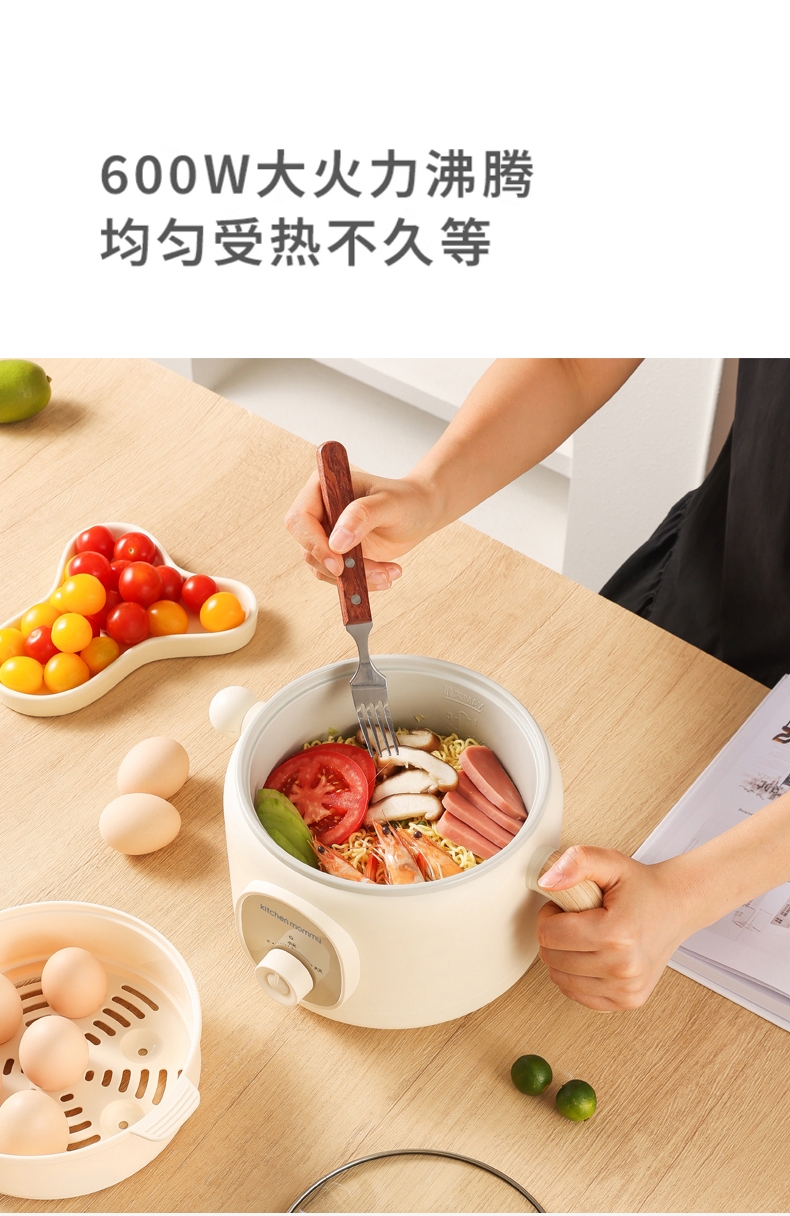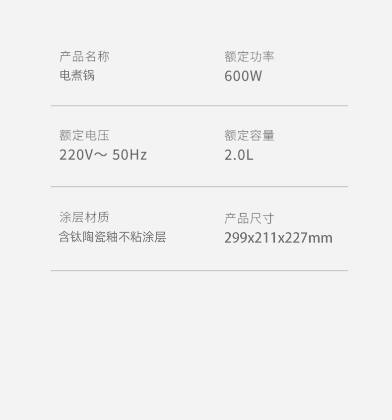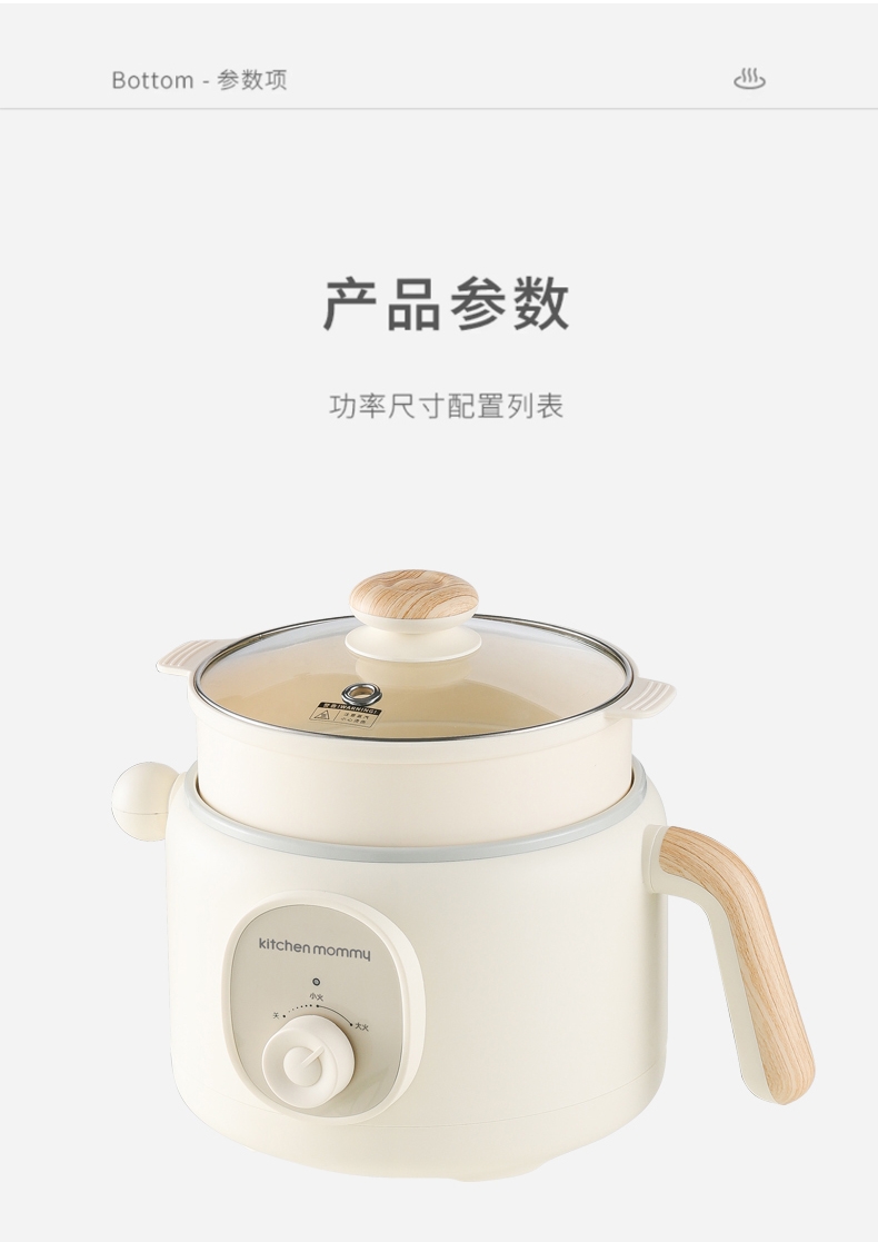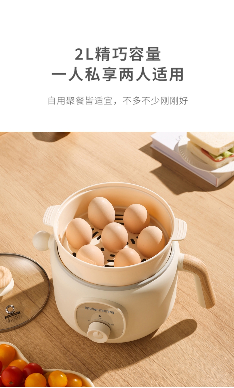 升级含钛陶瓷釉食品级不沾涂层,无重金属析出;2档火力,小火300W,大火600W,旋钮易操控;2L精巧容量,适用1-2人,上蒸下煮,烹饪更省时;双重安全保护,防干烧,超温过热自动跳断;双重防烫舒适把手,可视化玻璃盖,能清晰看到美食