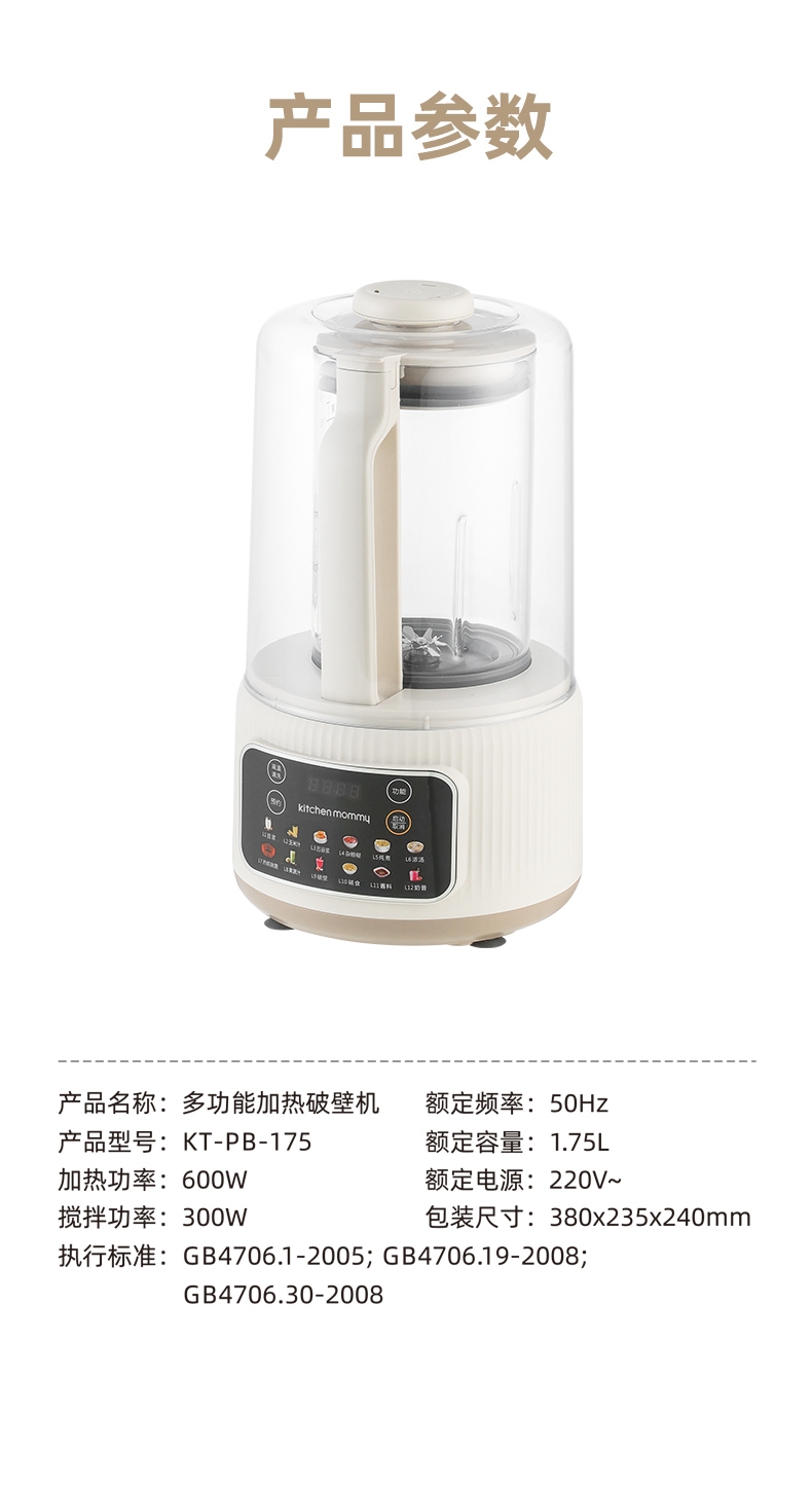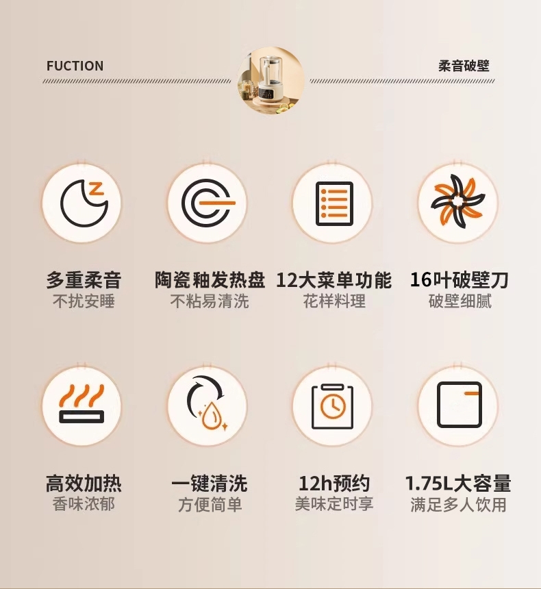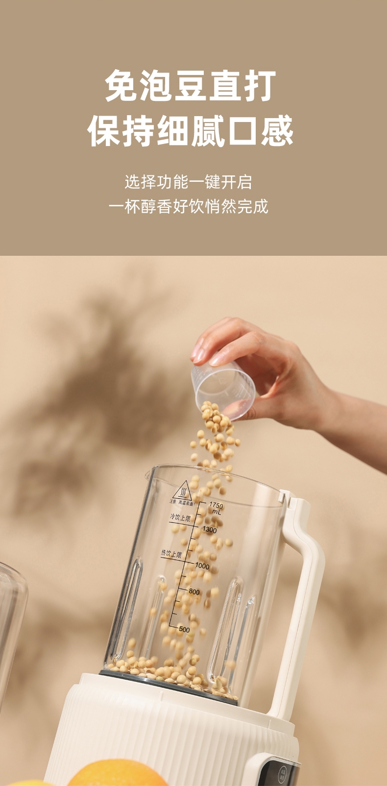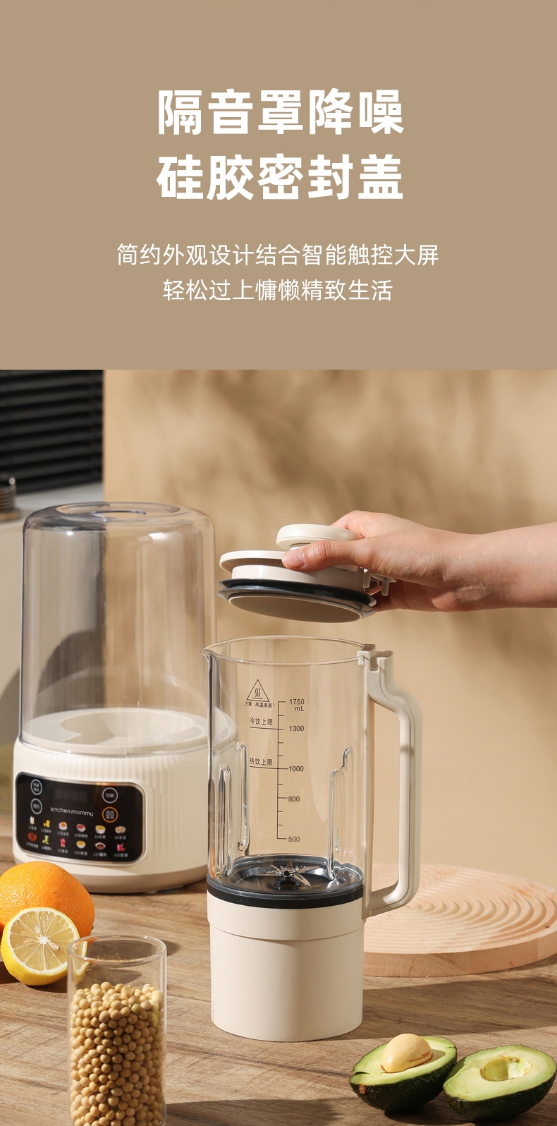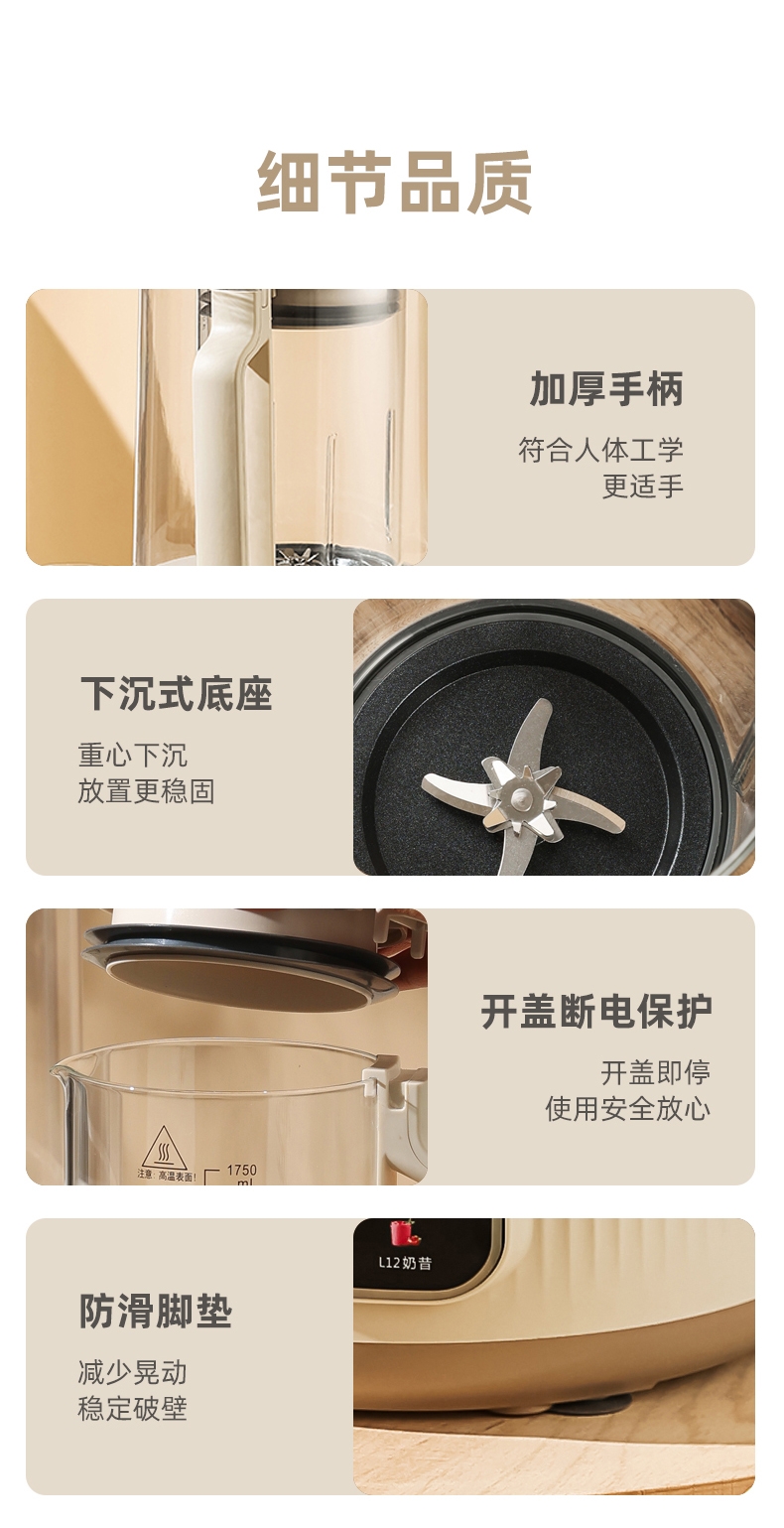 1.75升大容量,满足全家所需,12大功能菜单弄出;分体设计,易清洗,开盖即停,带保护功能;食品级高鹏硅玻璃,更安心,更健康,耐高温防爆裂;加厚密封隔音罩,柔声破壁,安静升级;16叶钢刀,强劲动力干豆免泡,瞬间粉碎食物细胞壁