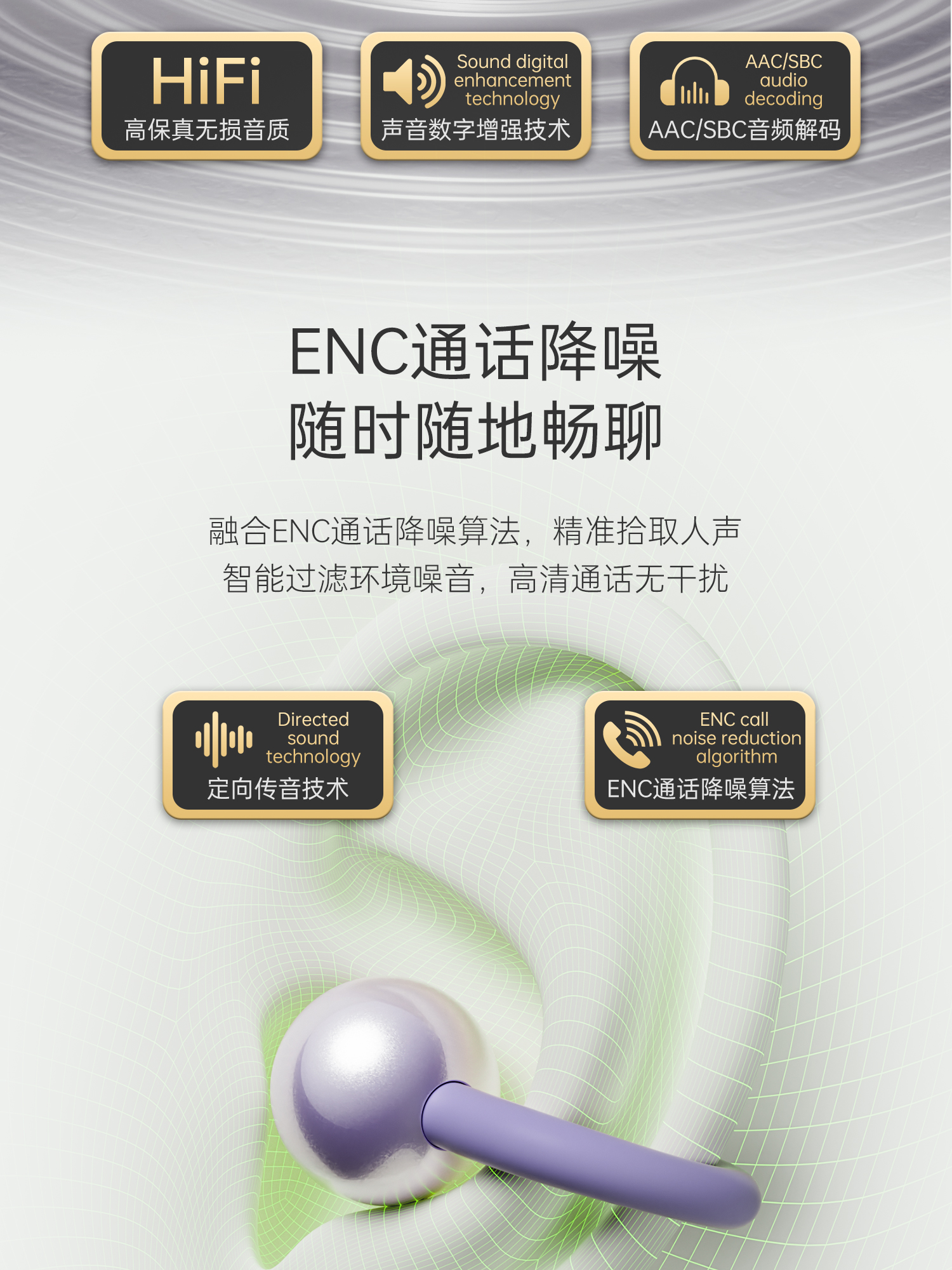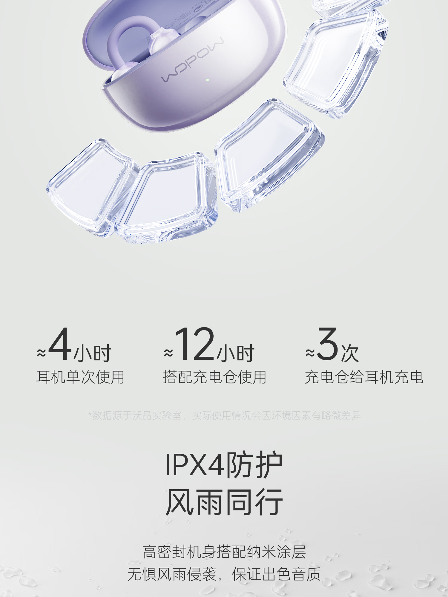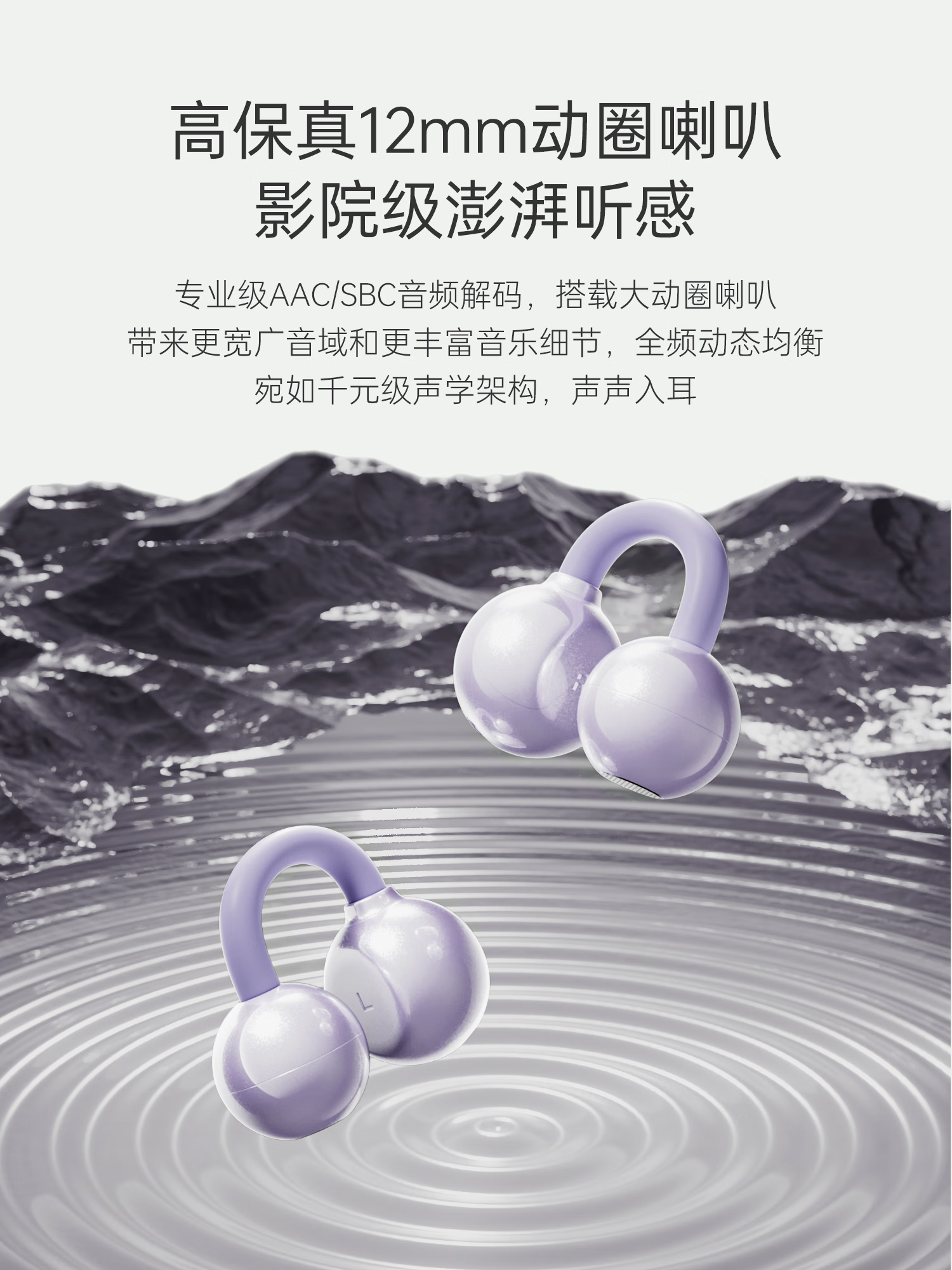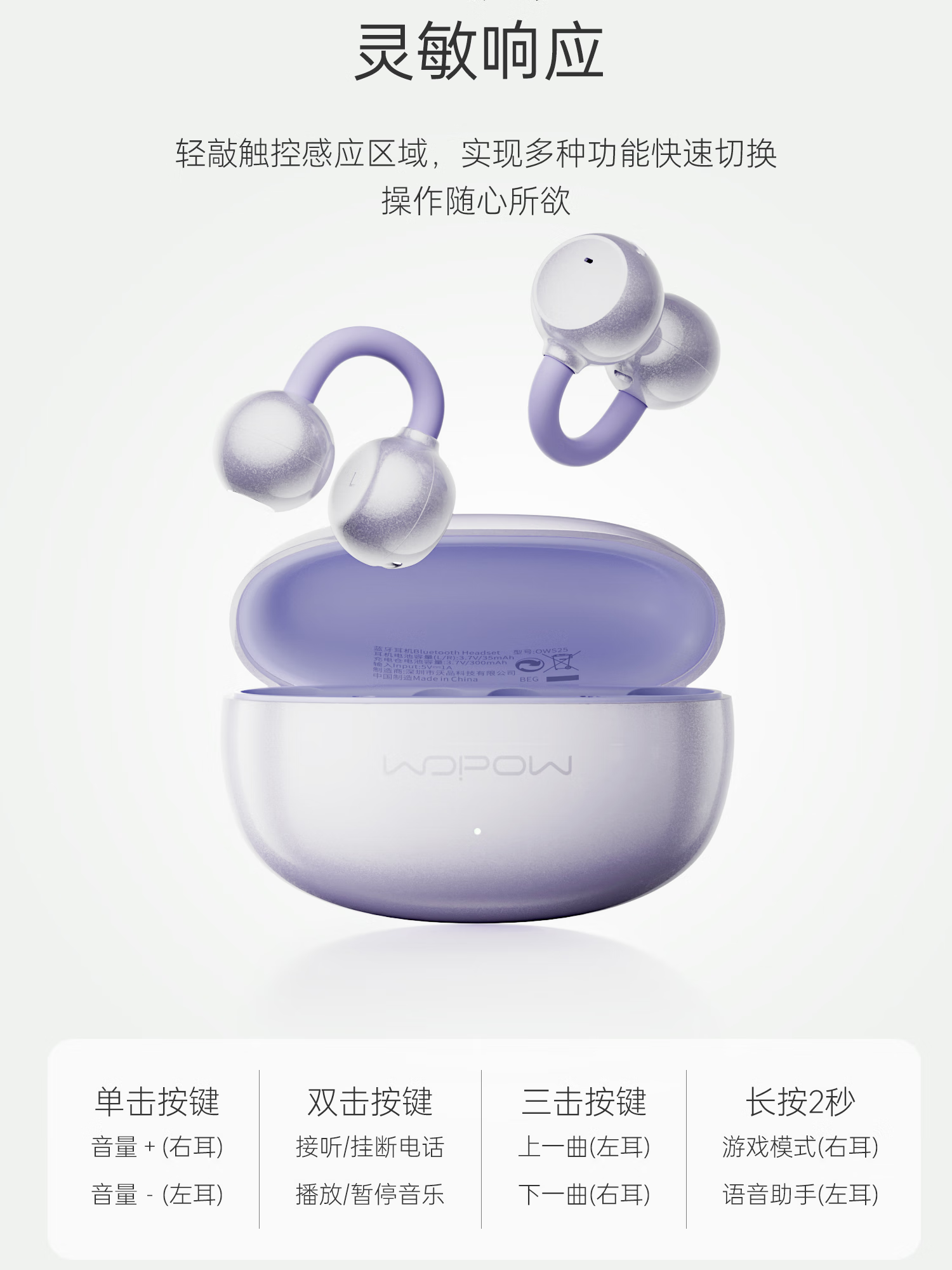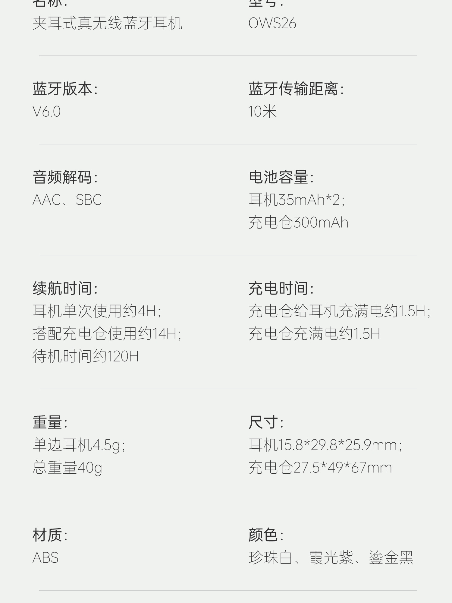 OWS开放式耳夹设计,佩戴更舒适;双声道双硅麦高清通话,ipx4级防水;蓝牙V6.0、低功耗,超长续航,传输速率更快,更稳