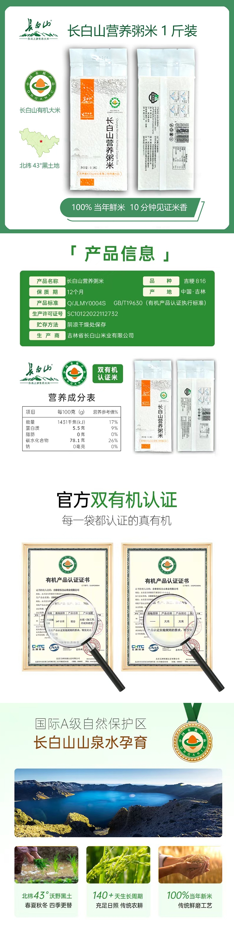 长白山大米山泉水灌溉,寒地生长;绿色加工,不抛光,不添加香精;长白山大米安全、营养、好吃