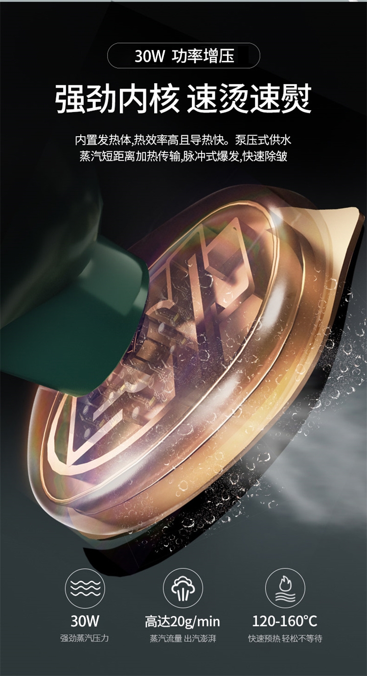 内置发热体,热效率高且导热快;快速预热,轻松不等待;30W 强劲蒸汽压力