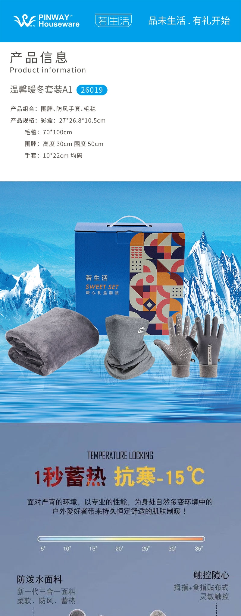 暖冬三件套,全身抗寒不遗漏;毛毯披肩(裹身 / 盖腿都暖)+ 围脖(护住脖颈防;礼盒手提设计,送礼自带仪式感;围脖弹性贴合(不勒脖子),手套触屏灵敏