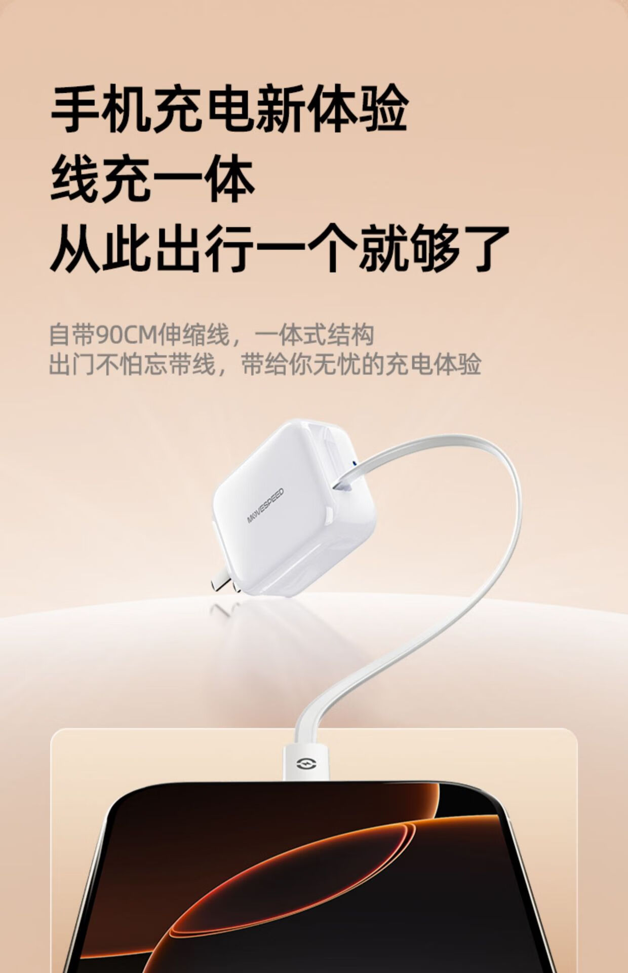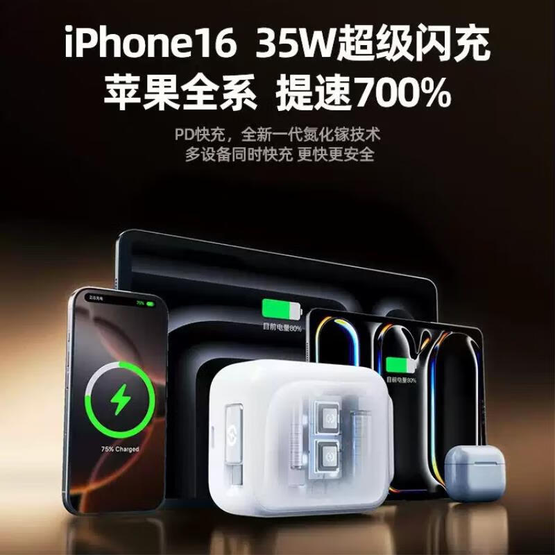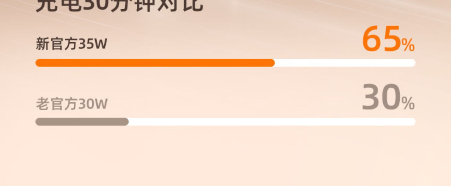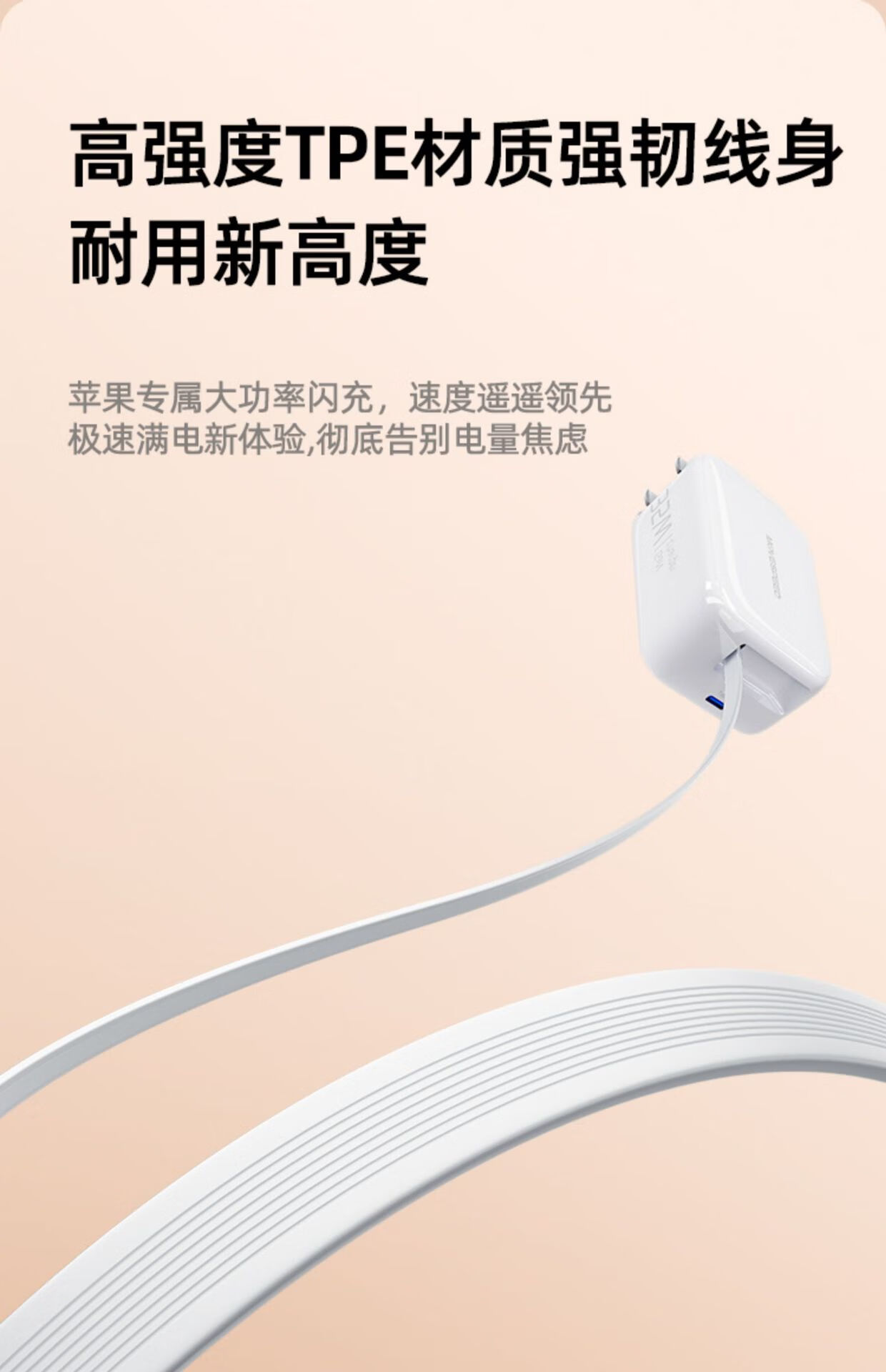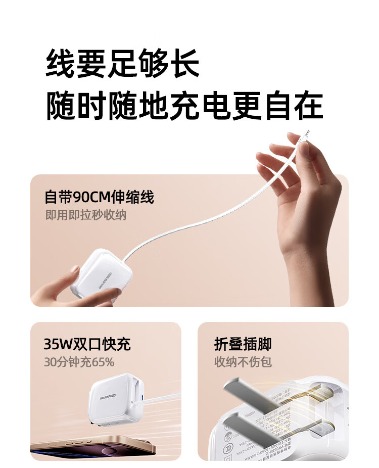 高强度TPE材质强韧线身,耐用新高度;自锁回弹的合金转轴专利,卓越耐用,顺滑随心;35W超级闪充,30分钟充满65%