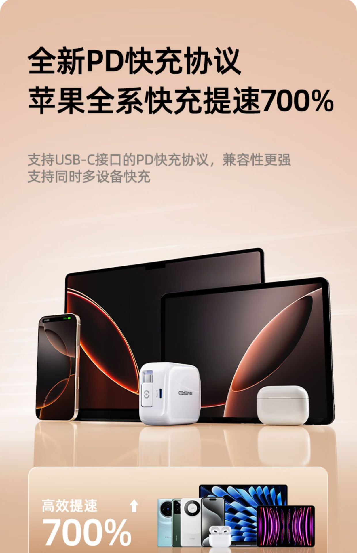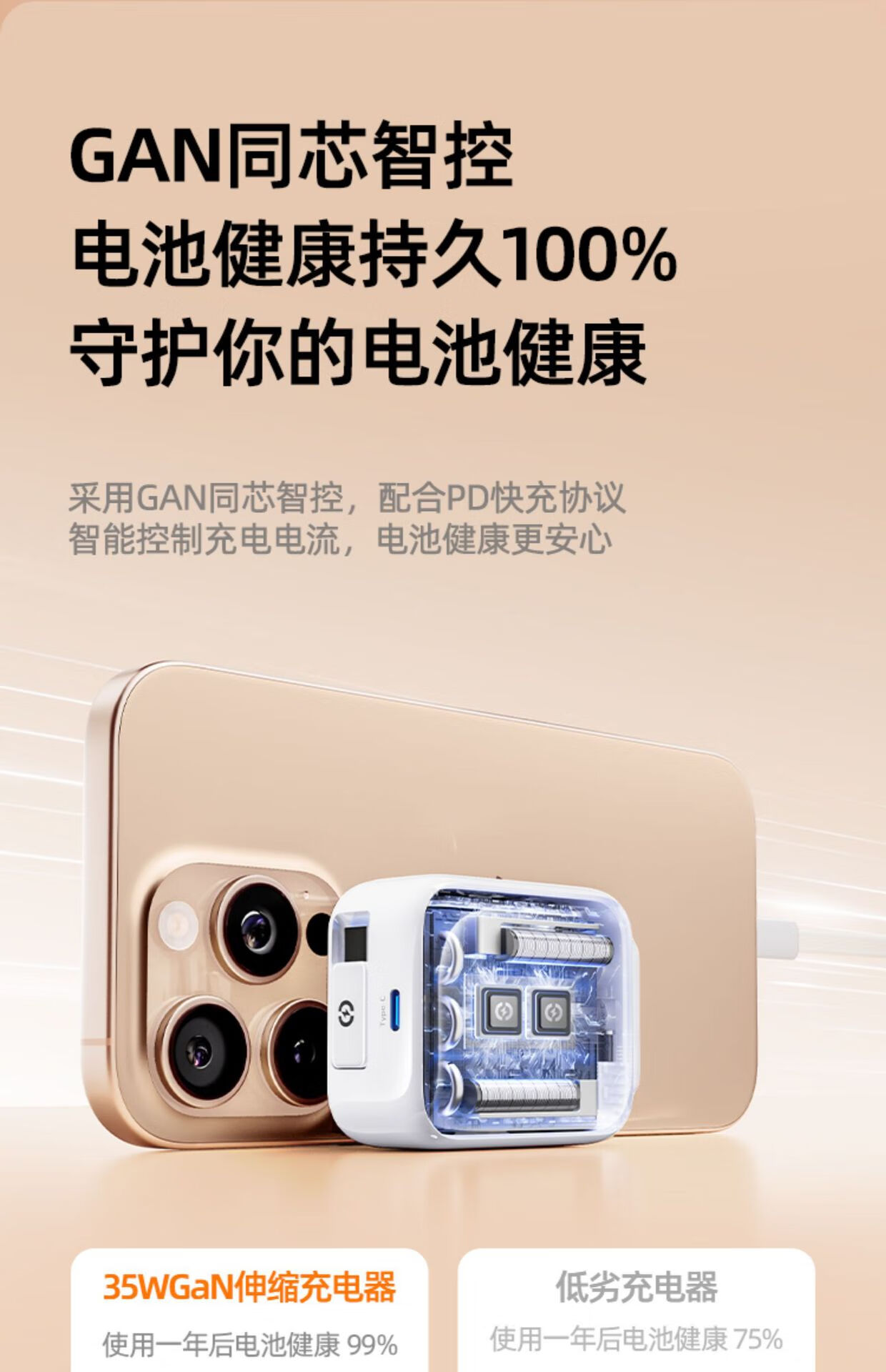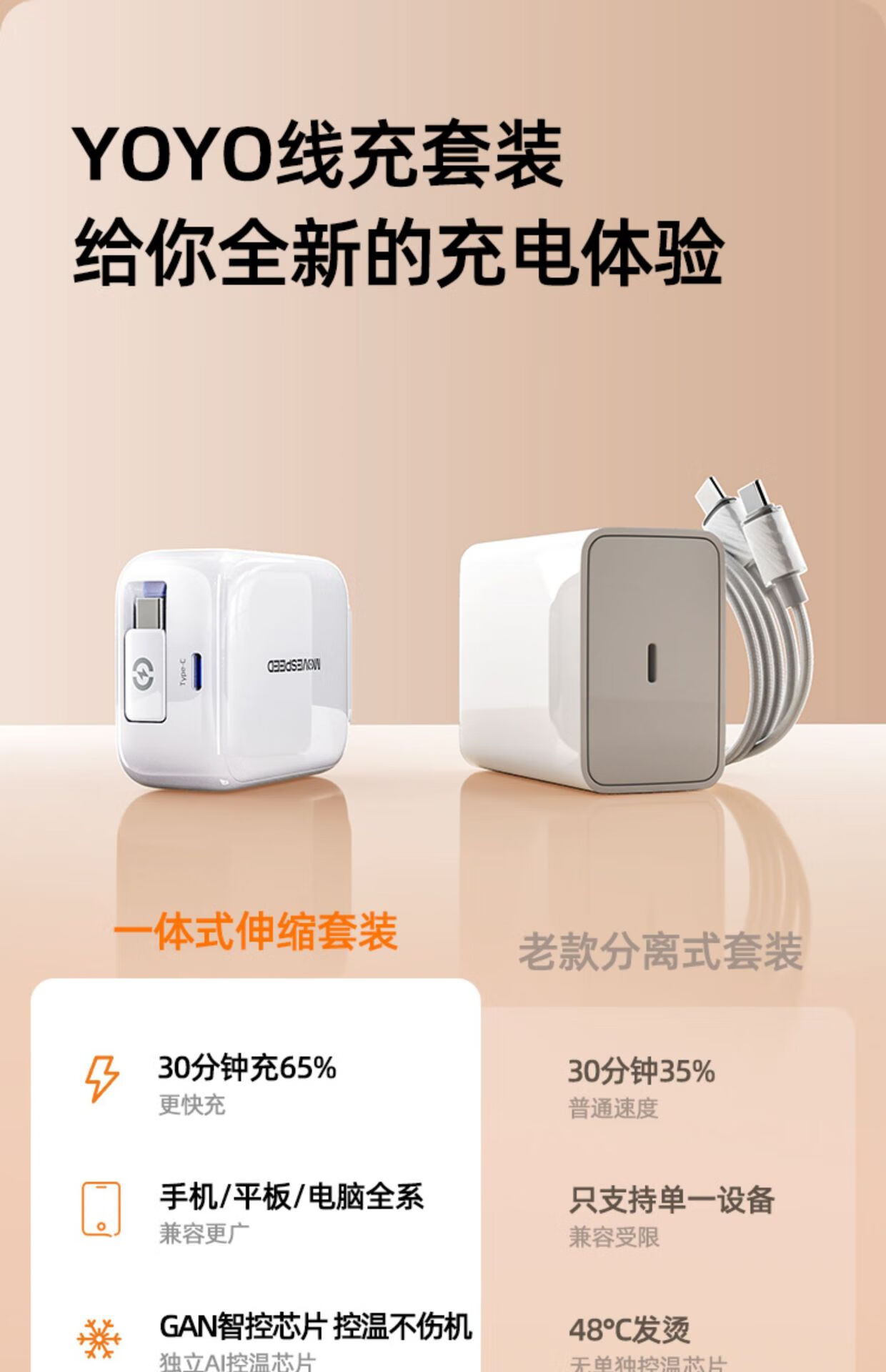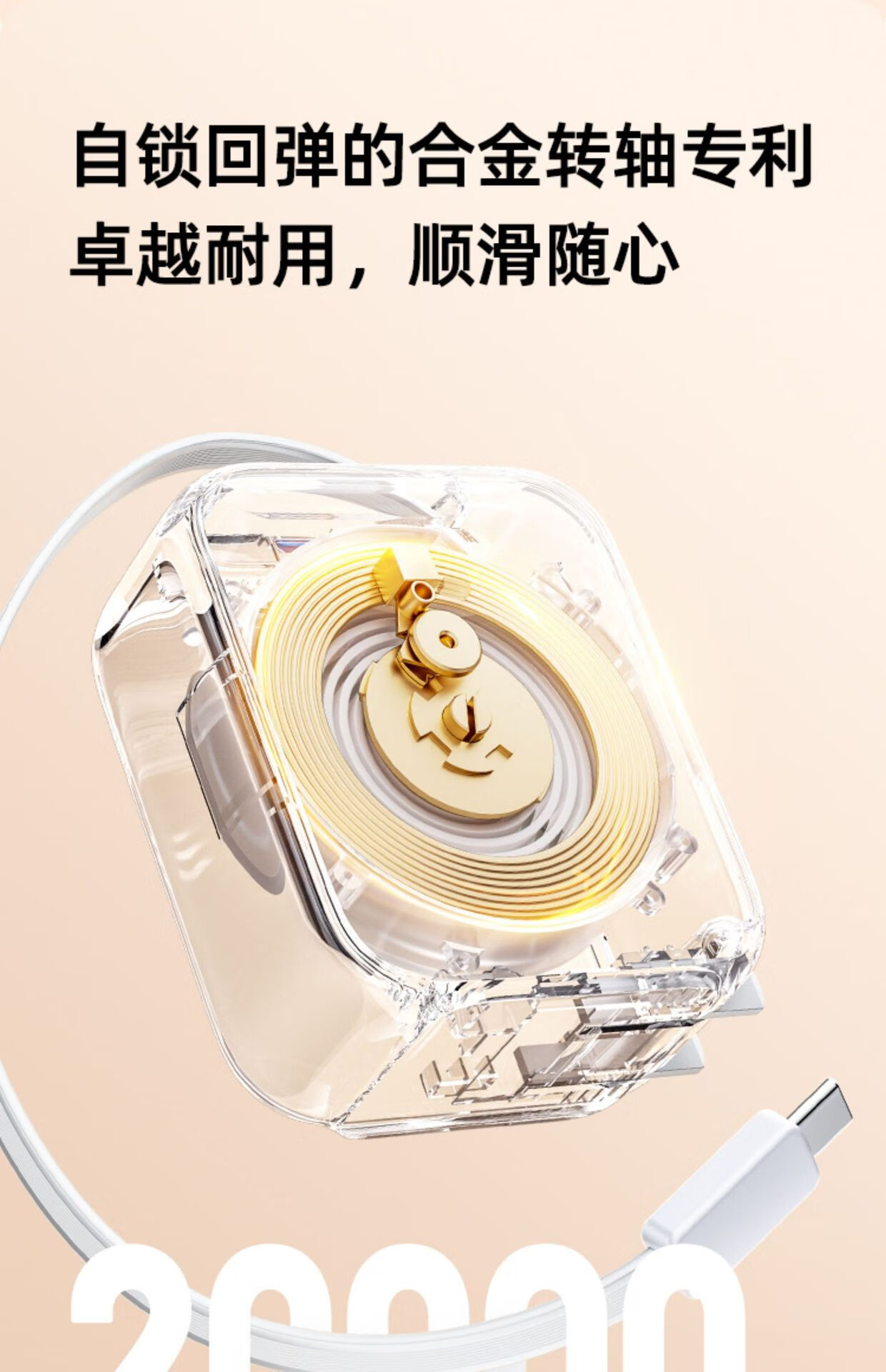 高强度TPE材质强韧线身,耐用新高度;自锁回弹的合金转轴专利,卓越耐用,顺滑随心;35W超级闪充,30分钟充满65%