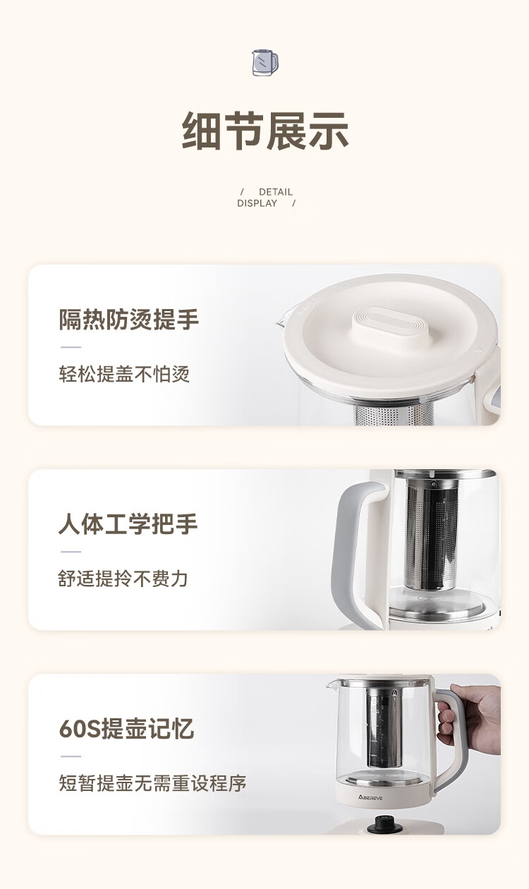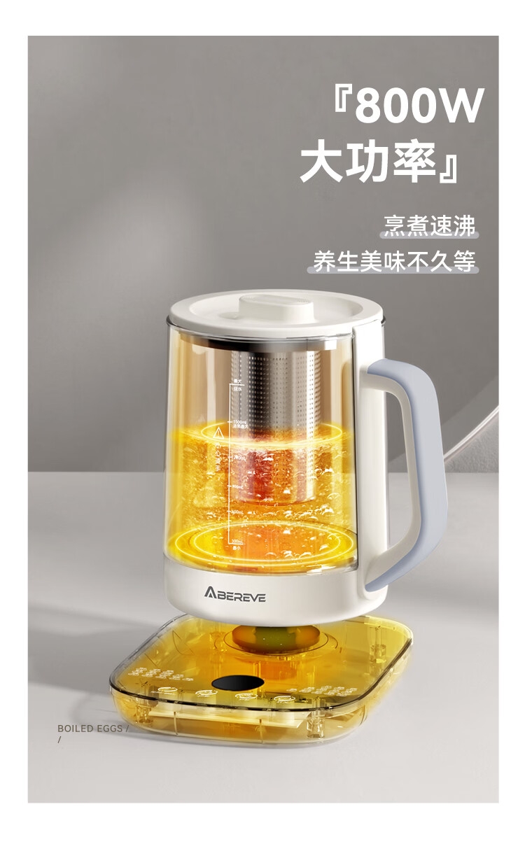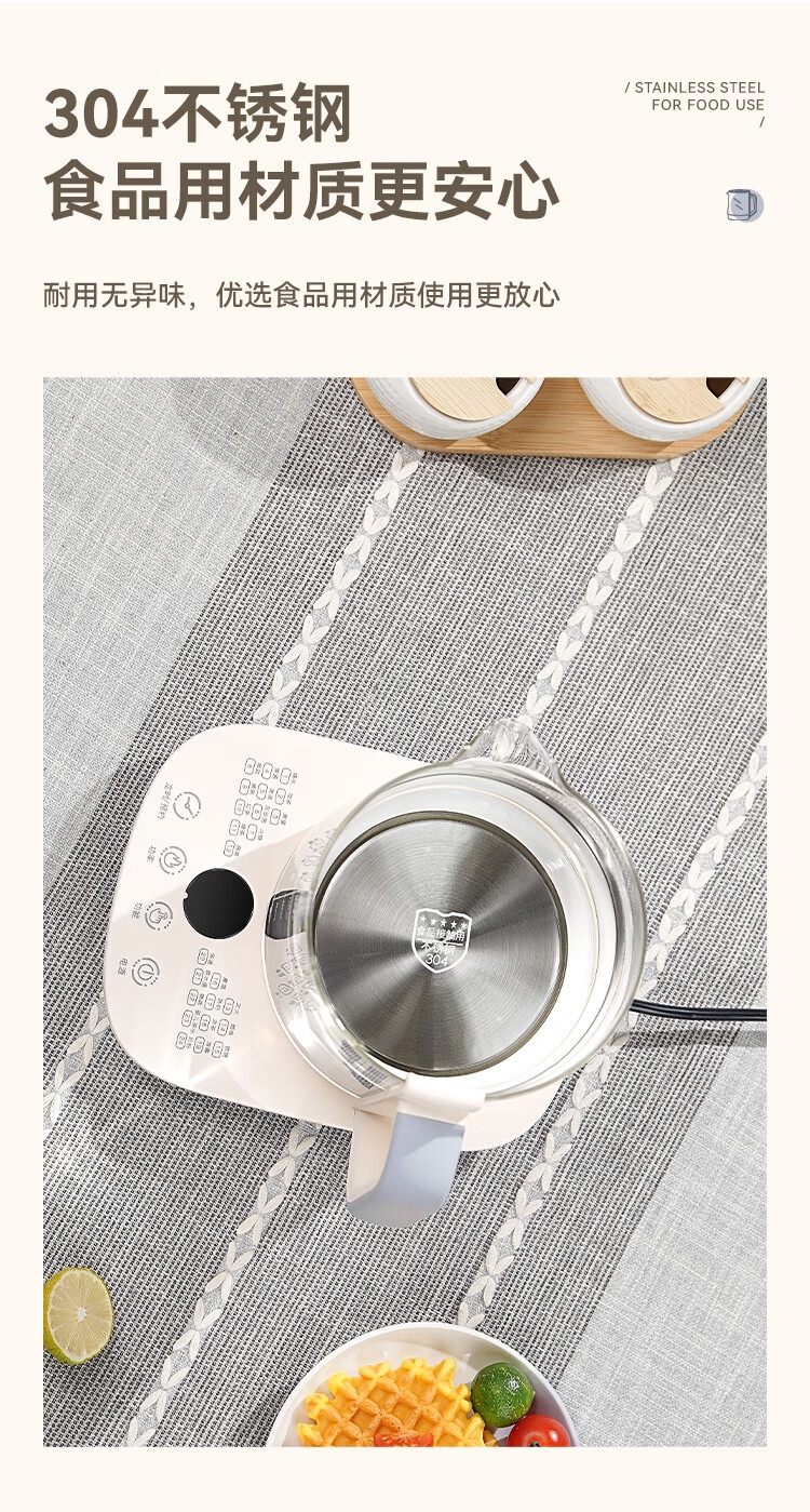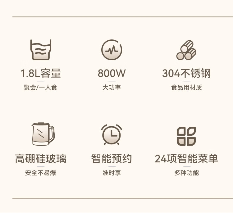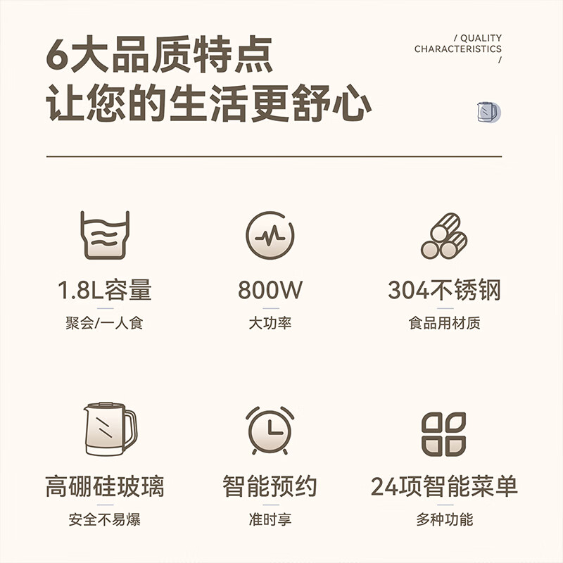 800W速热,环形聚能加热,15min悠享热水;触控面板搭配多功能菜单,养生美味一触即享;智能预约,长效保温,多段功率调节