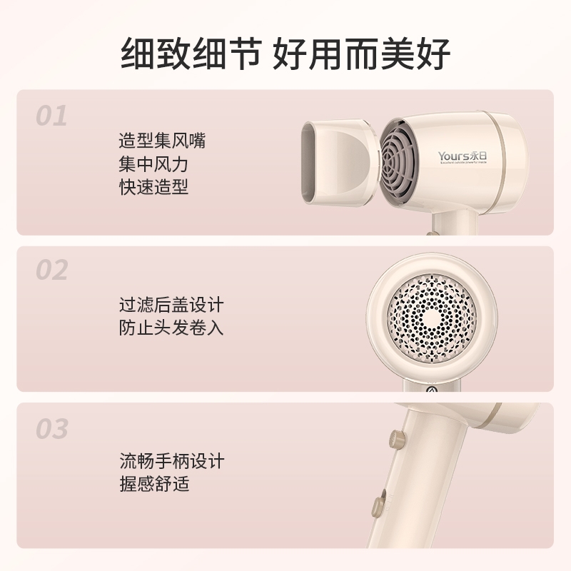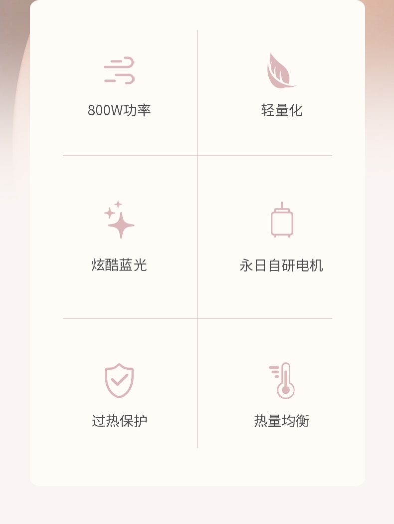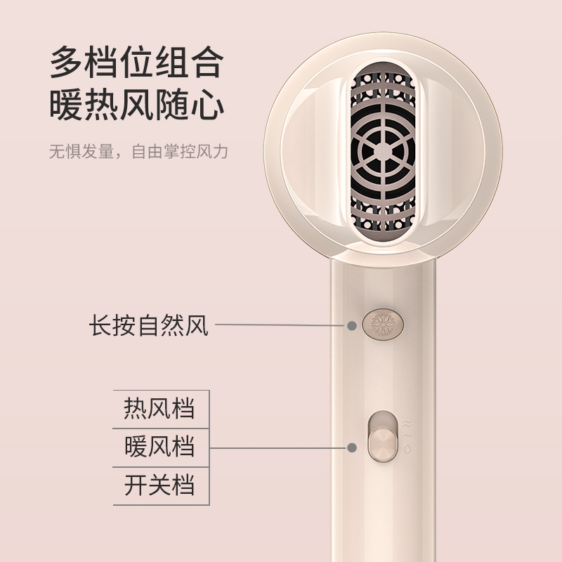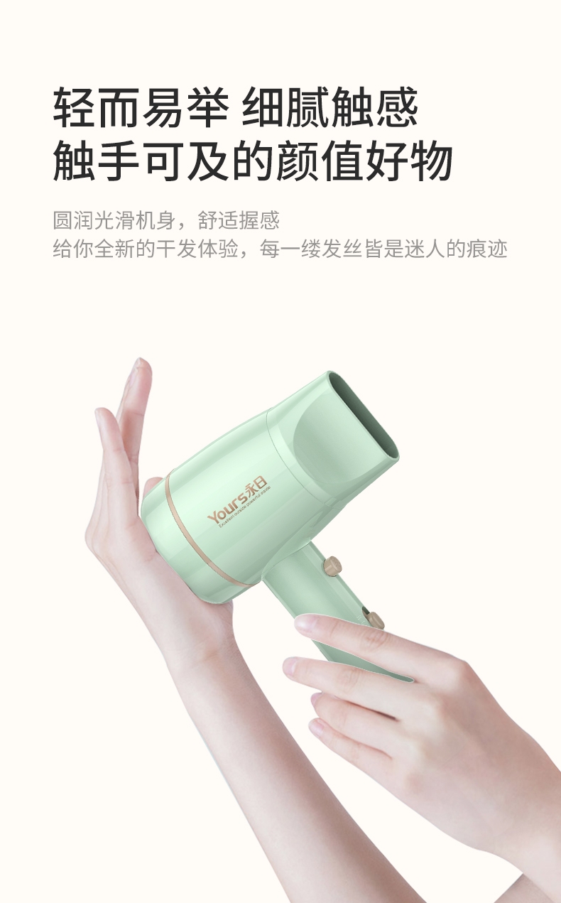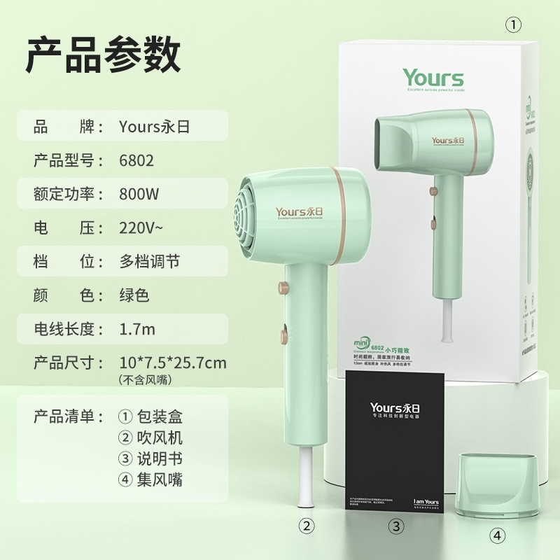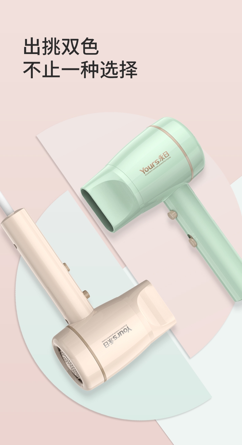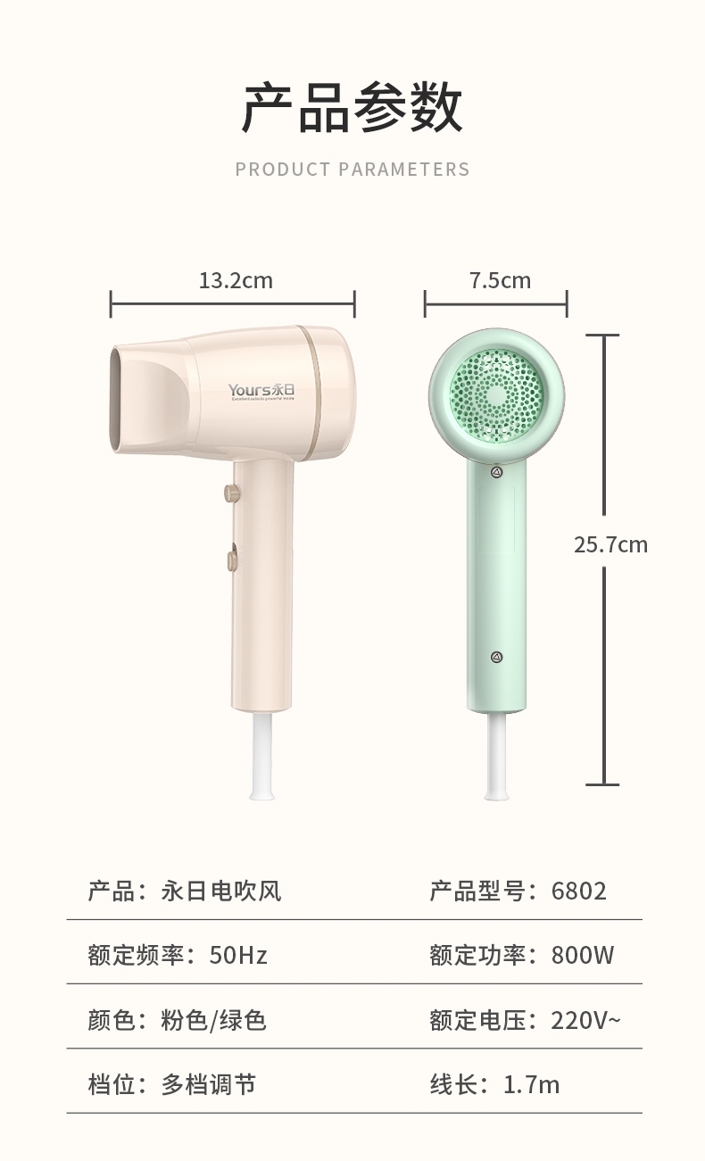 炫酷蓝光设计+樱花粉/抹茶绿(双色可选);;小巧便携,小功率宿舍不跳闸;;仿生涡轮式进风网,防止头发卷入;;外盒热塑膜保护+可拆卸风嘴;;按CCC强制性制造,防过热保护。