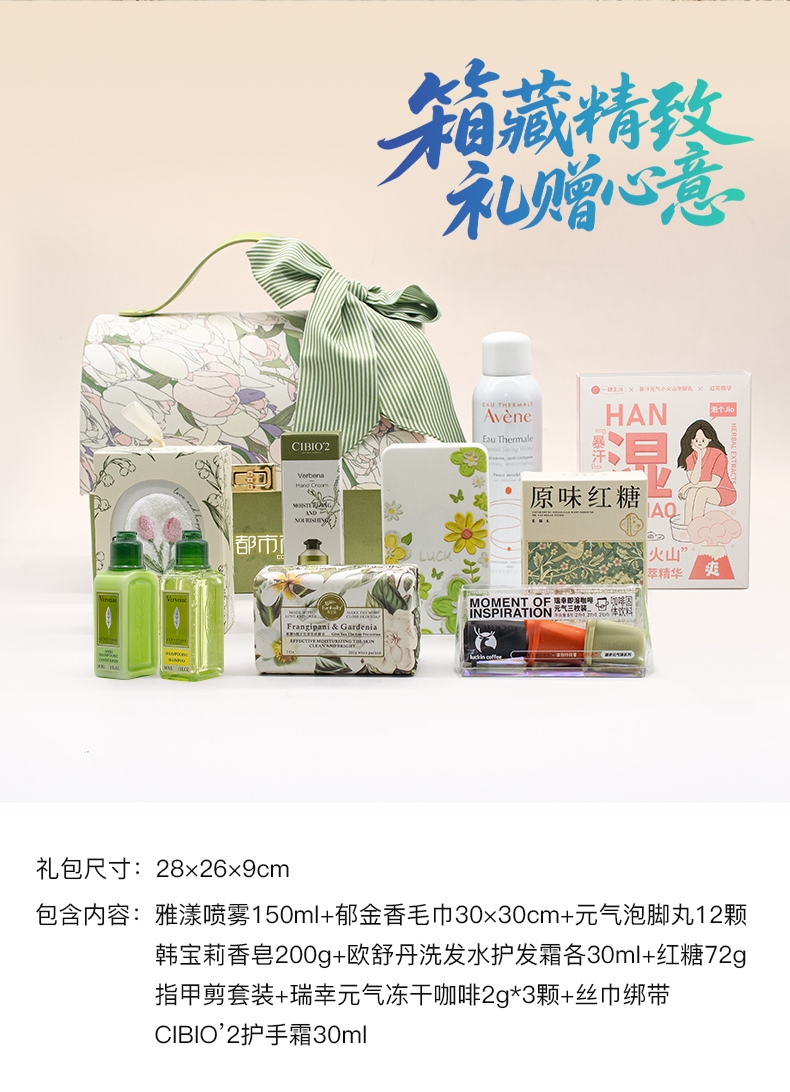 配置清单:雅漾喷雾150ml+瑞幸元气冻干咖啡2g*3颗+元气泡脚丸12颗+原味红糖72g+指甲剪套装+郁金香毛巾30*30cm+欧舒丹洗发水护发素各30ml+CIBIO2护手霜35ml+韩宝莉香皂200g+丝巾绑带(颜色随机)
