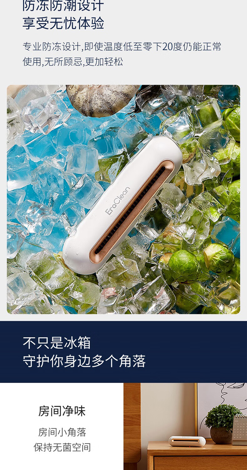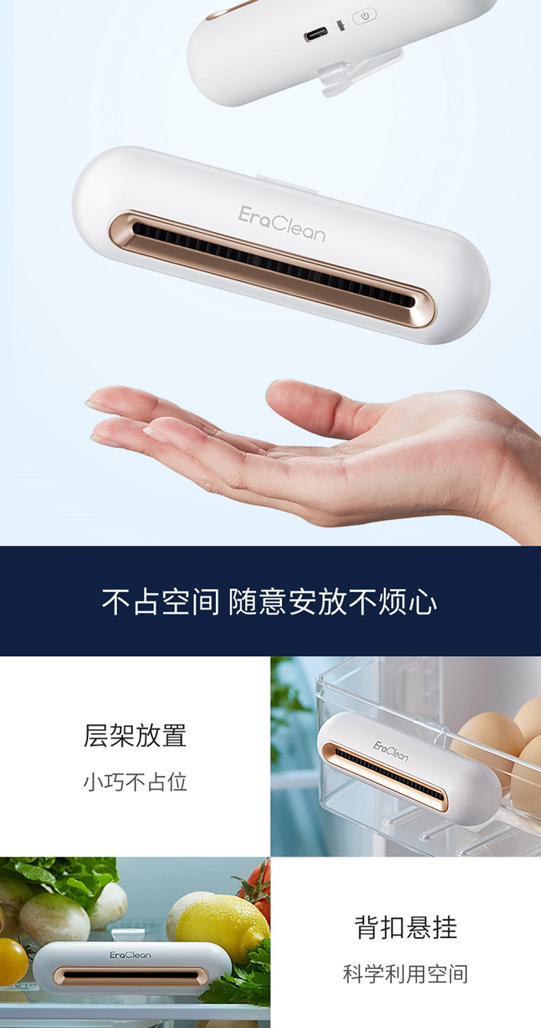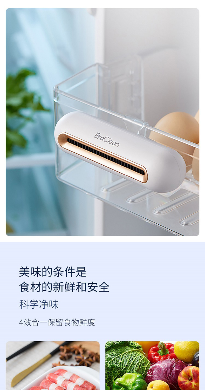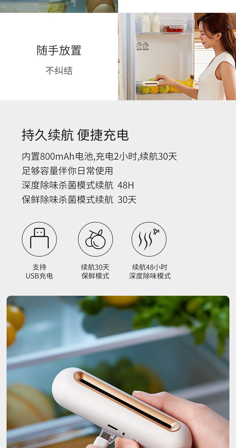 •活性氧净化冰箱异味;;•杀菌率大于99.9%;;•去除农残;•果蔬长效保鲜;;•内置聚合物锂电池,安全超长续航;•Type-C接口支持USB充电