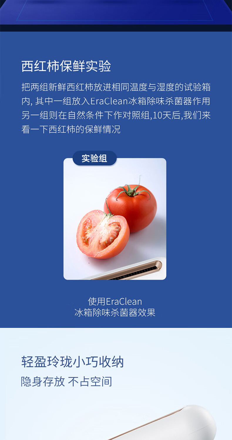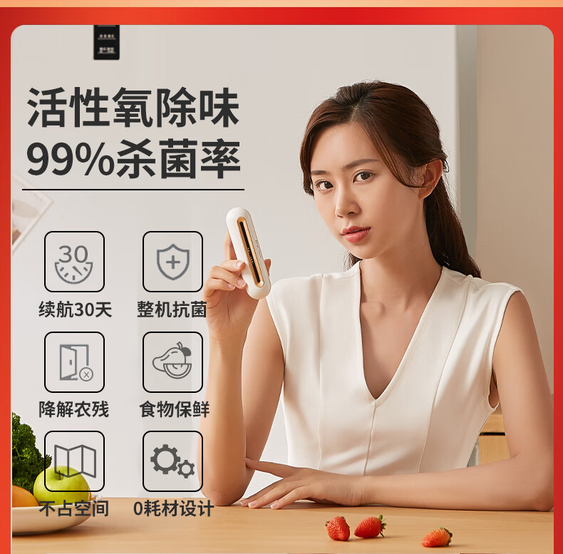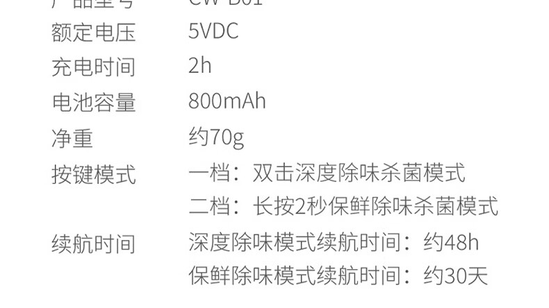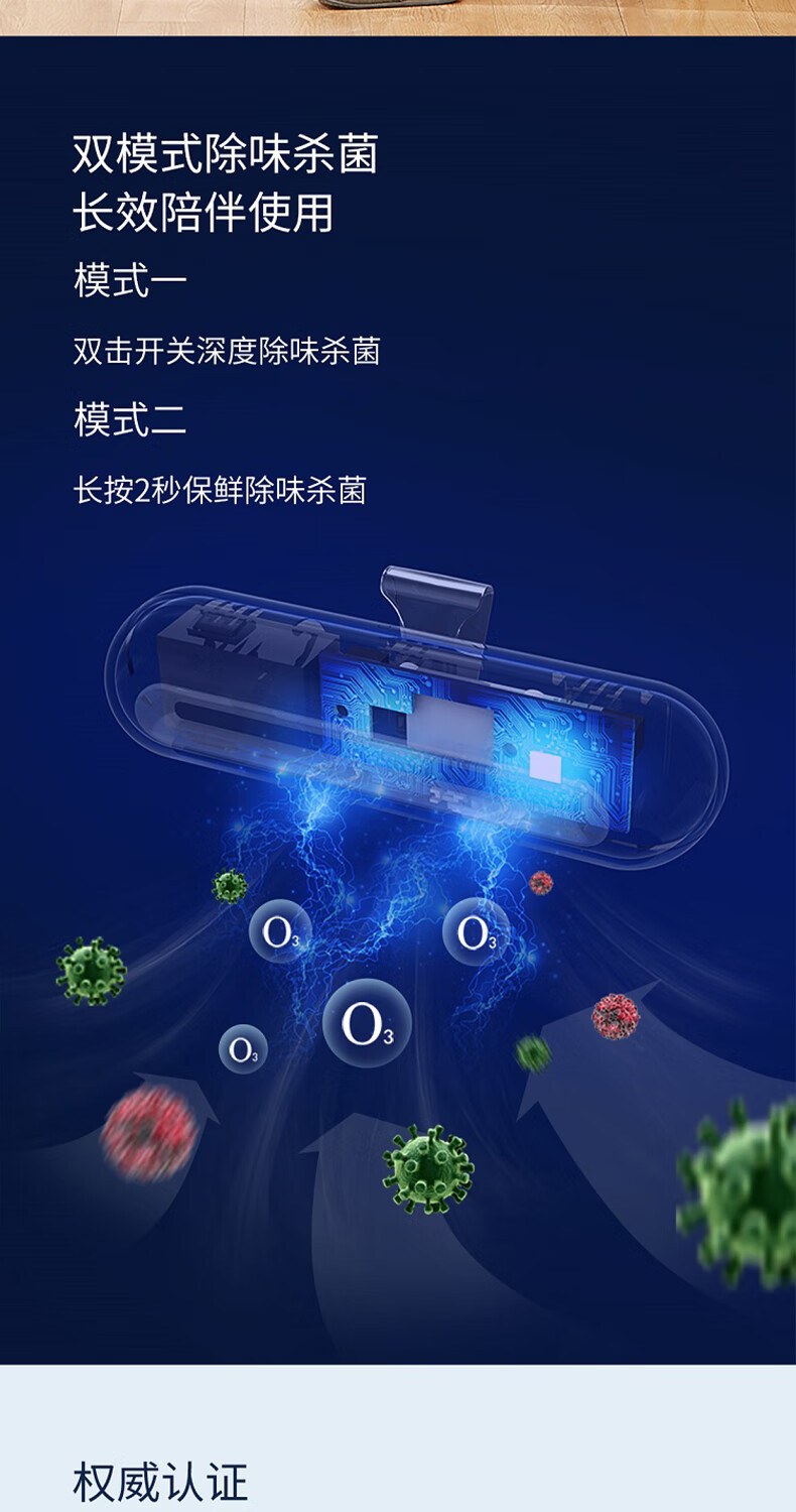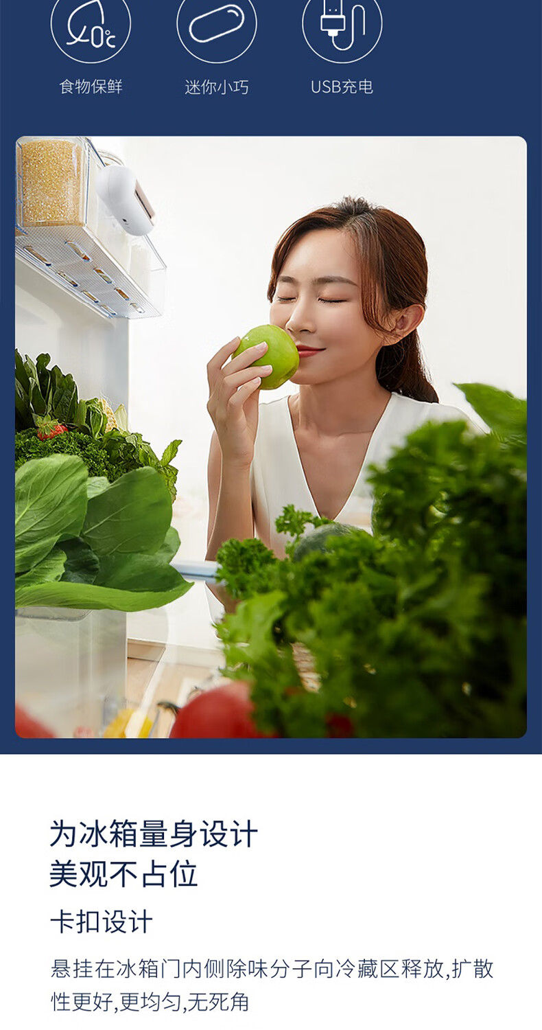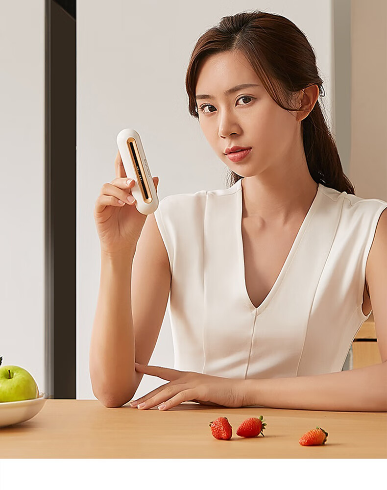 •活性氧净化冰箱异味;;•杀菌率大于99.9%;;•去除农残;•果蔬长效保鲜;;•内置聚合物锂电池,安全超长续航;•Type-C接口支持USB充电