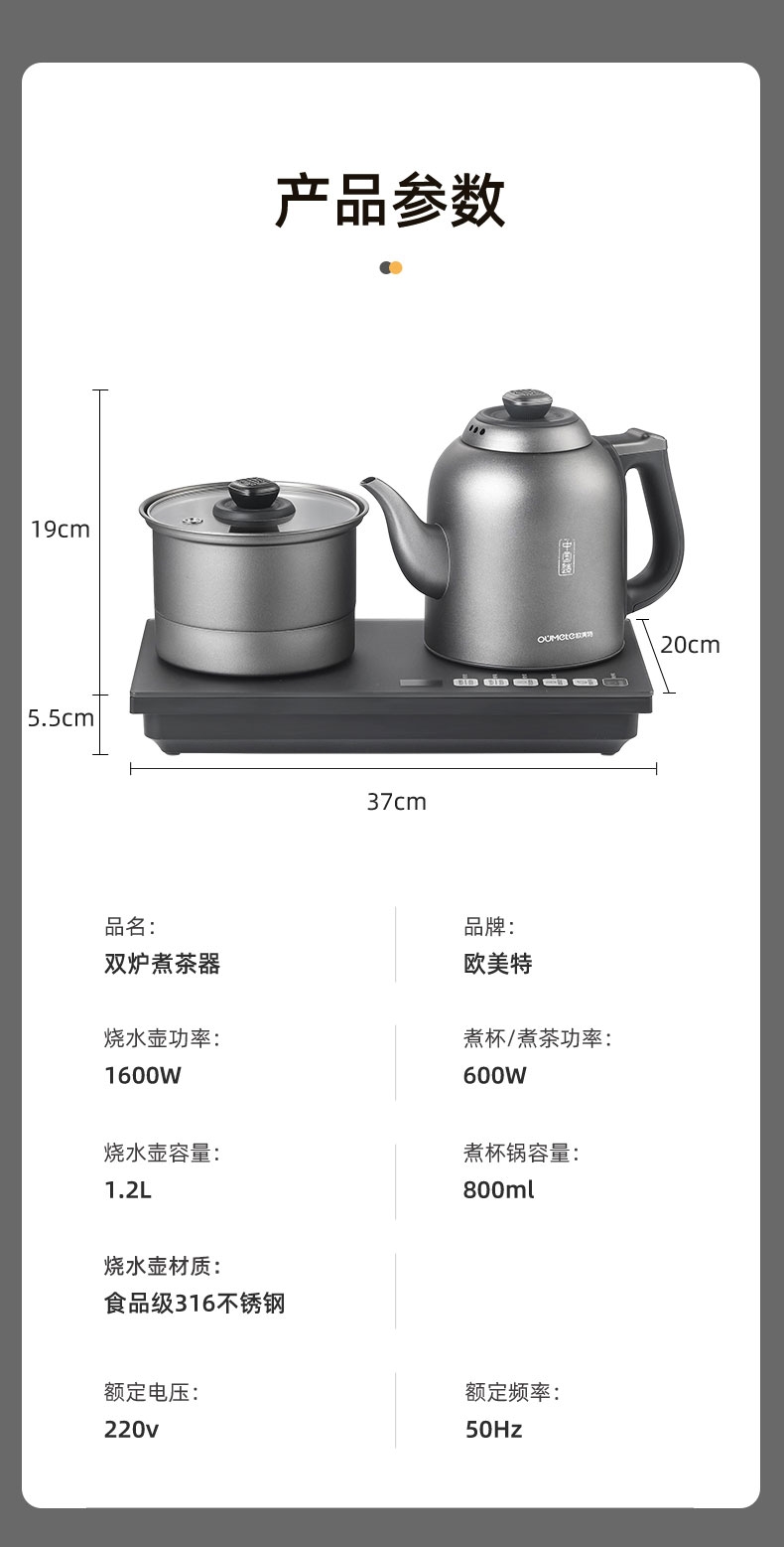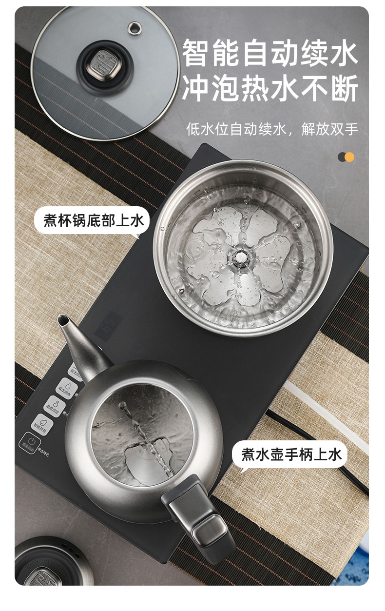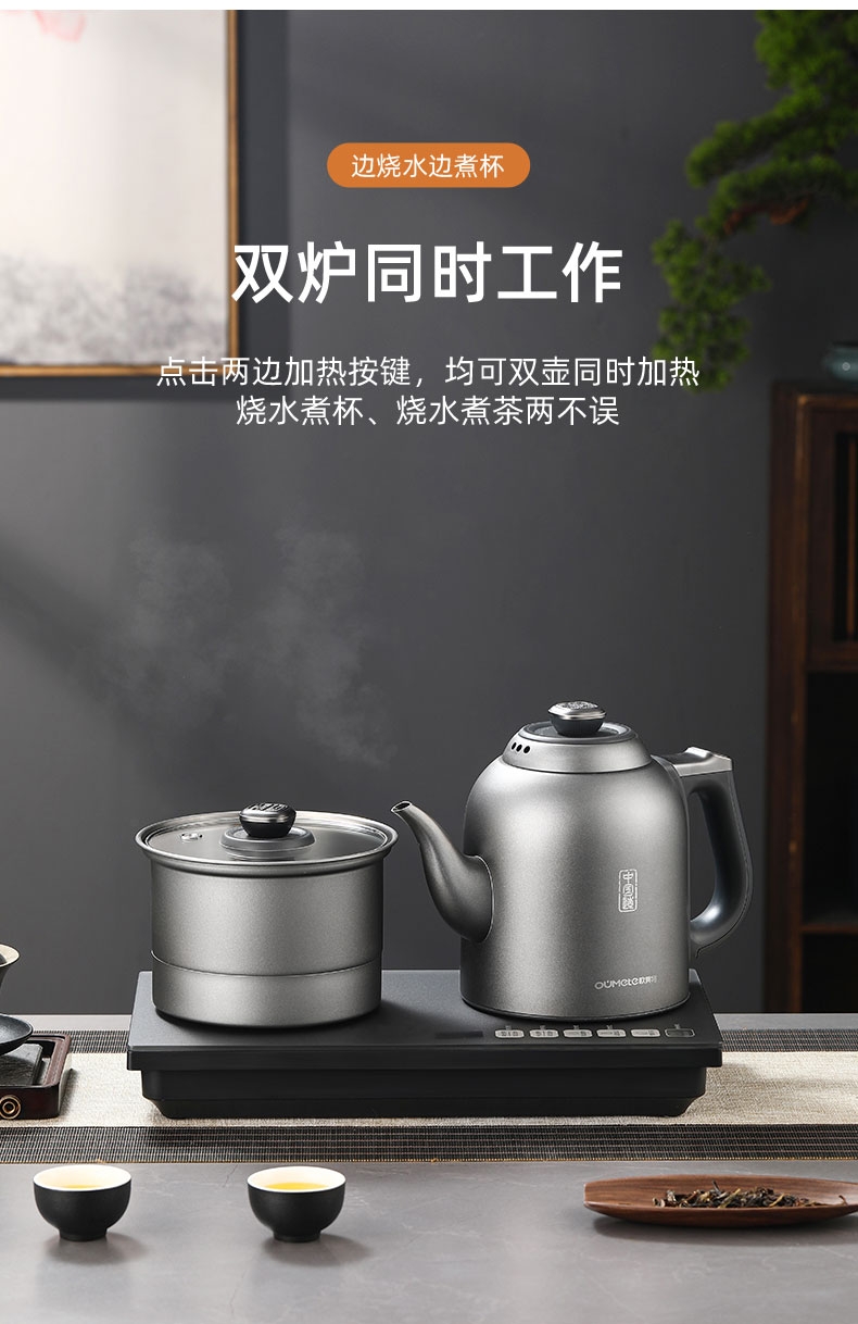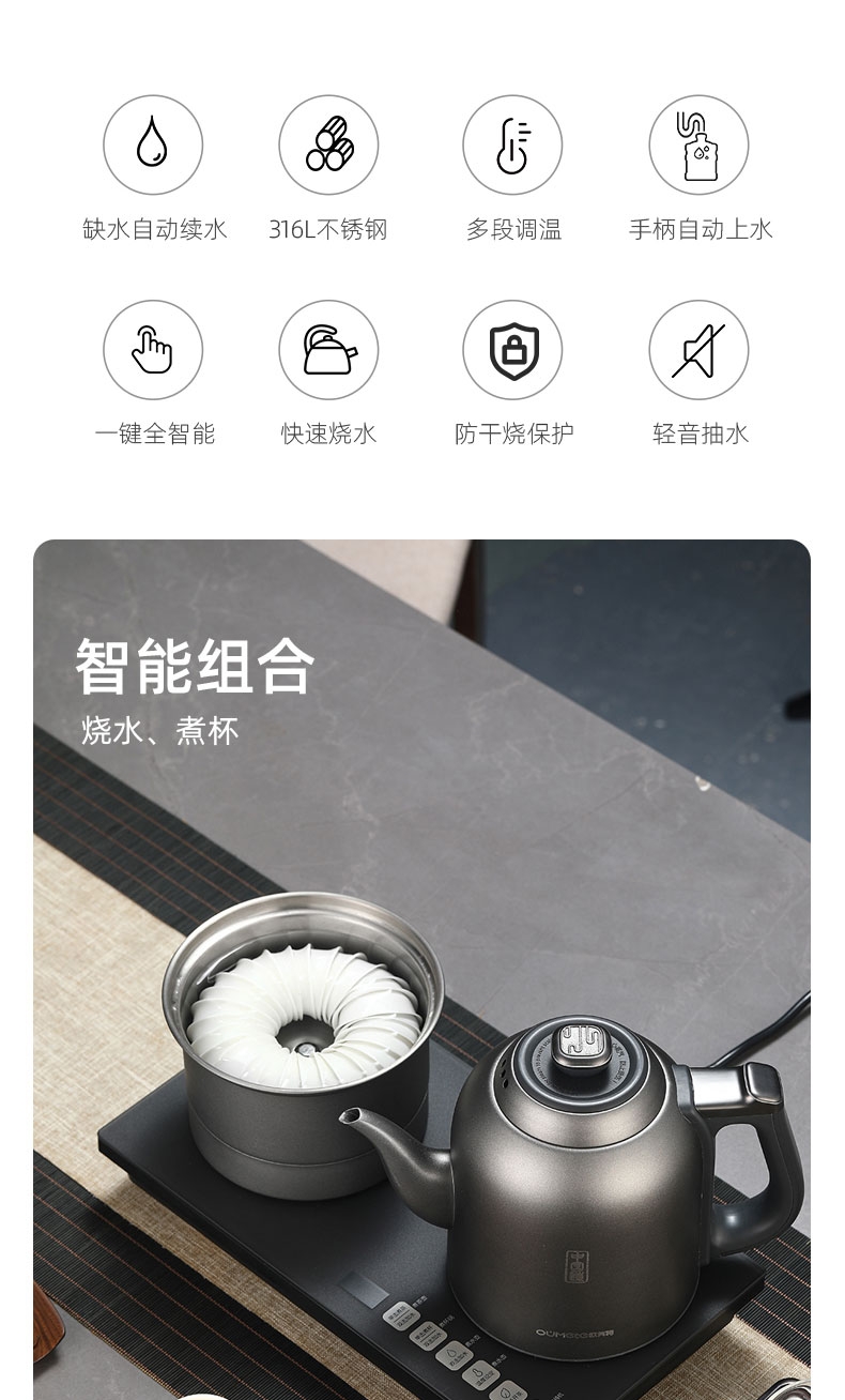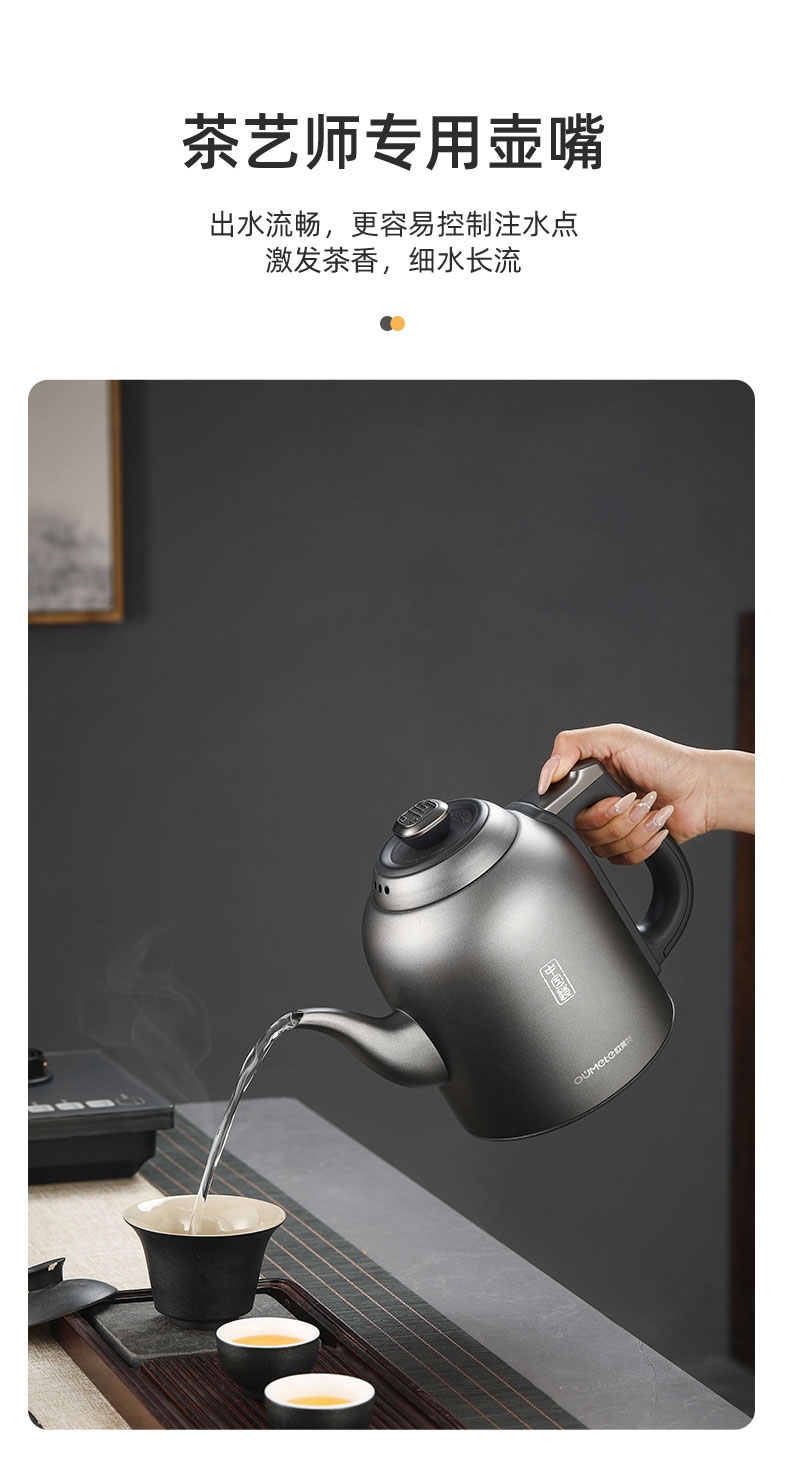 316L烧水壶 烧水壶为316L不锈钢,使用更放心;宽体设计烧水壶正常使用不碰撞煮杯锅;智能煮茶模式智能开茶模式,更符合使用体验