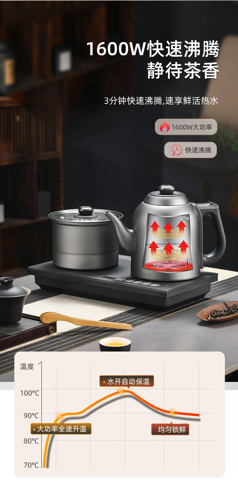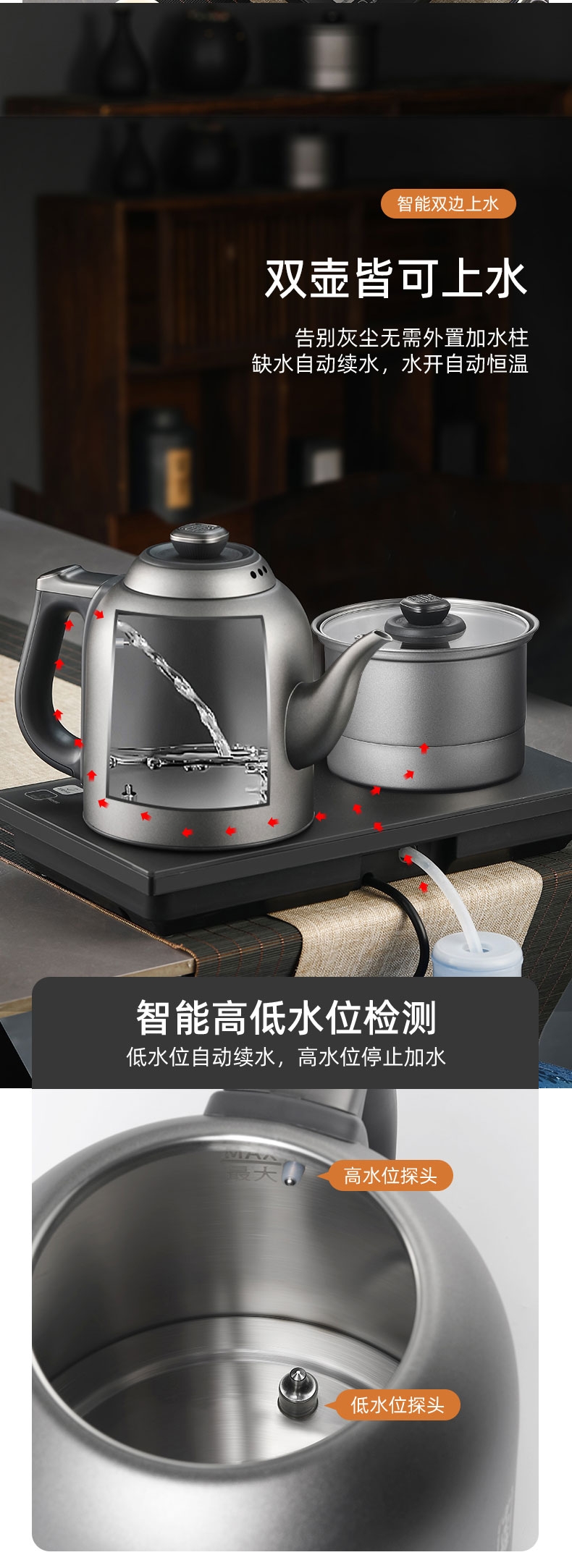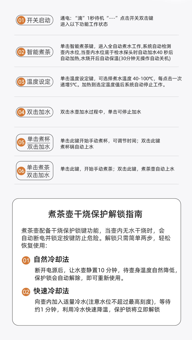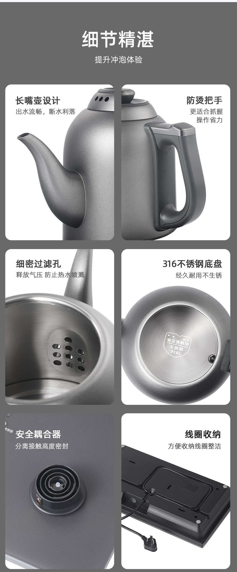 316L烧水壶 烧水壶为316L不锈钢,使用更放心;宽体设计烧水壶正常使用不碰撞煮杯锅;智能煮茶模式智能开茶模式,更符合使用体验