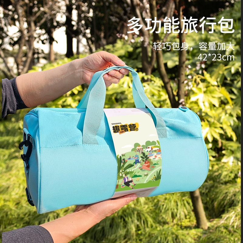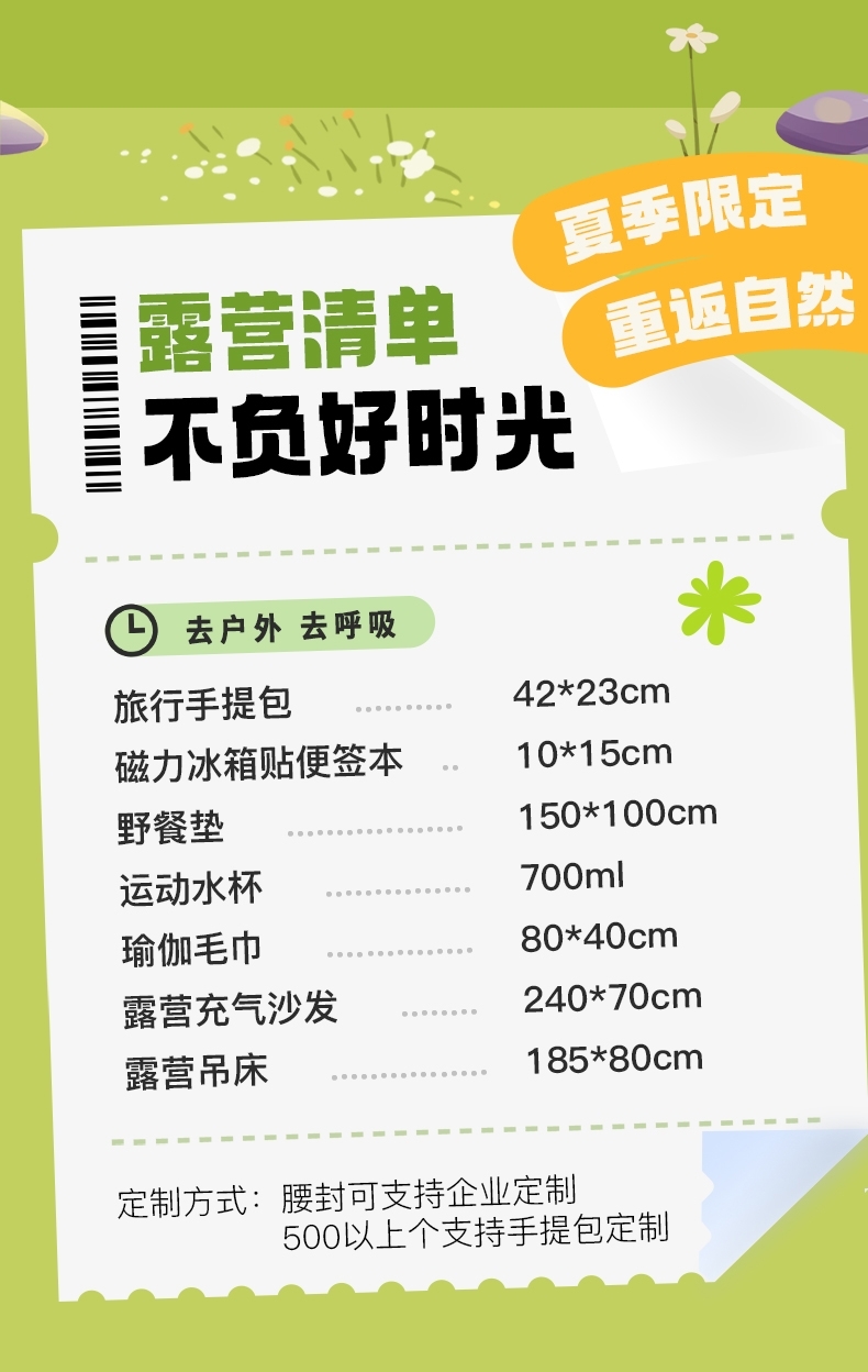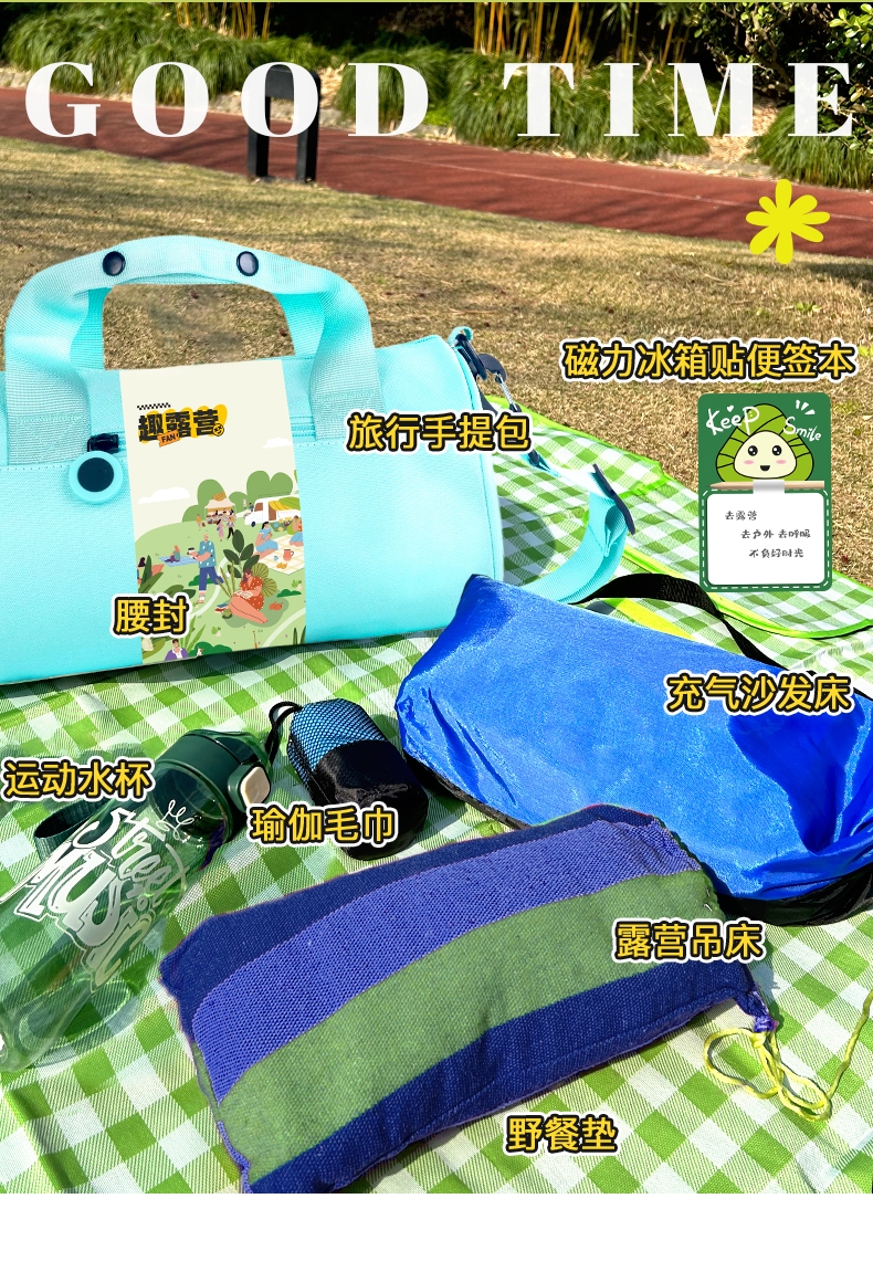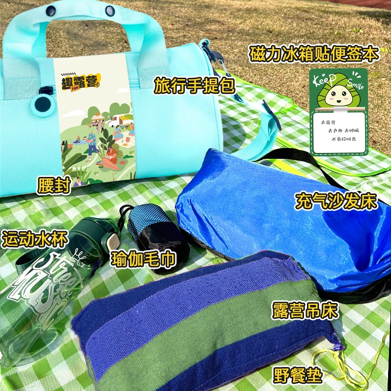 配置清单:旅行手提包42*23cm+磁力冰箱贴便签本10*15cm+野餐垫150*100cm+运动水杯700ml+瑜伽毛巾80*40cm+露营充气沙发240*70cm+露营吊床185*80cm