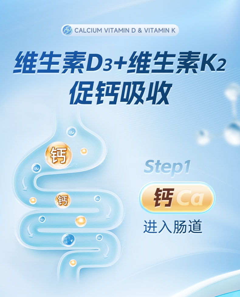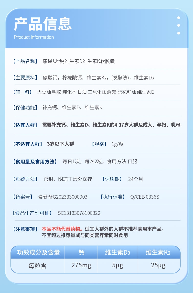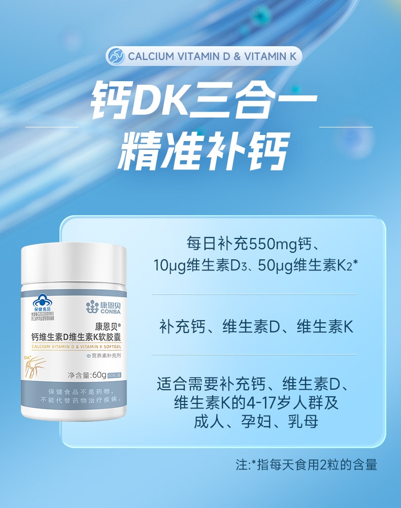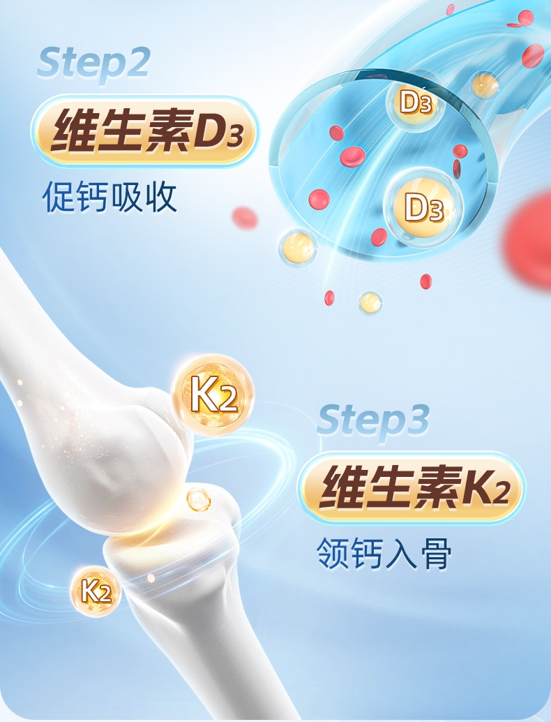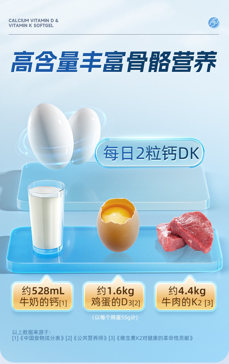 三效合一 补钙闭环 精准助力骨骼健康;补充钙、维生素D、维生素K;每日1次,每次2粒,食用方法:口服