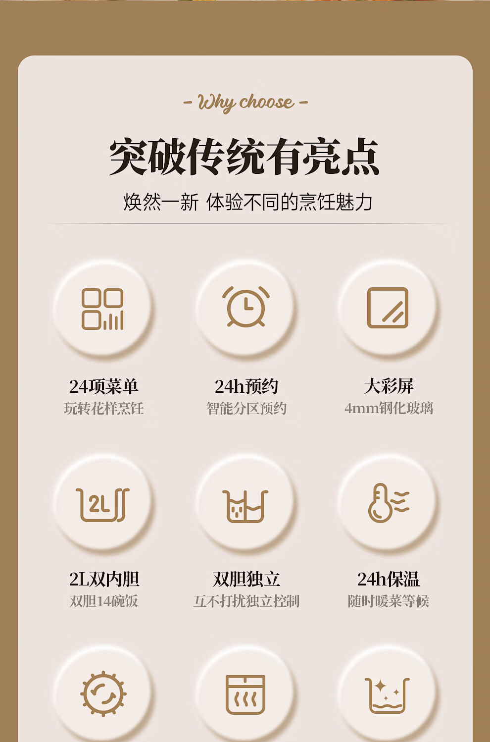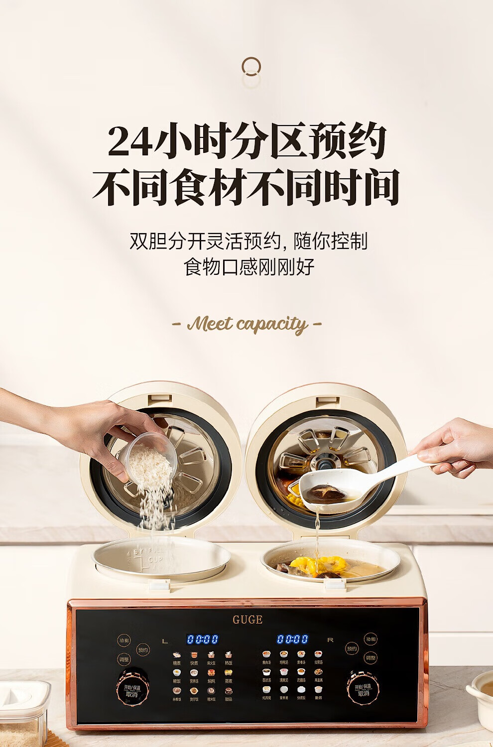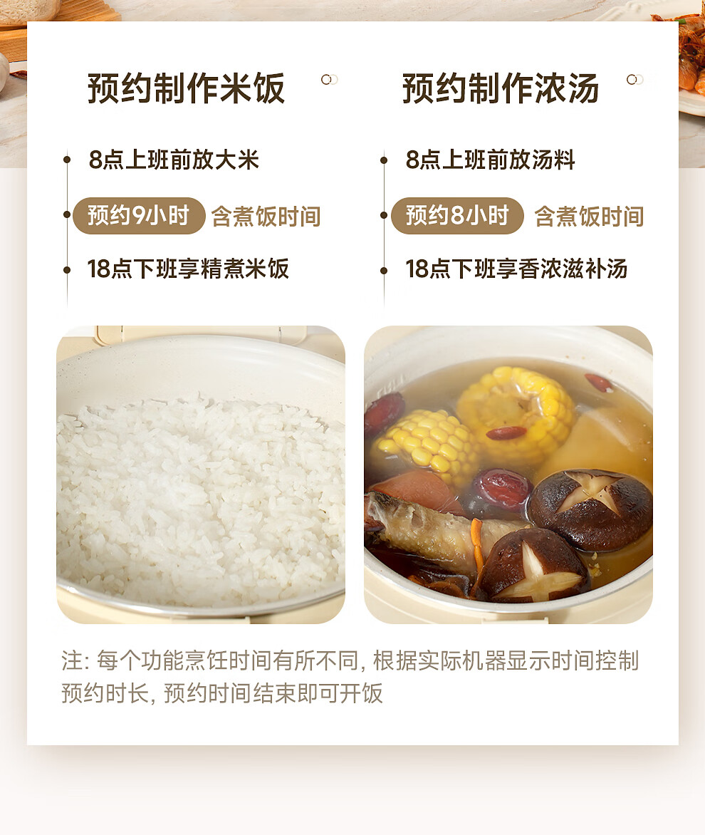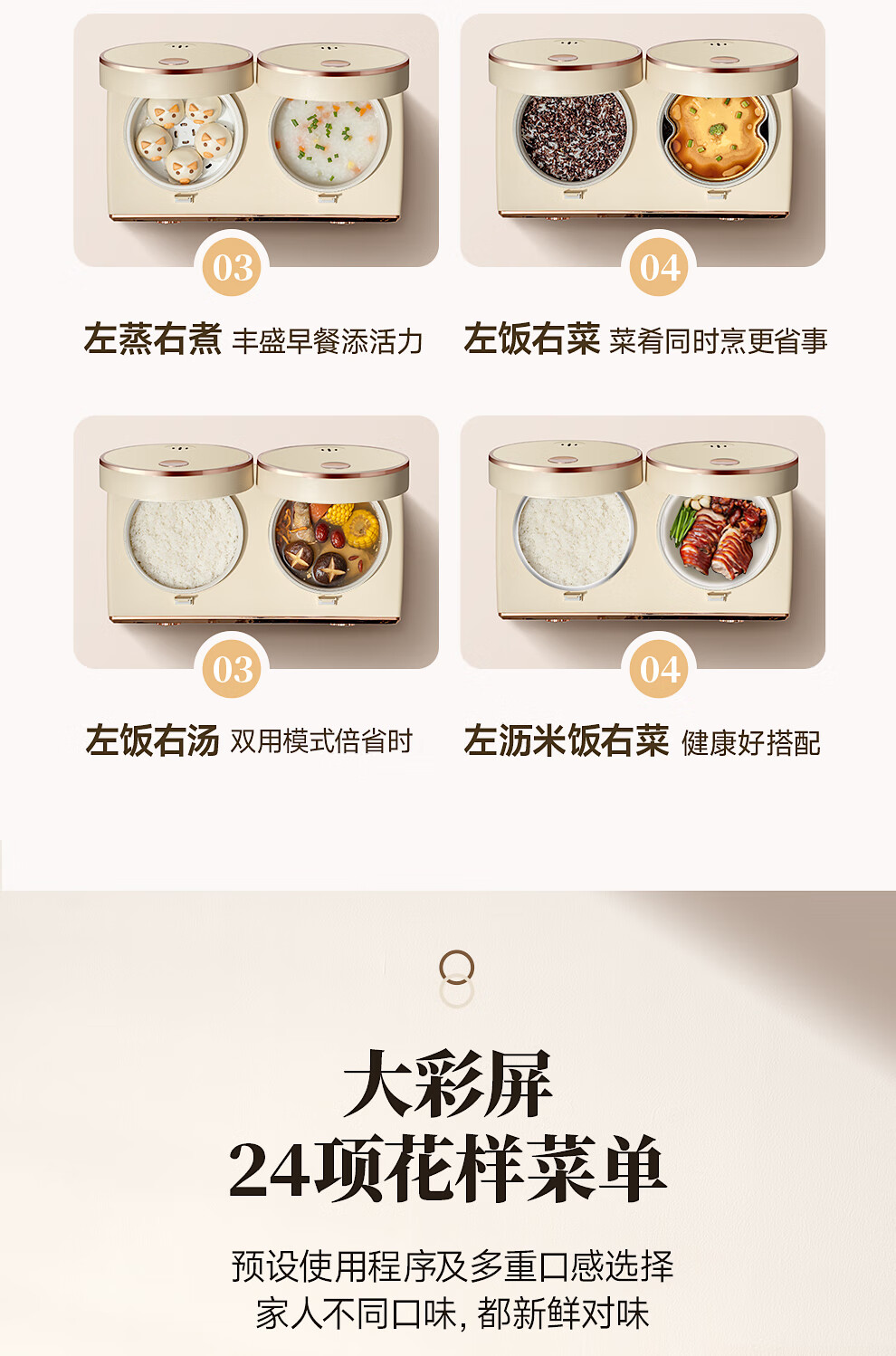 双胆分控,米饭、鲜汤同时享。;无极旋钮调时,24小时分区预约,自动保温;米汤分离,低糖健康饭更养生