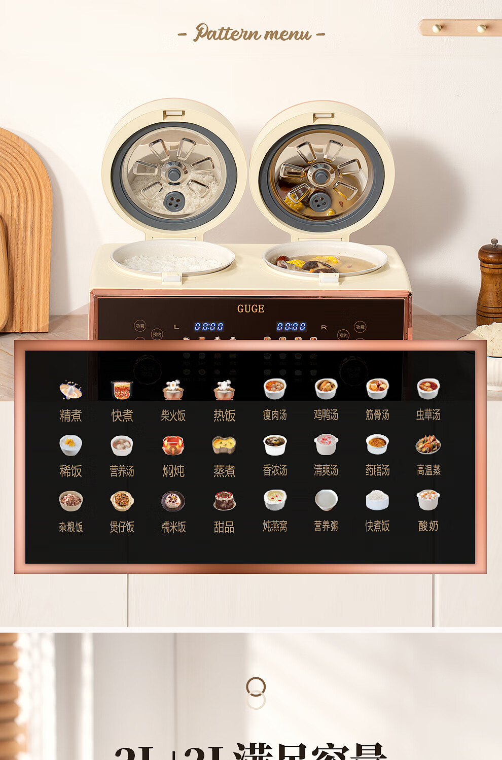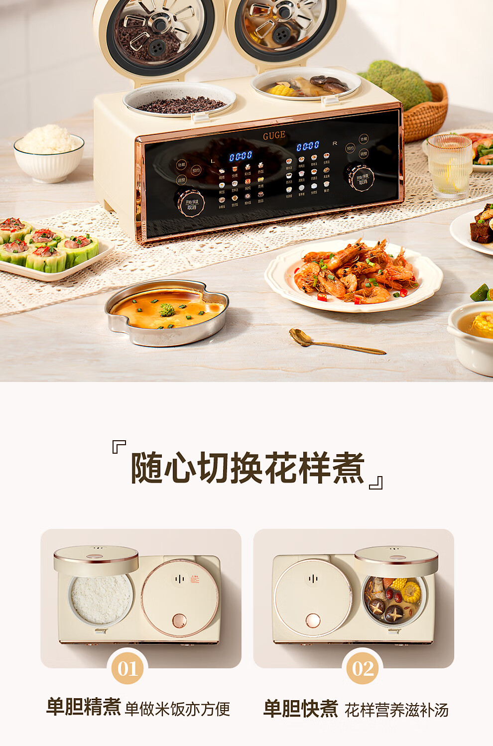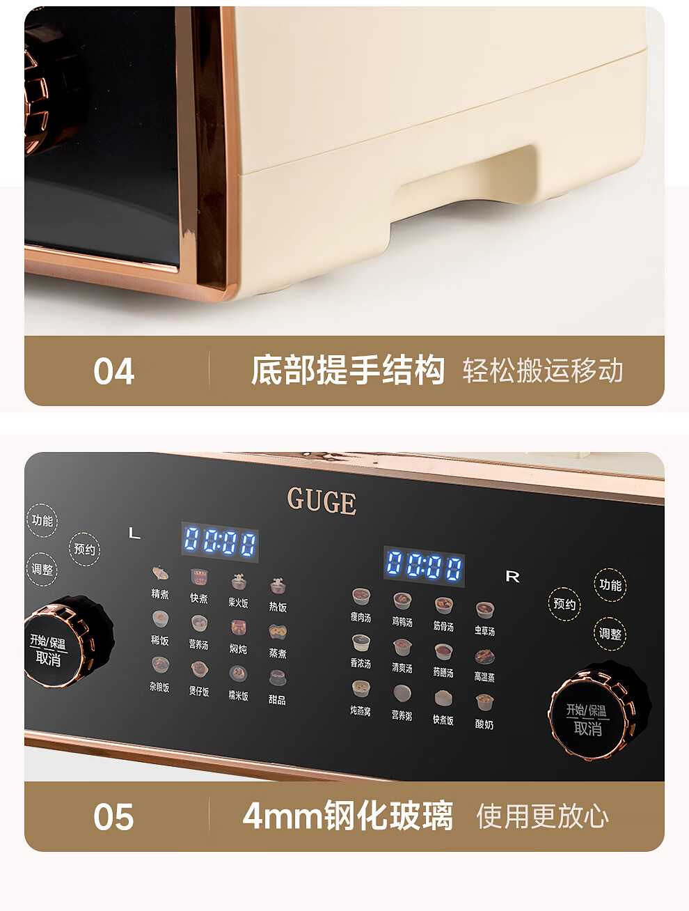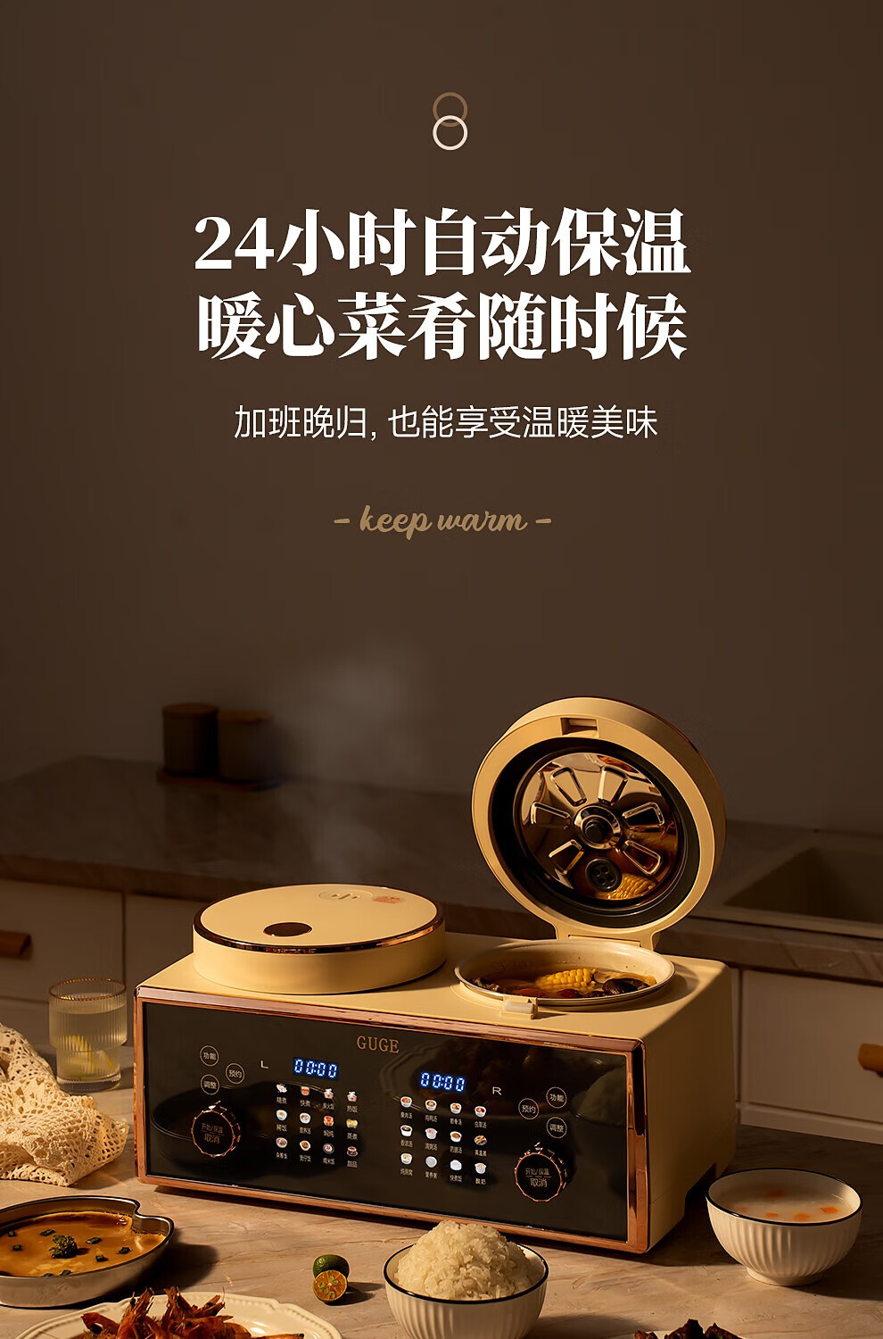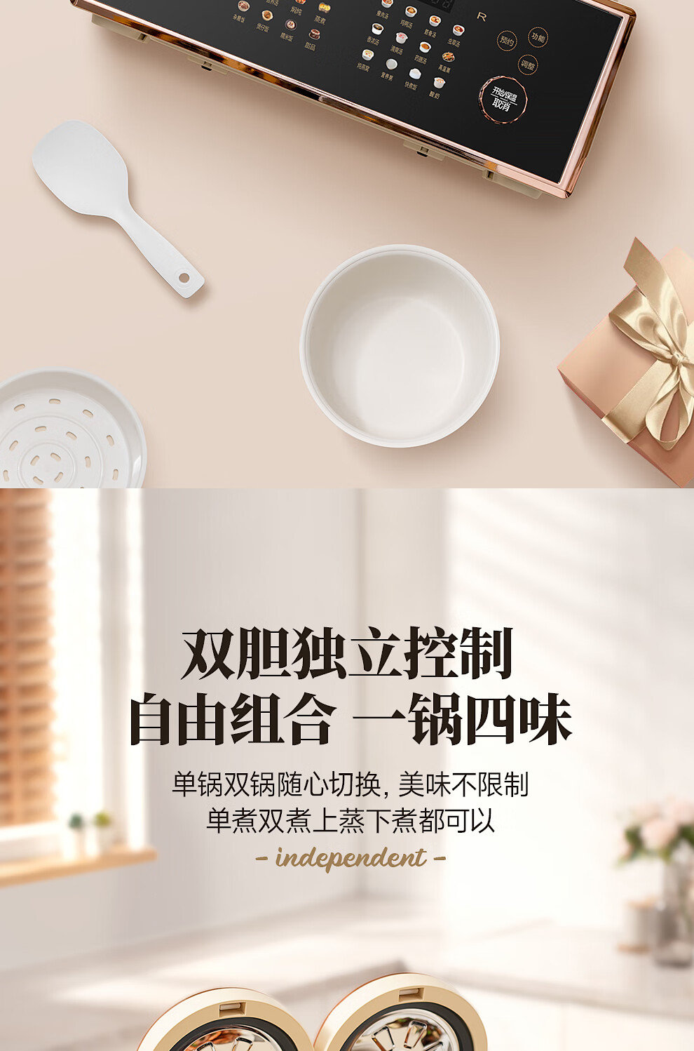 双胆分控,米饭、鲜汤同时享。;无极旋钮调时,24小时分区预约,自动保温;米汤分离,低糖健康饭更养生