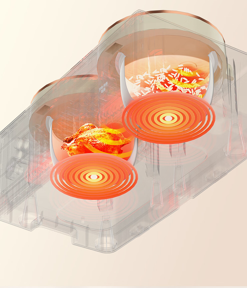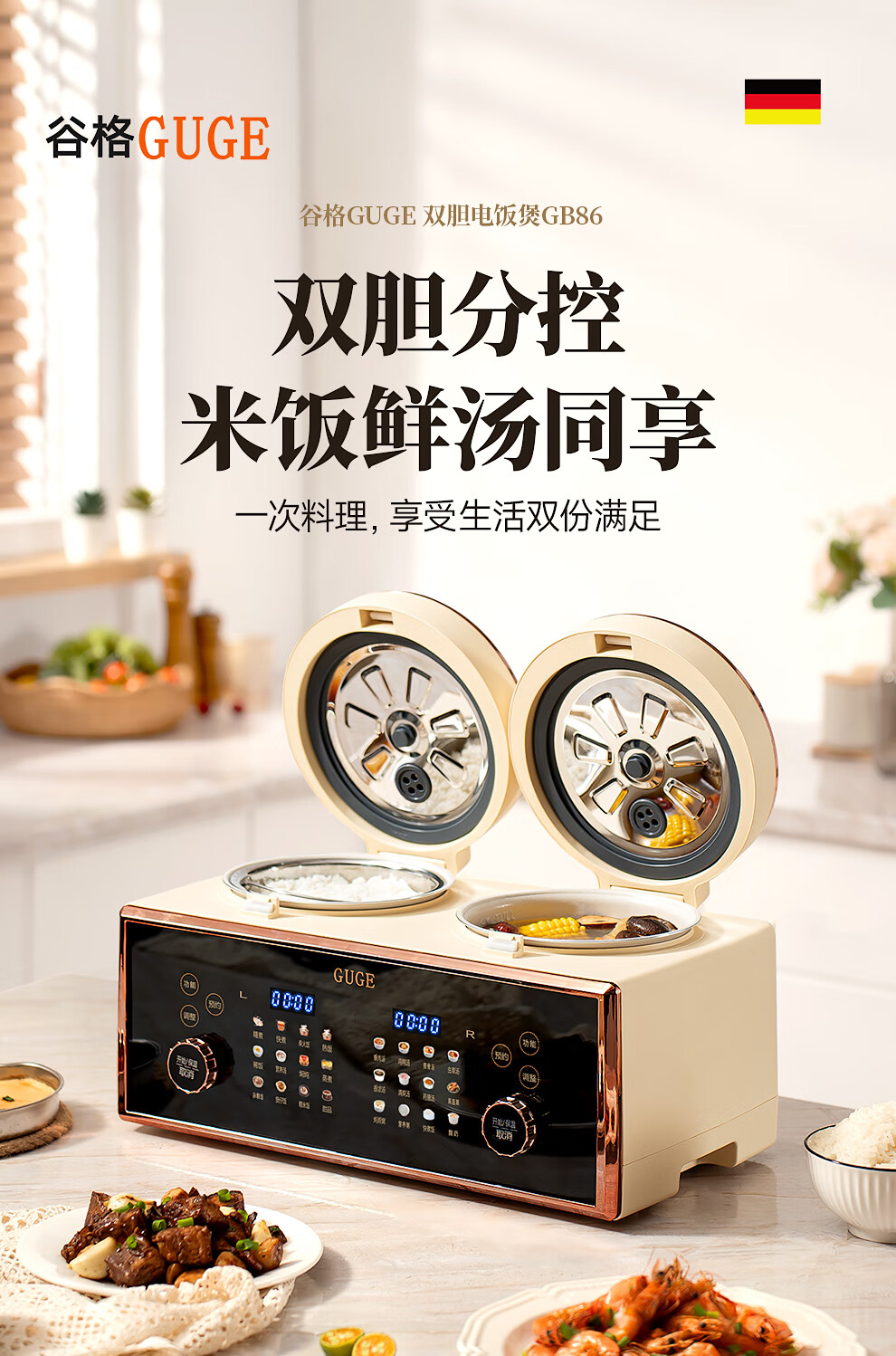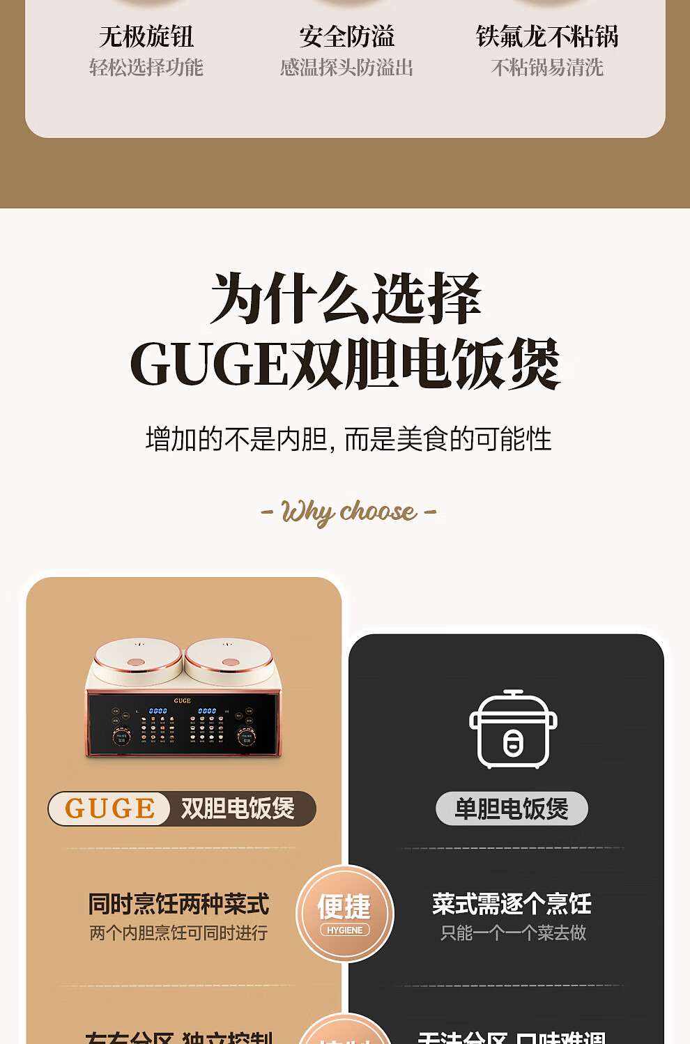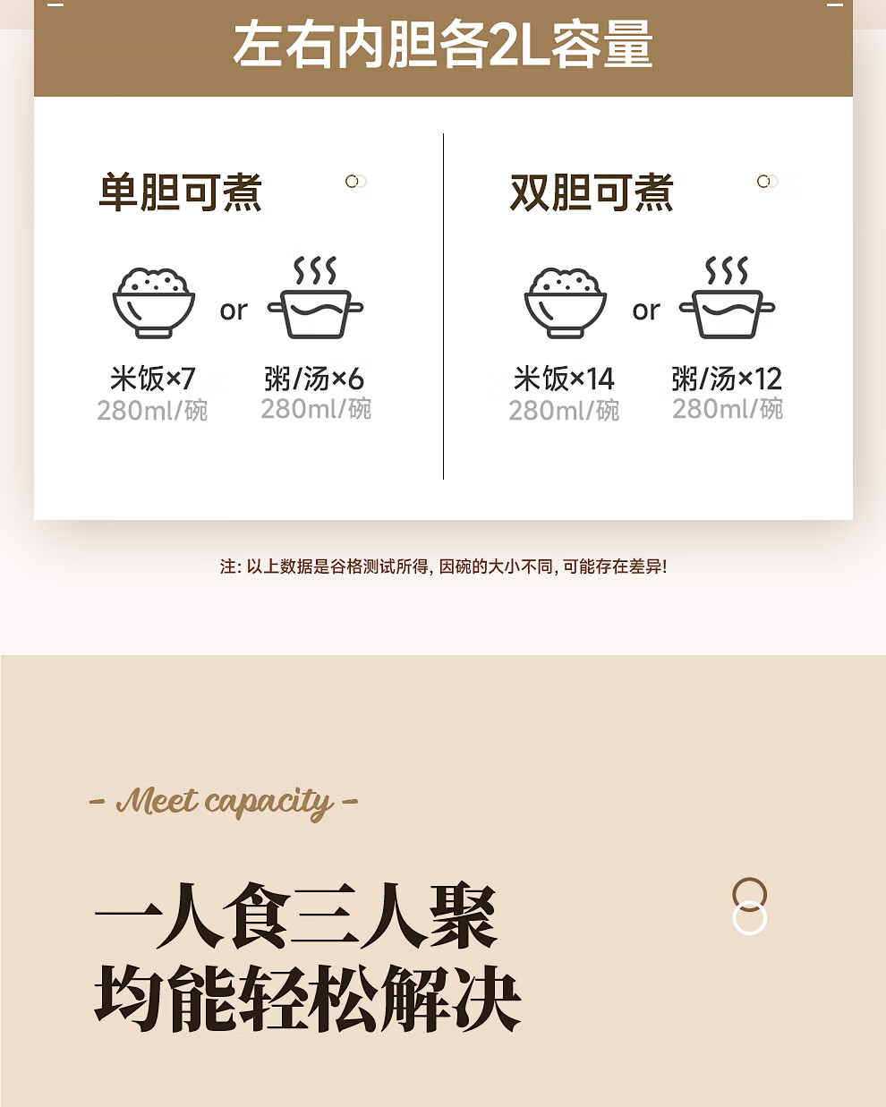 双胆分控,米饭、鲜汤同时享。;无极旋钮调时,24小时分区预约,自动保温;米汤分离,低糖健康饭更养生