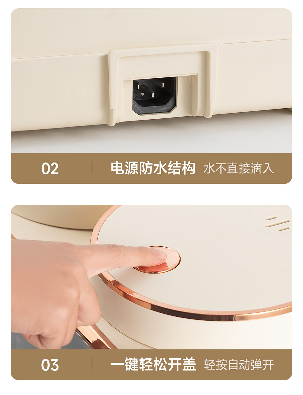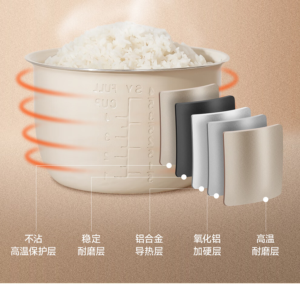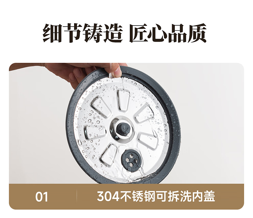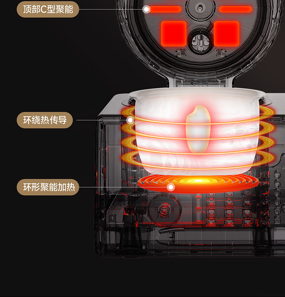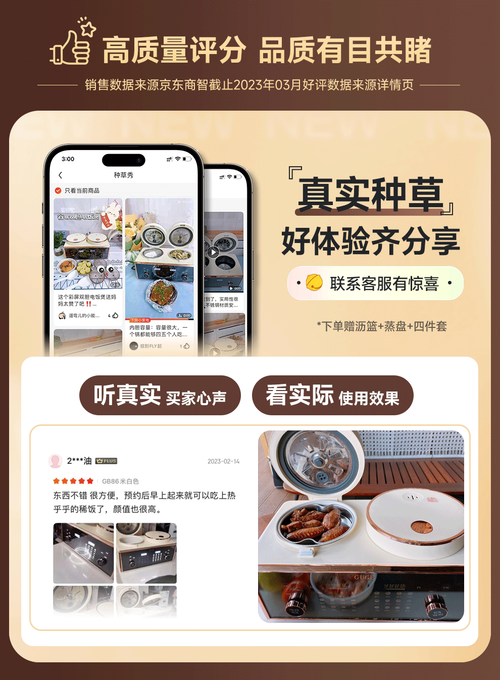 双胆分控,米饭、鲜汤同时享。;无极旋钮调时,24小时分区预约,自动保温;米汤分离,低糖健康饭更养生
