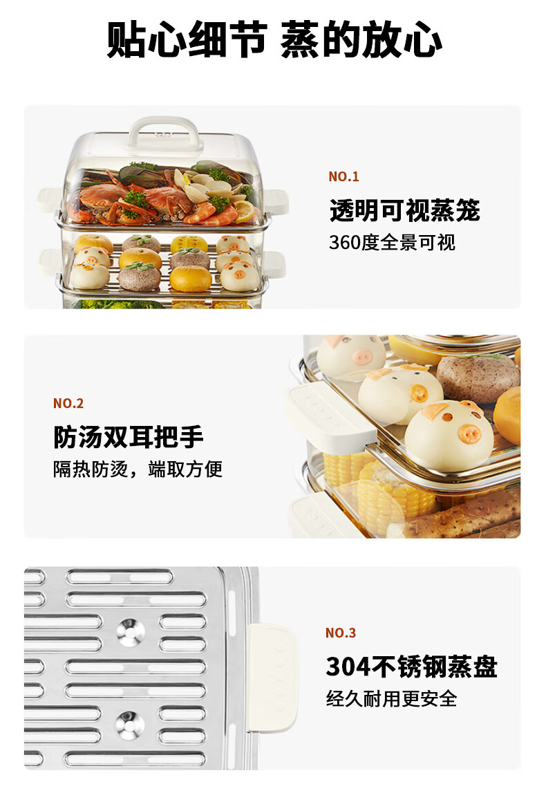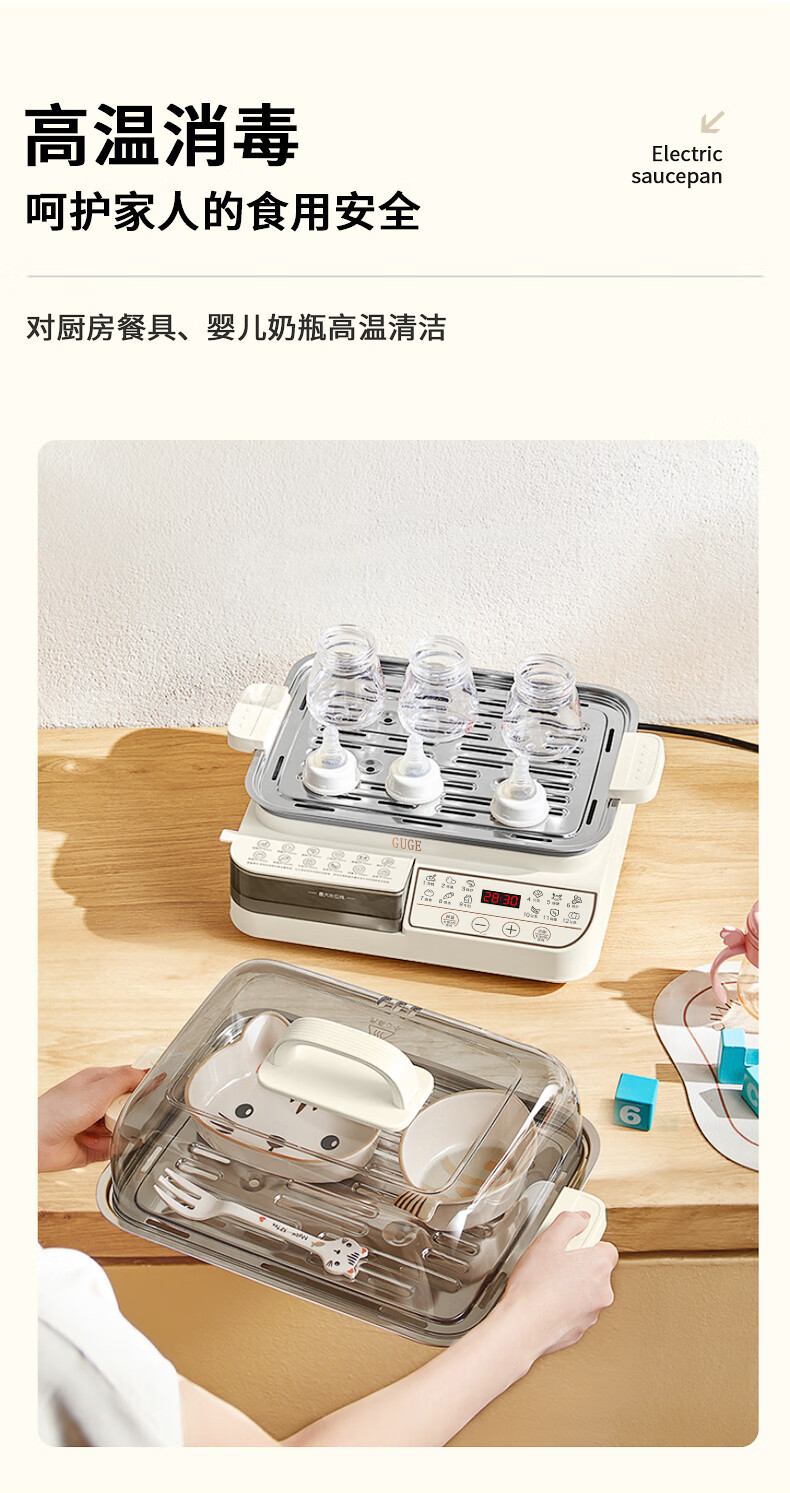 智能触控面板,鲜食一键触达。;高温消毒,呵护家人的食用安全。;外置水箱设计,中途加水免开盖。